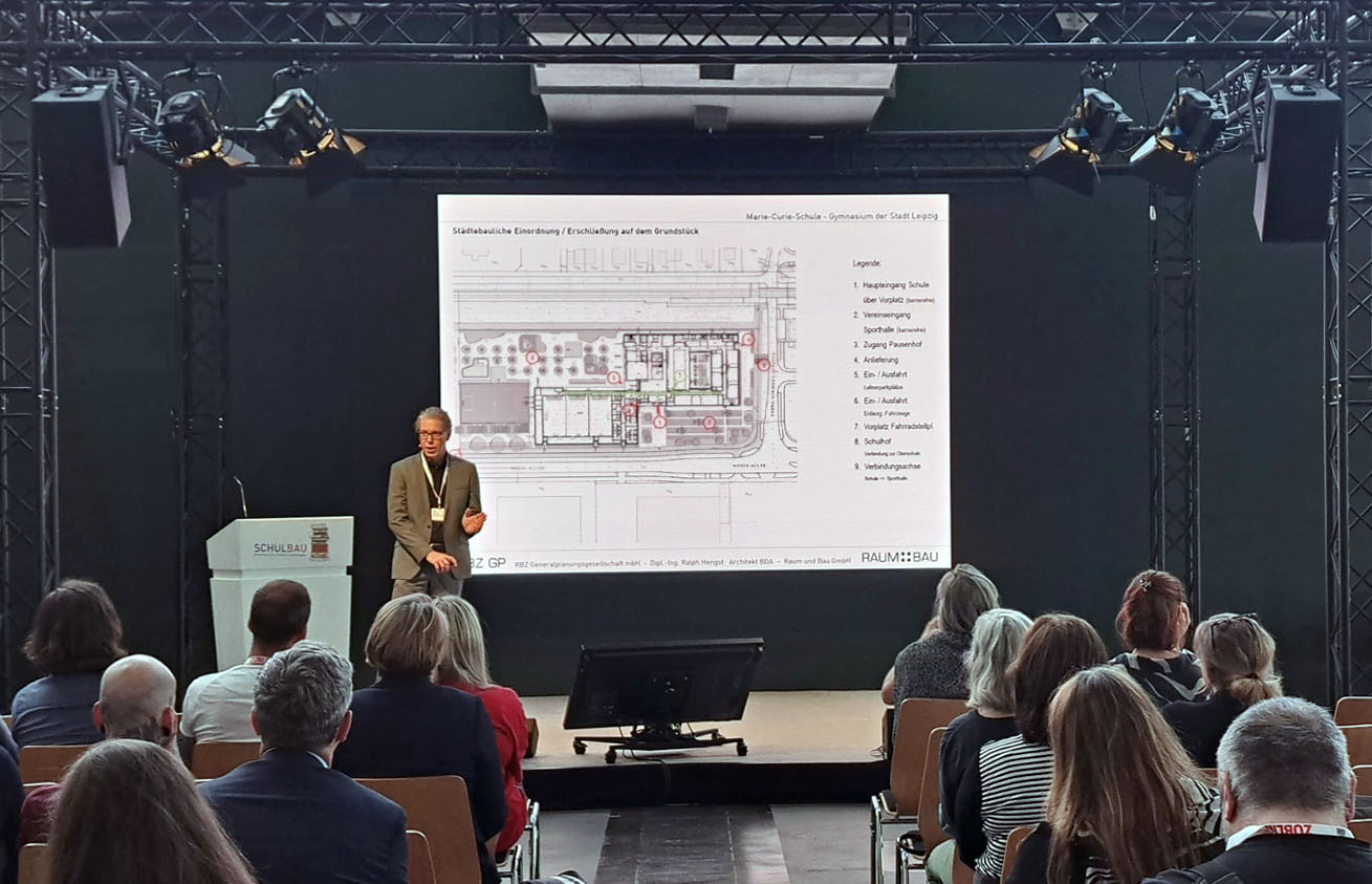 Ralph Hengst vom Architekturbüro Raum und Bau stellte auf der SCHULBAU Salon & Messe Leipzig 2025 als Teil des Fachprogramms den Neubau der Marie-Curie-Schule vor – ein sechszügiges Gymnasium mit Sporthalle auf dem Gelände eines ehemaligen Holzveredlungswerks.
