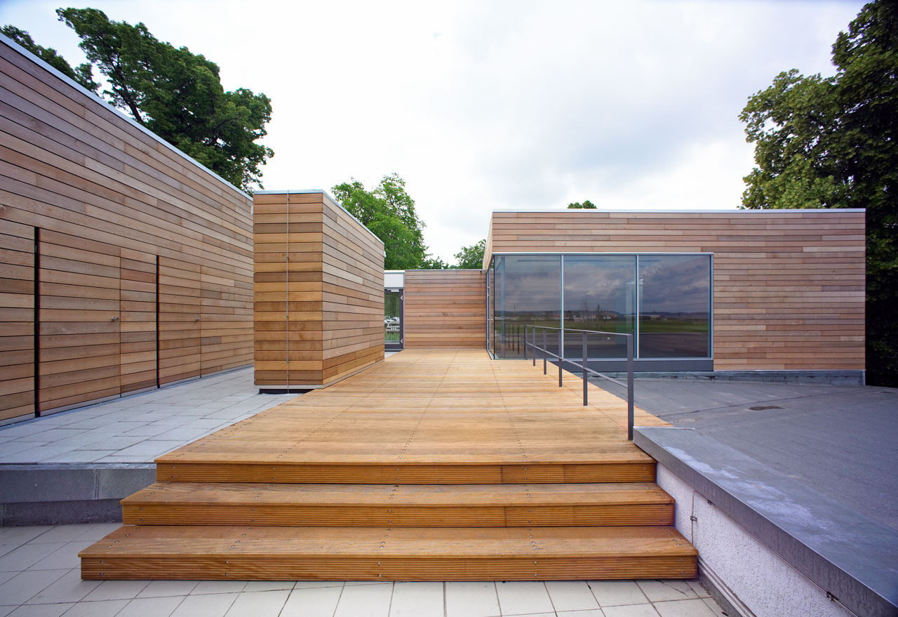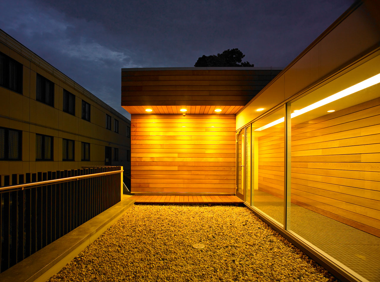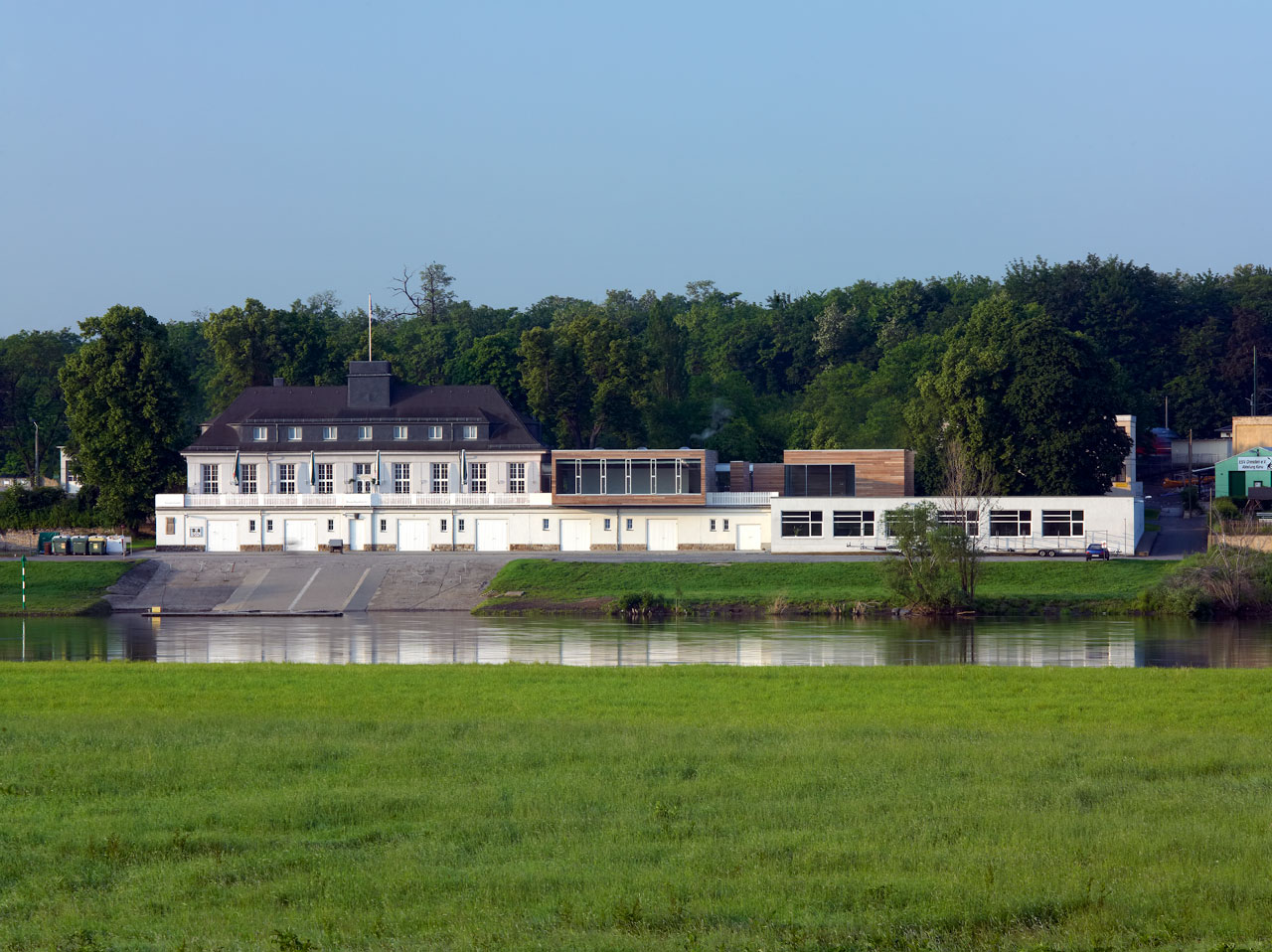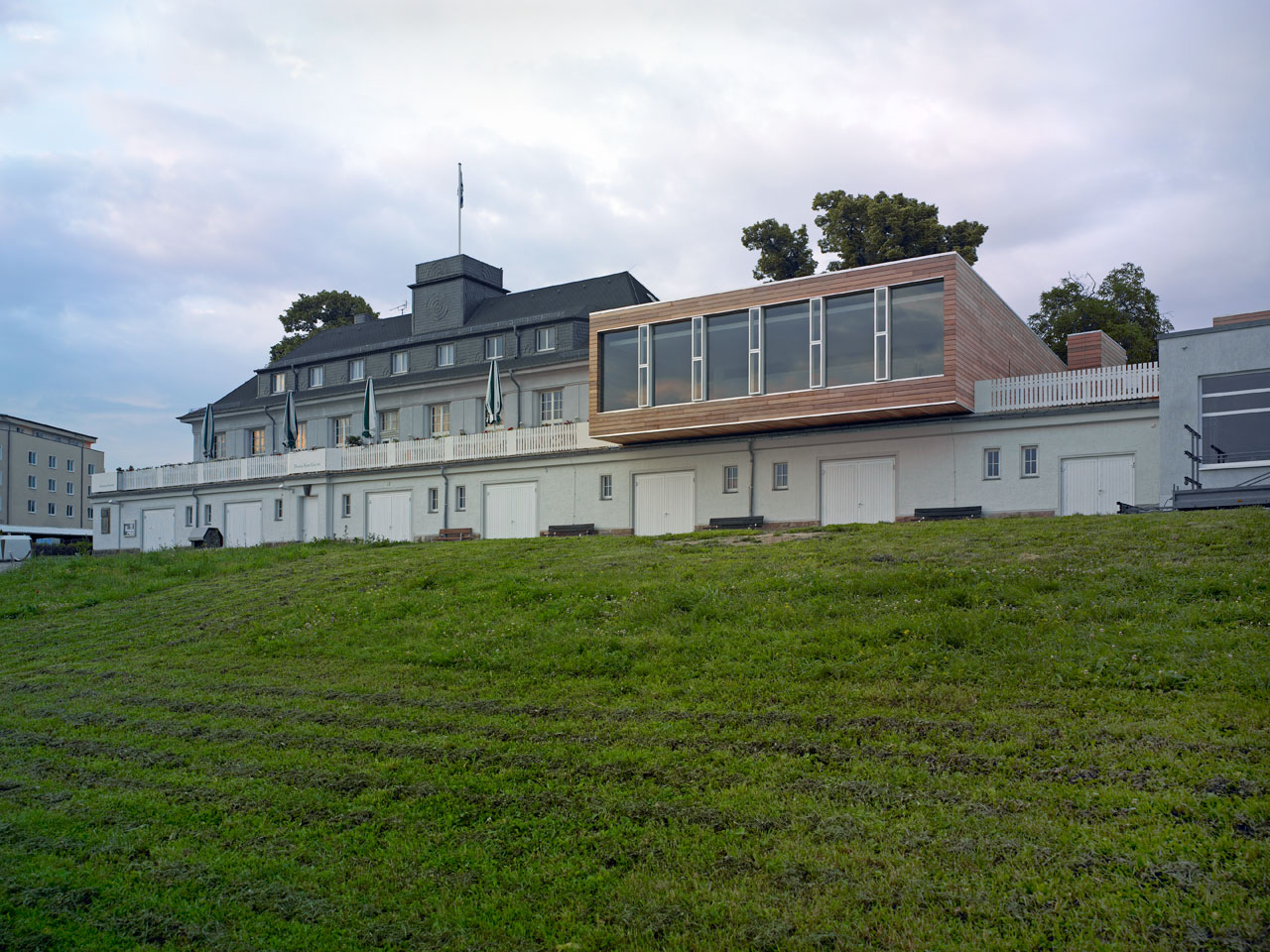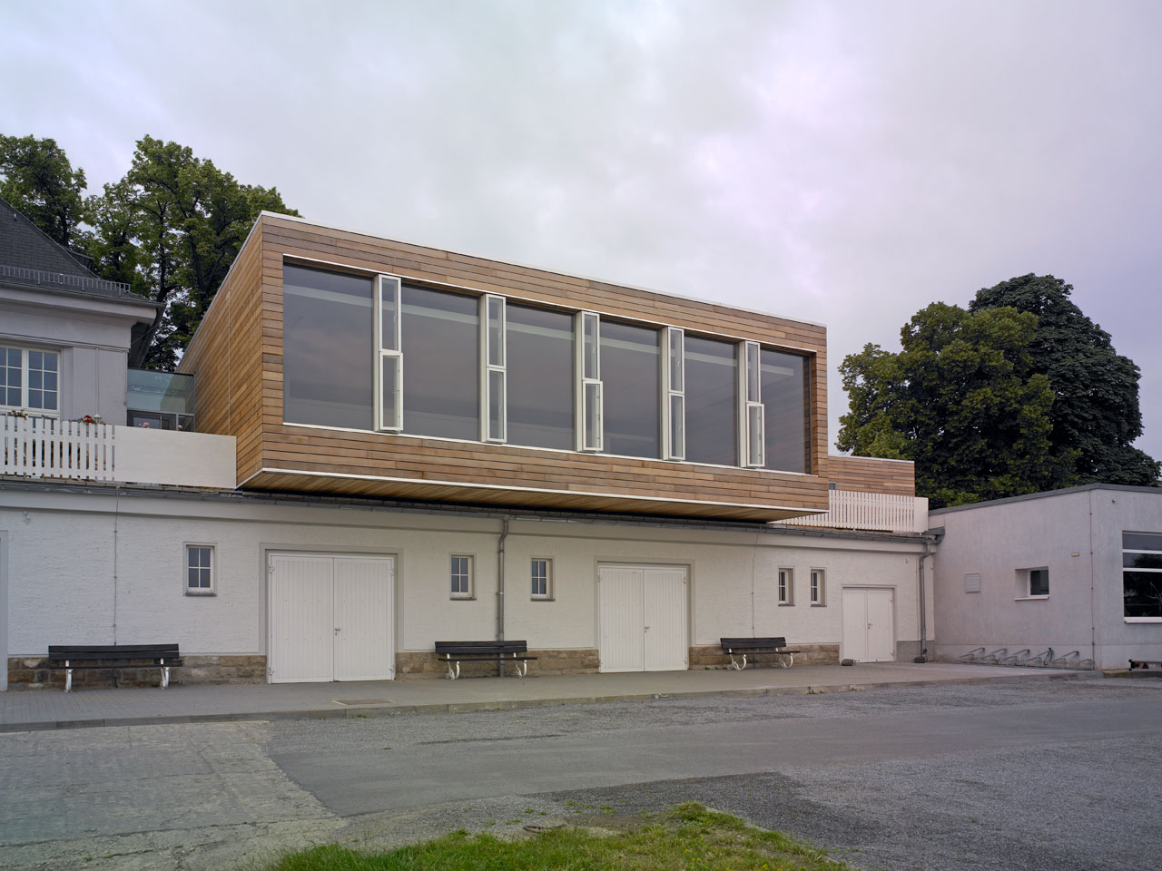 Sämtliche ehemals in den Bootslagerhallen untergebrachten Funktionen wie Regeneration, Umkleide, Sanitäreinrichtung, Sauna und Technik verlegten wir in das Obergeschoss. Um den umfangreichen Platzbedarf abdecken zu können, entschlossen wir uns für die Errichtung zweier Neubauten auf den Dächern der vorhandenen Gebäude. Leicht abgerückt vom Haupthaus, schiebt sich ein neuer Baukörper über die Terrasse in Richtung Elbe. In dem in Holzständerbauweise errichteten Bau befinden sich die Umkleiden mit zugehörigen Sanitäreinrichtungen, Physiotherapie, ein sich zur Elbe hin öffnender flexibel nutzbarer Raum sowie die Technikräume. Die Höhe des Gebäudes sowie die Gliederung der Fassade orientieren sich an der Höhenstaffelung des denkmalgeschützten Haupthauses. Für die Sauna entstand abgerückt im hinteren Teil der Terrassen ein separates Gebäude. Die Bootslagerhallen dienen nun wieder ausschließlich der Lagerung von Booten.