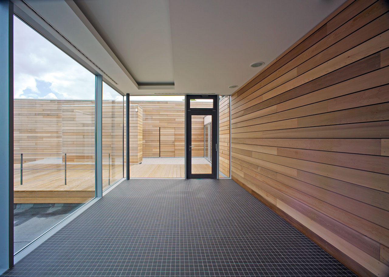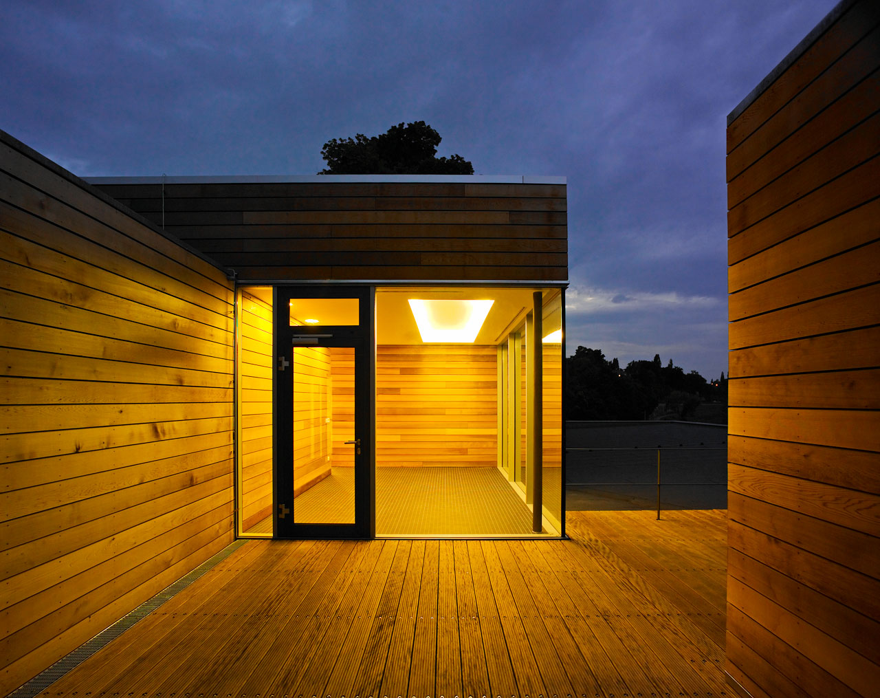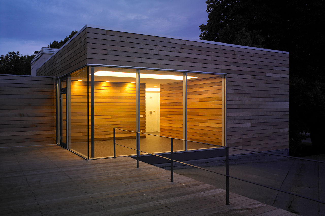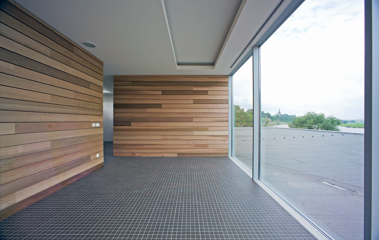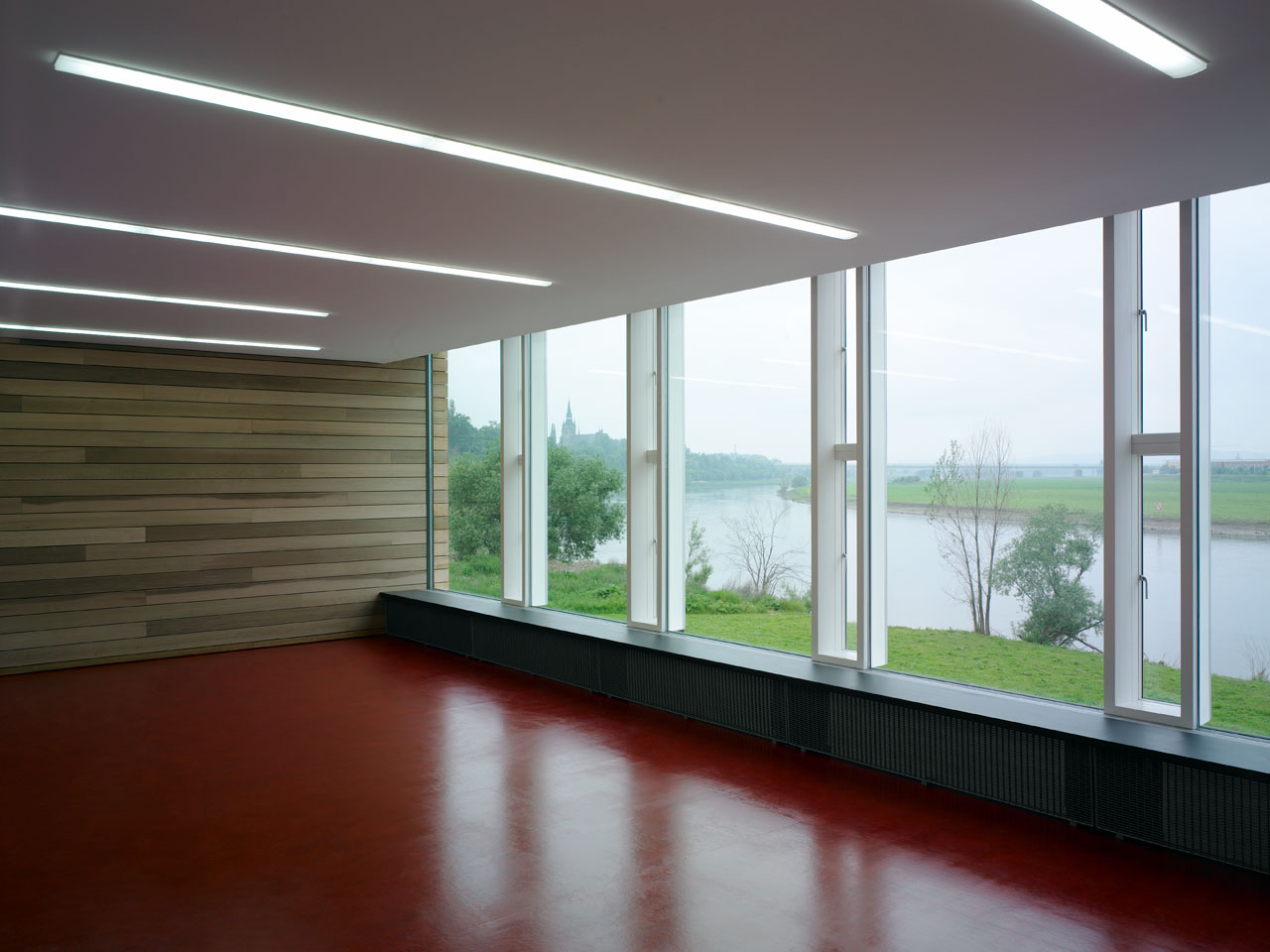 Sämtliche ehemals in den Bootslagerhallen untergebrachten Funktionen wie Regeneration, Umkleide, Sanitäreinrichtung, Sauna und Technik verlegten wir in das Obergeschoss. Um den umfangreichen Platzbedarf abdecken zu können, entschlossen wir uns für die Errichtung zweier Neubauten auf den Dächern der vorhandenen Gebäude. Leicht abgerückt vom Haupthaus, schiebt sich ein neuer Baukörper über die Terrasse in Richtung Elbe. In dem in Holzständerbauweise errichteten Bau befinden sich die Umkleiden mit zugehörigen Sanitäreinrichtungen, Physiotherapie, ein sich zur Elbe hin öffnender flexibel nutzbarer Raum sowie die Technikräume. Die Höhe des Gebäudes sowie die Gliederung der Fassade orientieren sich an der Höhenstaffelung des denkmalgeschützten Haupthauses. Für die Sauna entstand abgerückt im hinteren Teil der Terrassen ein separates Gebäude. Die Bootslagerhallen dienen nun wieder ausschließlich der Lagerung von Booten.