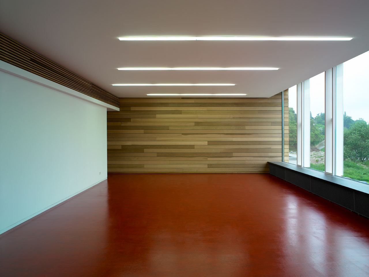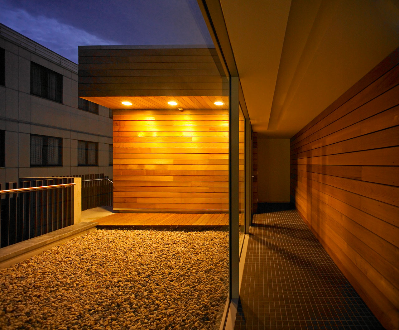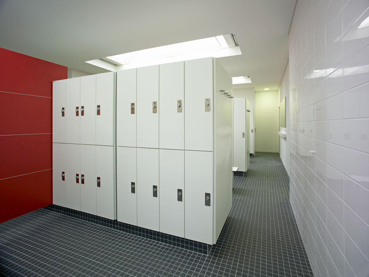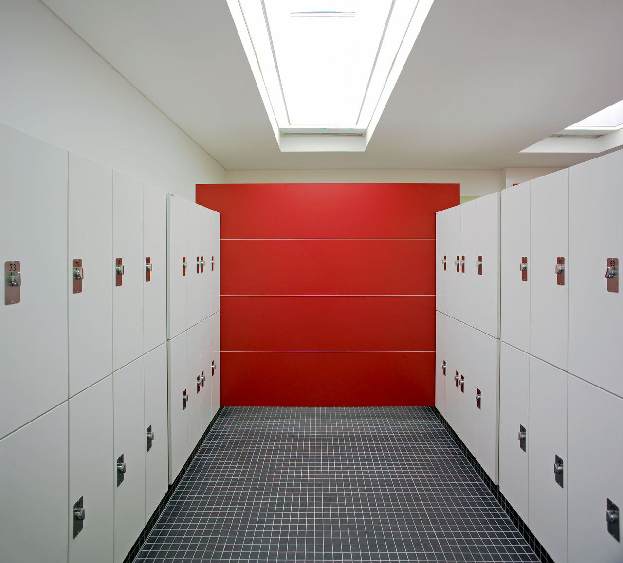 Sämtliche ehemals in den Bootslagerhallen untergebrachten Funktionen wie Regeneration, Umkleide, Sanitäreinrichtung, Sauna und Technik verlegten wir in das Obergeschoss. Um den umfangreichen Platzbedarf abdecken zu können, entschlossen wir uns für die Errichtung zweier Neubauten auf den Dächern der vorhandenen Gebäude. Leicht abgerückt vom Haupthaus, schiebt sich ein neuer Baukörper über die Terrasse in Richtung Elbe. In dem in Holzständerbauweise errichteten Bau befinden sich die Umkleiden mit zugehörigen Sanitäreinrichtungen, Physiotherapie, ein sich zur Elbe hin öffnender flexibel nutzbarer Raum sowie die Technikräume. Die Höhe des Gebäudes sowie die Gliederung der Fassade orientieren sich an der Höhenstaffelung des denkmalgeschützten Haupthauses. Für die Sauna entstand abgerückt im hinteren Teil der Terrassen ein separates Gebäude. Die Bootslagerhallen dienen nun wieder ausschließlich der Lagerung von Booten.