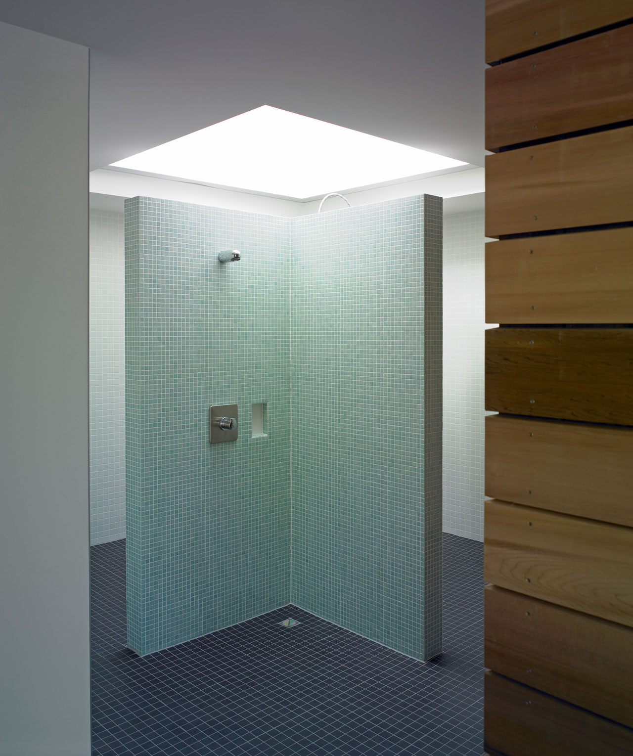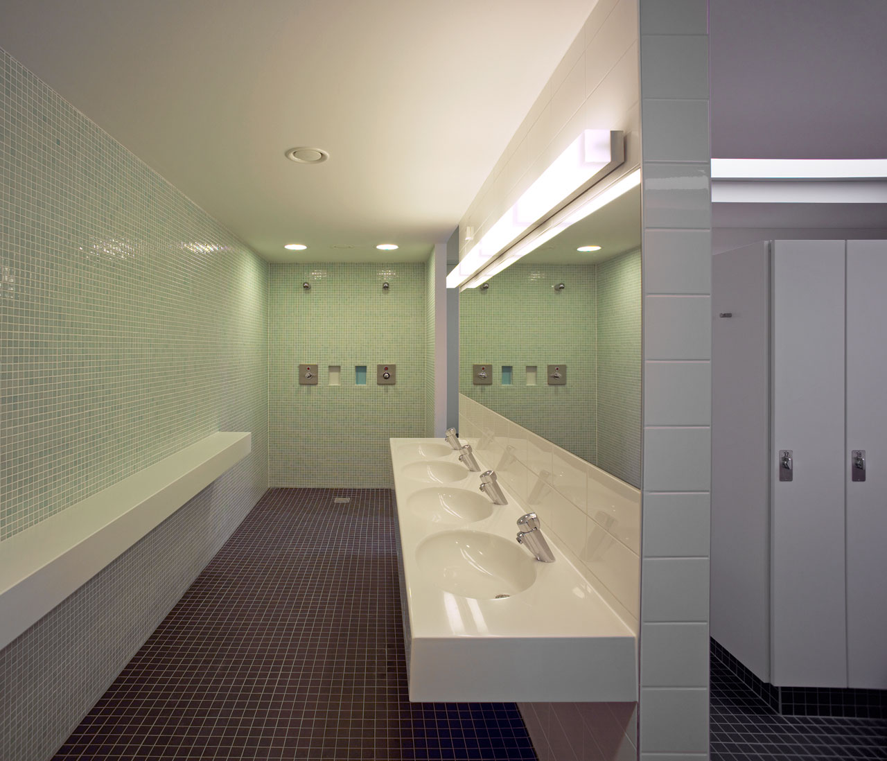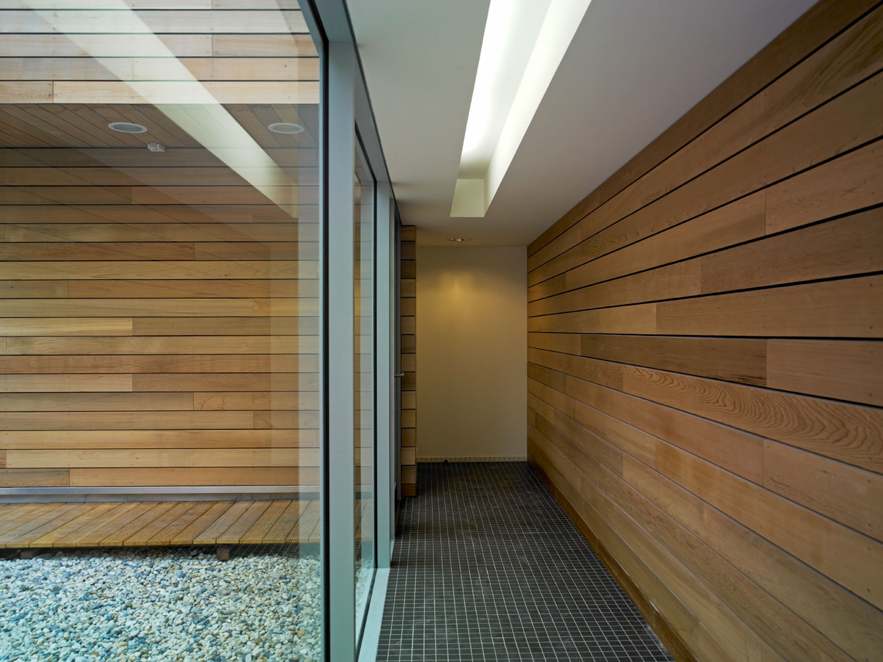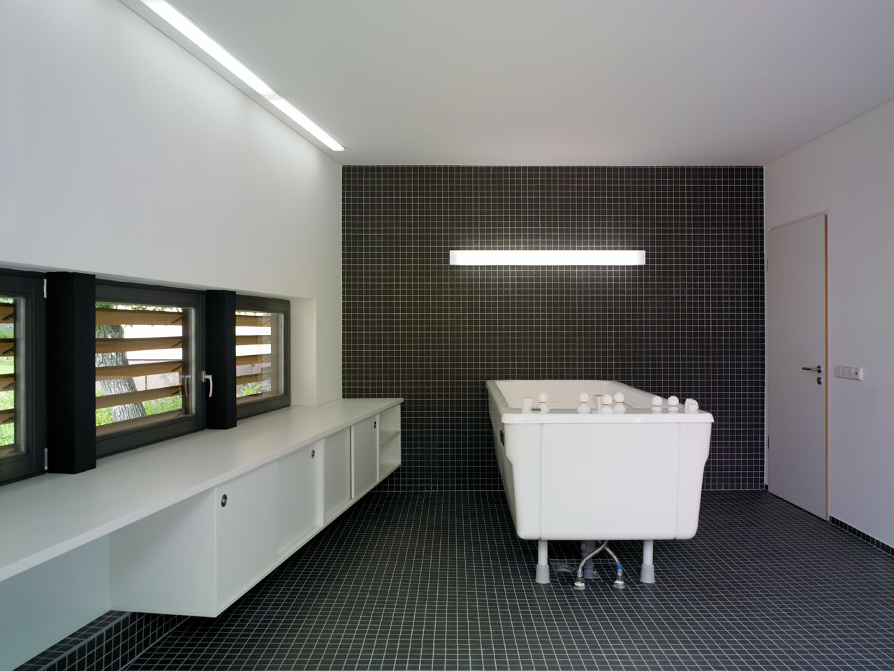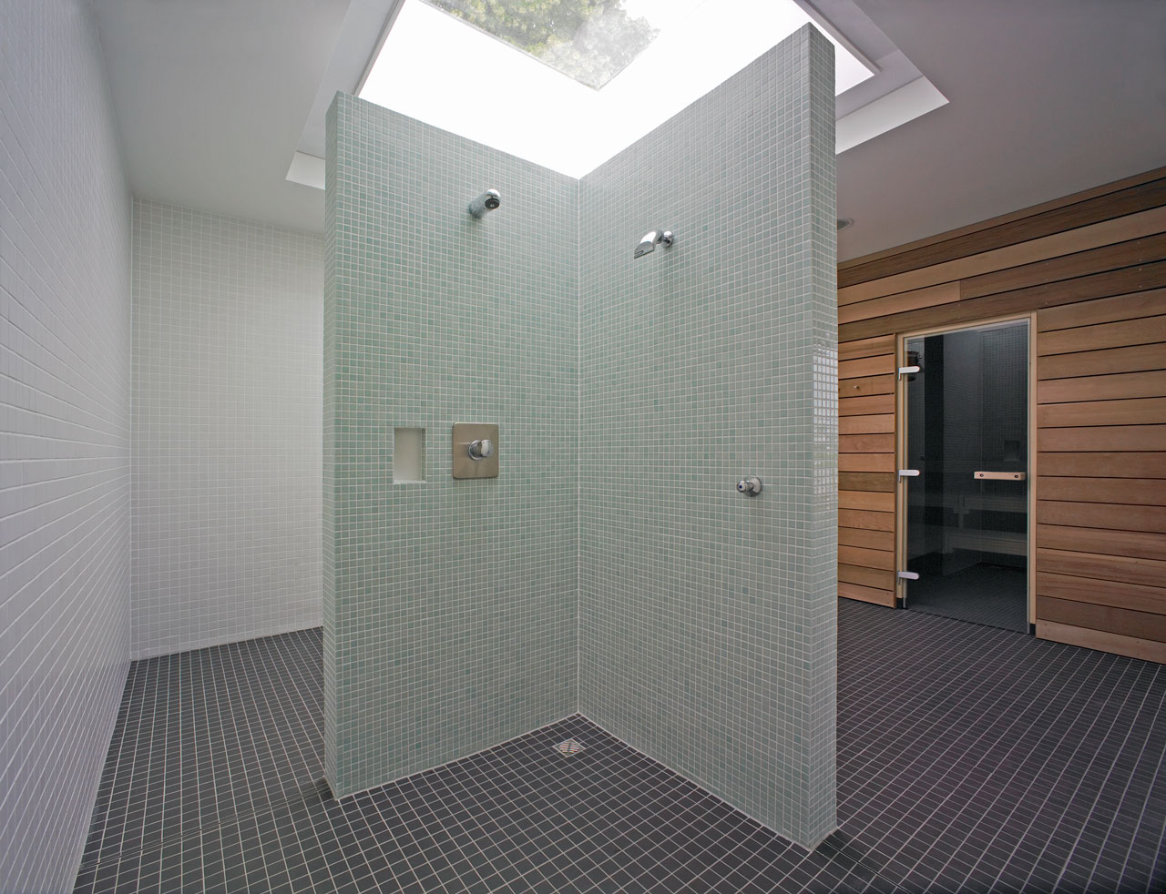 Sämtliche ehemals in den Bootslagerhallen untergebrachten Funktionen wie Regeneration, Umkleide, Sanitäreinrichtung, Sauna und Technik verlegten wir in das Obergeschoss. Um den umfangreichen Platzbedarf abdecken zu können, entschlossen wir uns für die Errichtung zweier Neubauten auf den Dächern der vorhandenen Gebäude. Leicht abgerückt vom Haupthaus, schiebt sich ein neuer Baukörper über die Terrasse in Richtung Elbe. In dem in Holzständerbauweise errichteten Bau befinden sich die Umkleiden mit zugehörigen Sanitäreinrichtungen, Physiotherapie, ein sich zur Elbe hin öffnender flexibel nutzbarer Raum sowie die Technikräume. Die Höhe des Gebäudes sowie die Gliederung der Fassade orientieren sich an der Höhenstaffelung des denkmalgeschützten Haupthauses. Für die Sauna entstand abgerückt im hinteren Teil der Terrassen ein separates Gebäude. Die Bootslagerhallen dienen nun wieder ausschließlich der Lagerung von Booten.