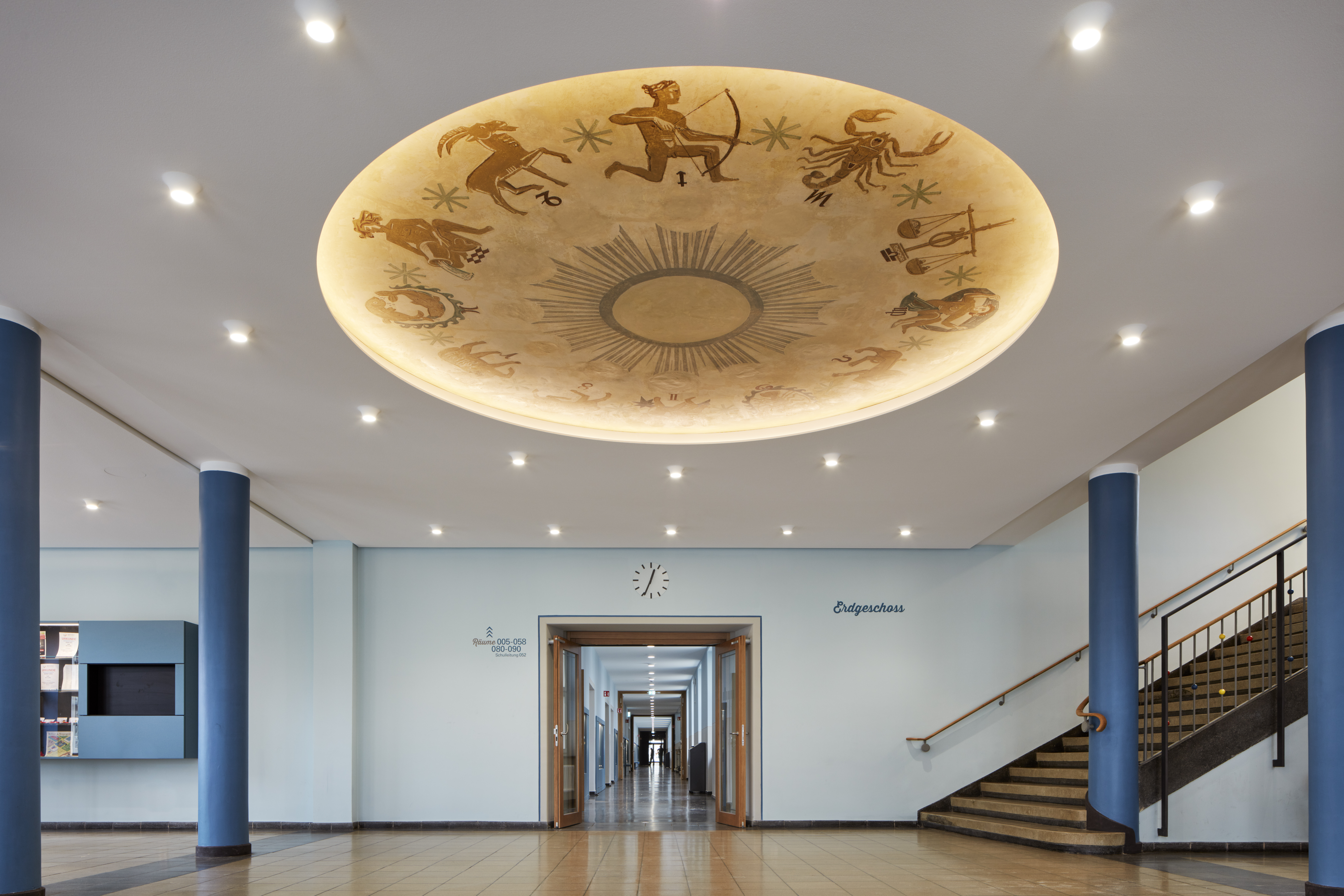 Die künstlerische Gestaltung der Deckenerhebung im Foyer wurde restauriert und durch eine nach innen gewölbte Lampe im Stil der 50er Jahre zusätzlich beleuchtet.