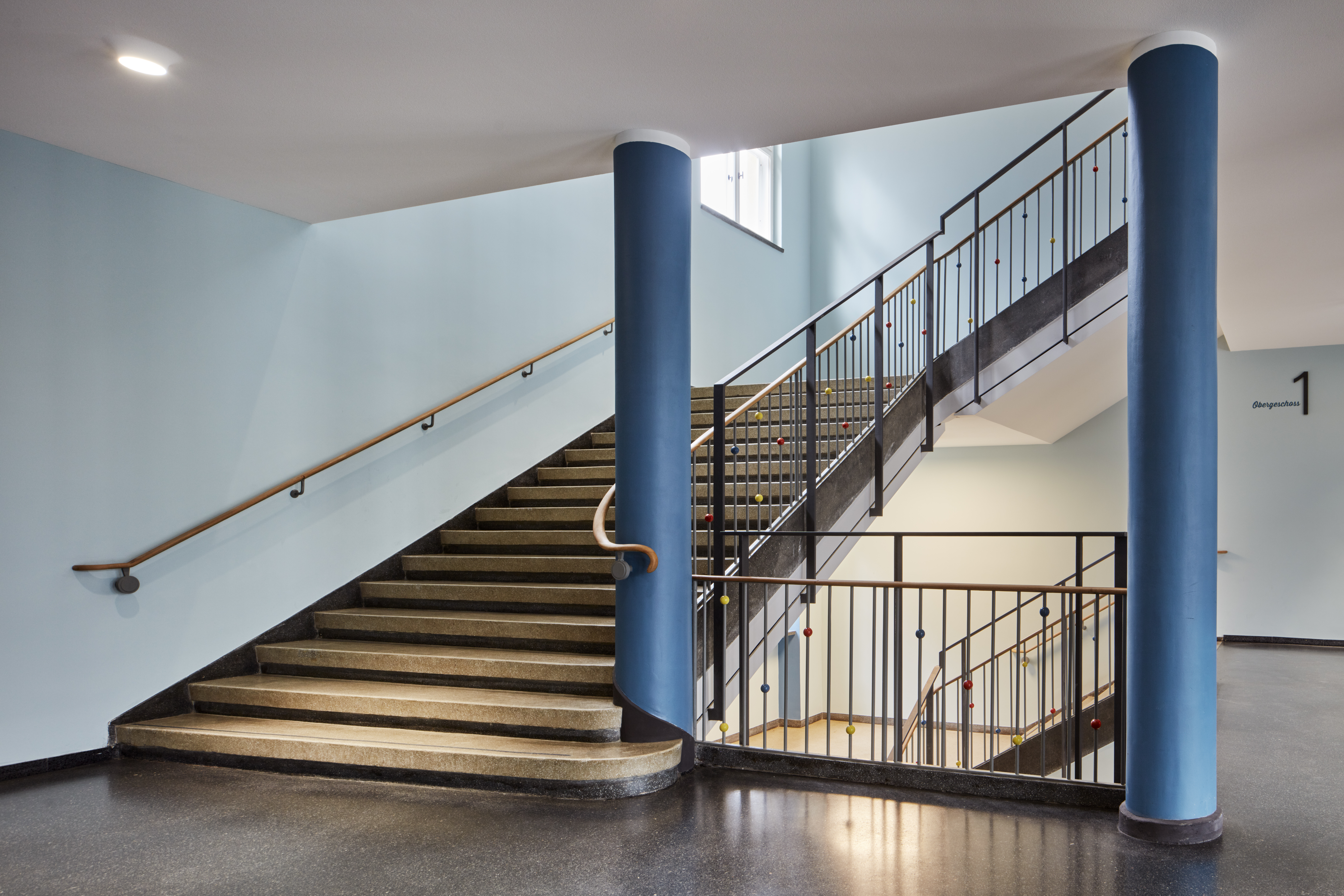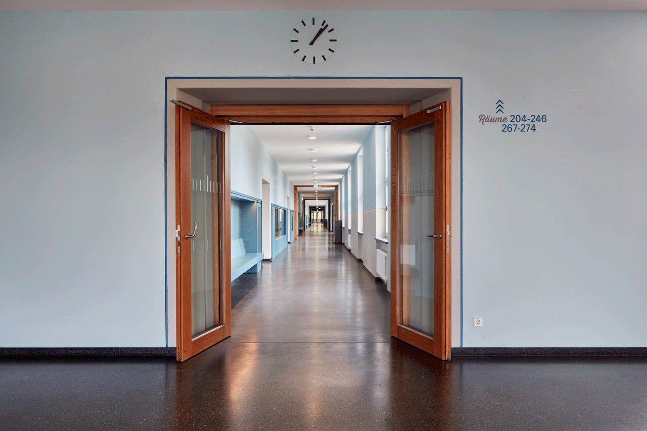 Im denkmalgeschützten Bestandsgebäude wurden die räumlichen Strukturen nahezu vollständig erhalten und nur durch baurechtlich erforderliche neue Elemente (bspw. zusätzliche Fluchttreppen und BS- Türen) ergänzt.