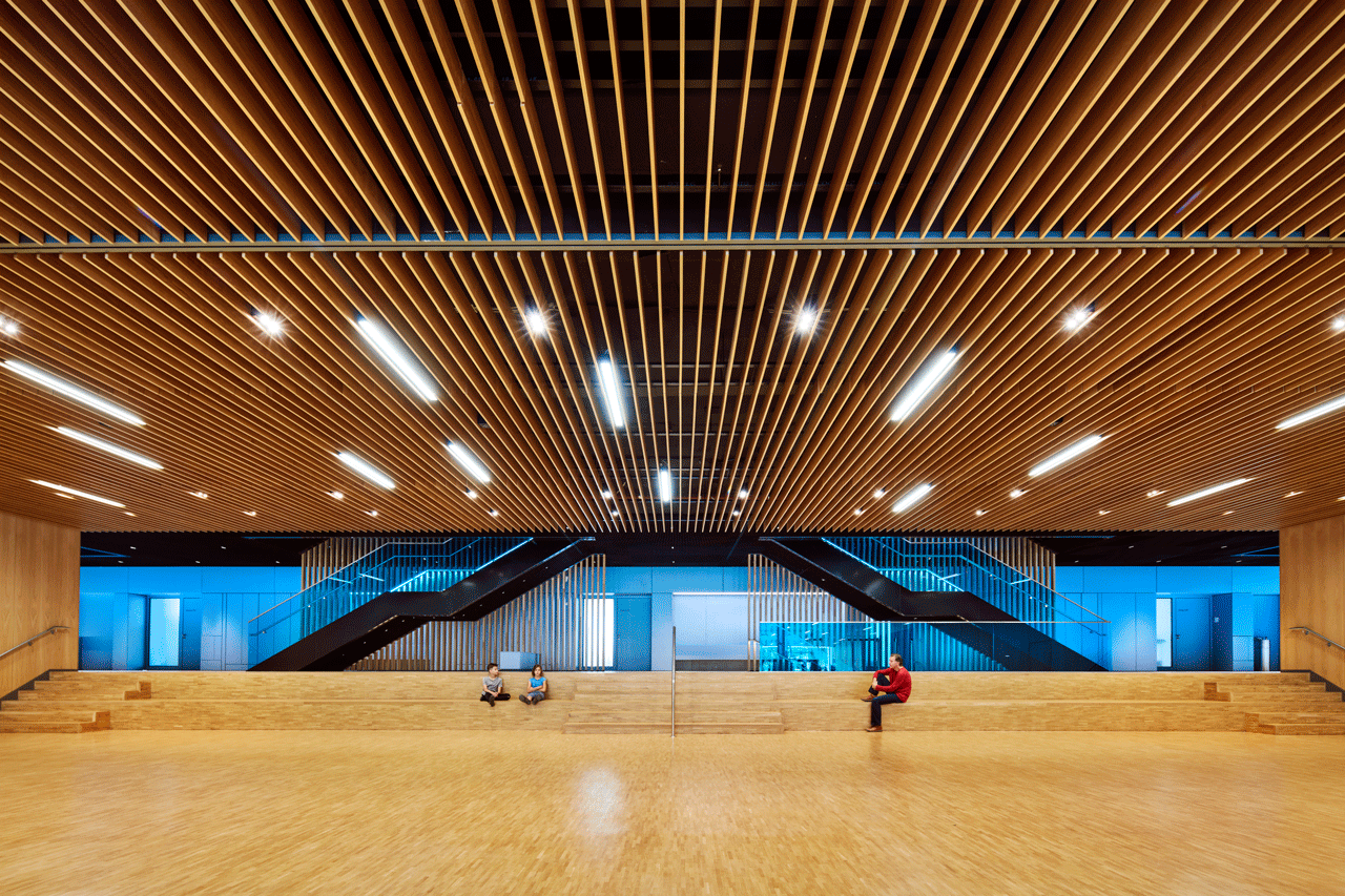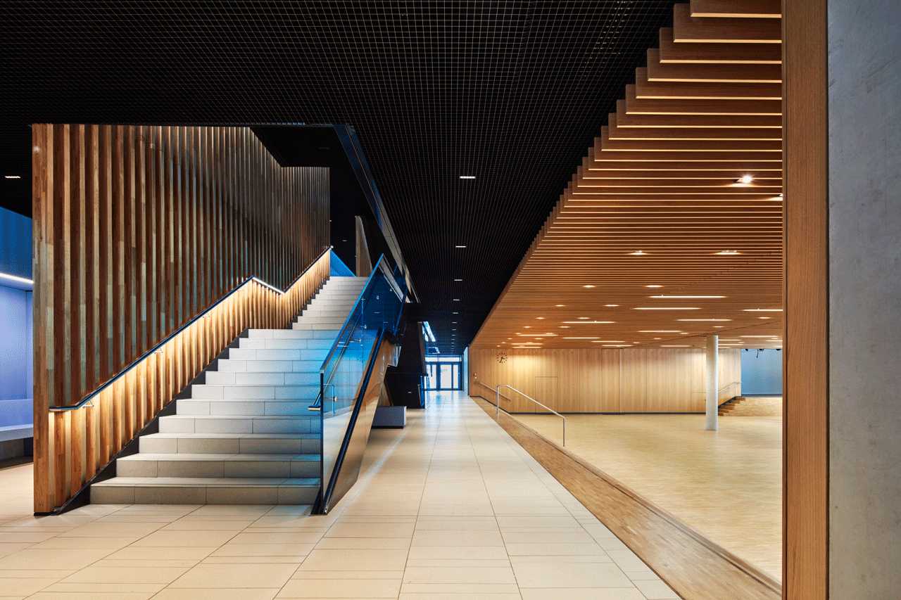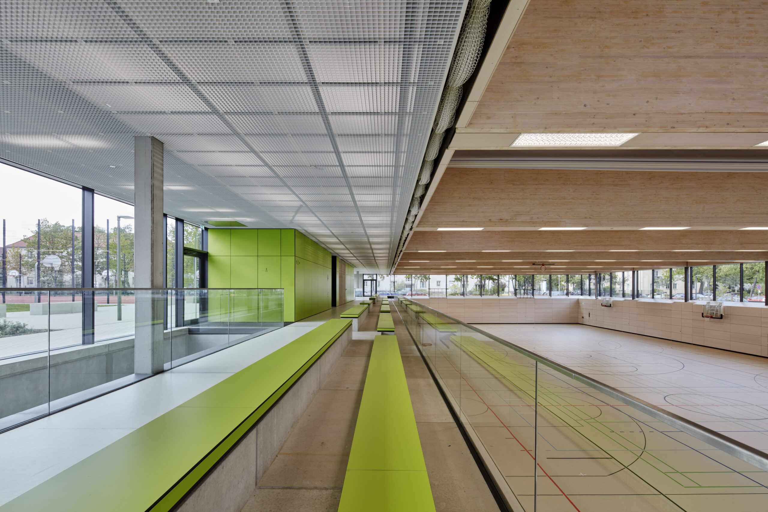 Im Erdgeschoss sind Foyer, Aula und Speiseraum als zusammenschaltbare Raumlandschaft inszeniert, die multifunktional nutzbar ist. Für in- und externe Veranstaltungen lassen sich mittels flexibler Wände unterschiedliche Raumgrößen und –zuschnitte herstellen.