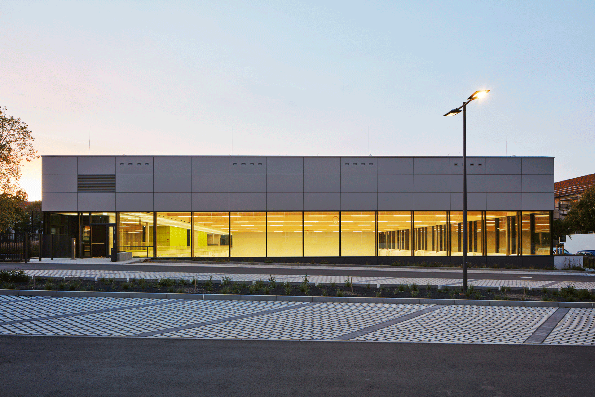 Die Fassade des Neubaus wird durch eine leichte, vertikale Konstruktion aus Metall-Lisenen strukturiert, welche die dahinterliegenden, vorgefertigten Fertigteilpaneele mit integrierten Aluminium-Fensterelementen teilweise verdeckt.