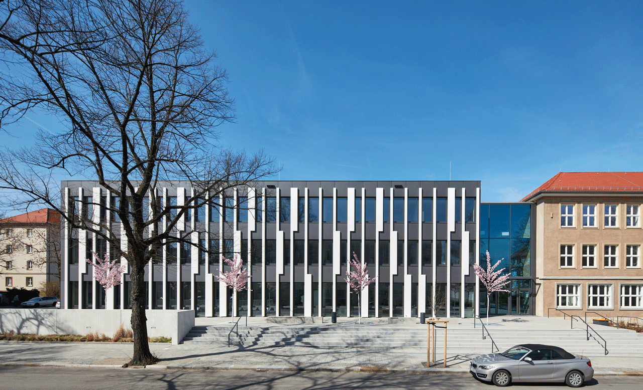Der denkmalgeschützte Schulbau aus den 1950er Jahren bleibt durch seine hervorgehobene, unverstellte städtebauliche Positionierung prägend für das Gesamtensemble. Die neue Gebäudestruktur bindet nur partiell an den Bestand an, dieser wird so respektvoll behandelt und erfährt durch die entstehende räumliche Konfiguration eine Aufwertung. Der Schulanbau an der Altenzeller Straße ordnet sich mit seiner kompakten, kammartigen Bauform sowie der stadträumlichen Platzierung dem Bestand unter. Er korrespondiert durch die Aufnahme von Raumkanten und Baufluchten sowohl mit dem Bestandsgebäude als auch mit der umgebenden Wohnbebauung, wobei die 3-geschossige Bauweise in ihrer Höhenentwicklung nicht die Traufhöhe des Bestandes überschreitet.