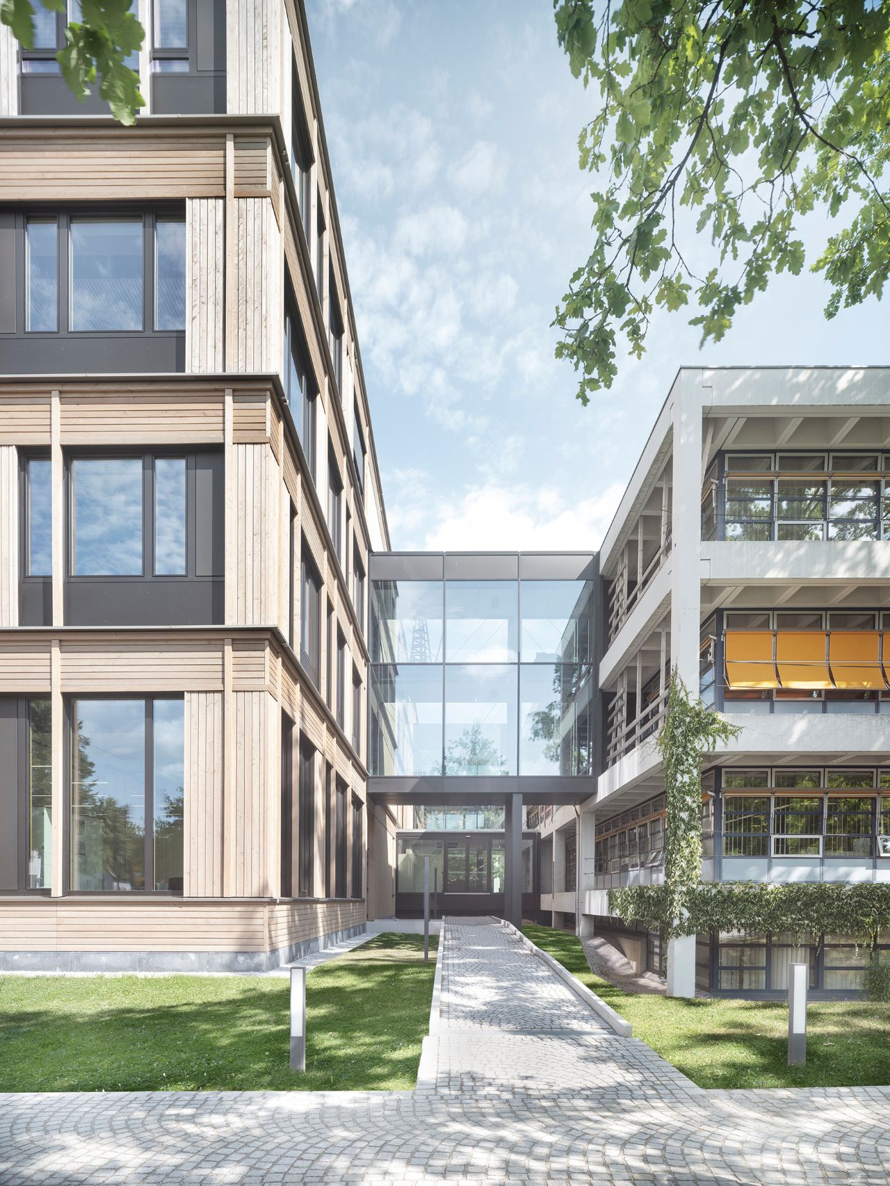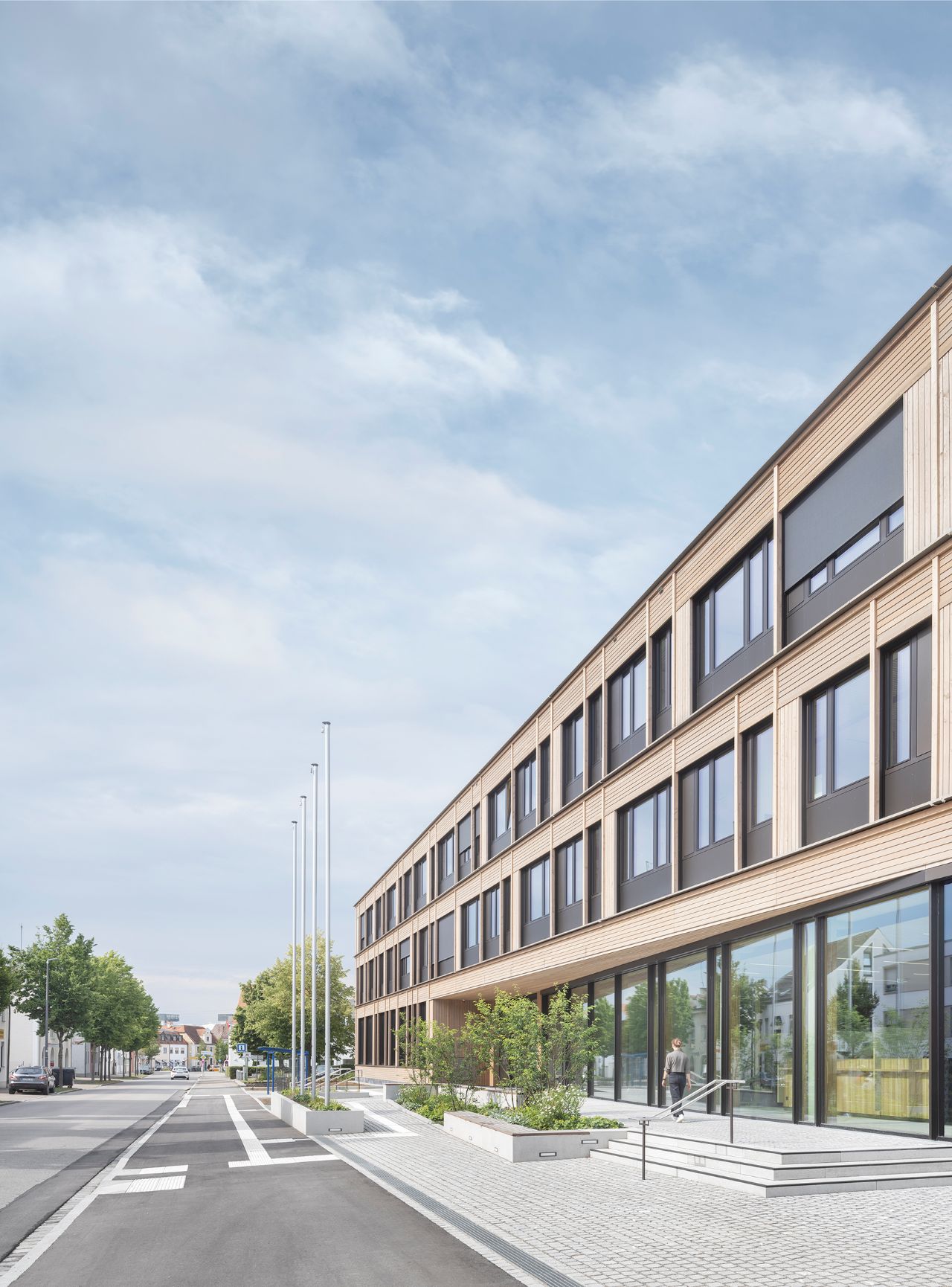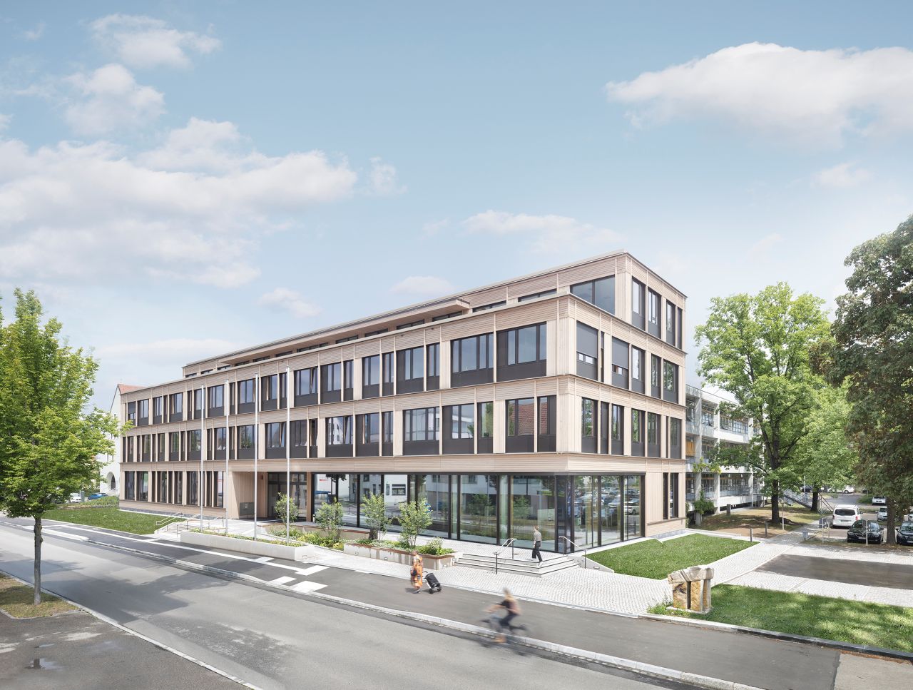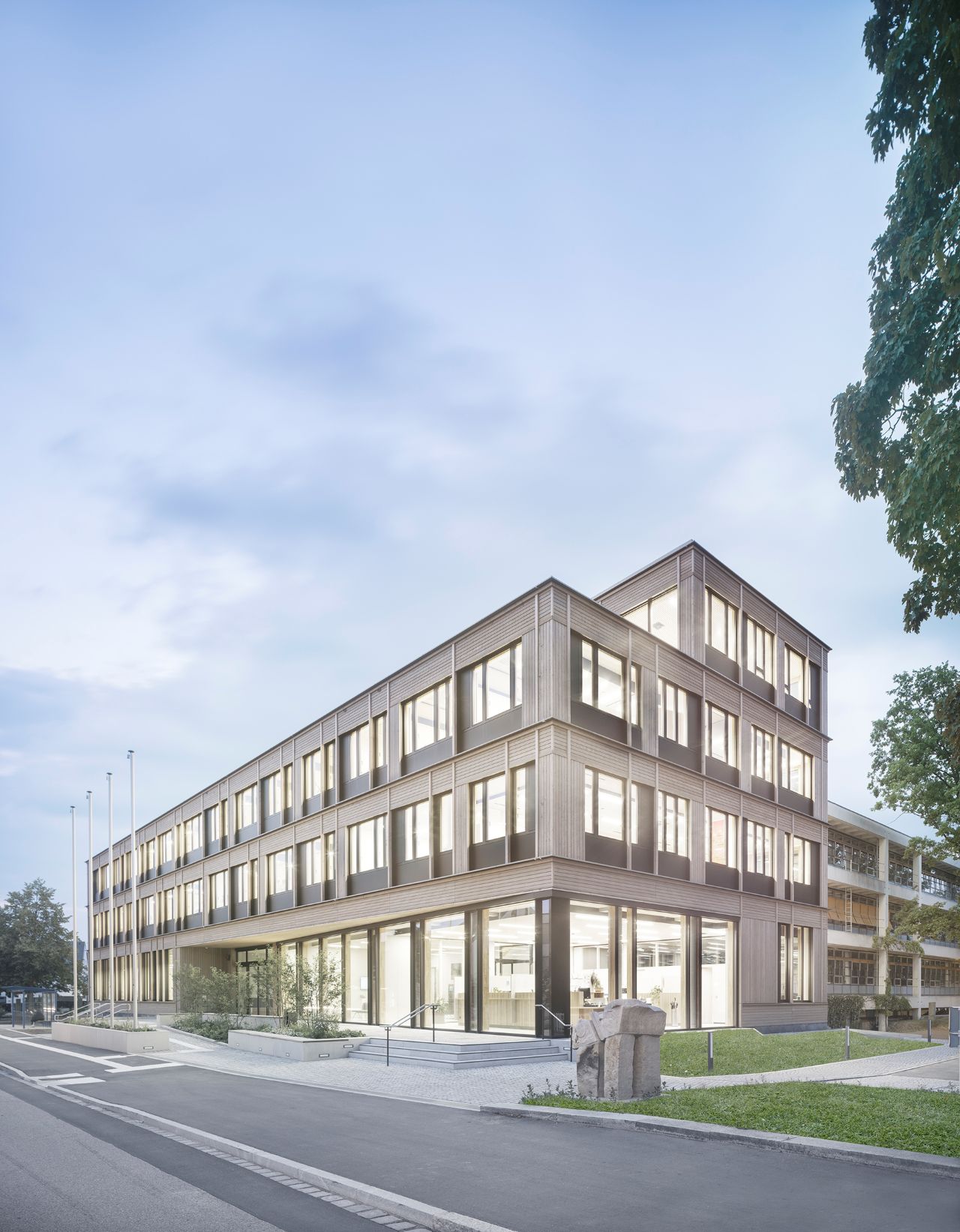 Erweiterungsneubau in Holz-Hybridbauweise mit Büros, öffentlichen Bereichen und Bestandsanbindung.