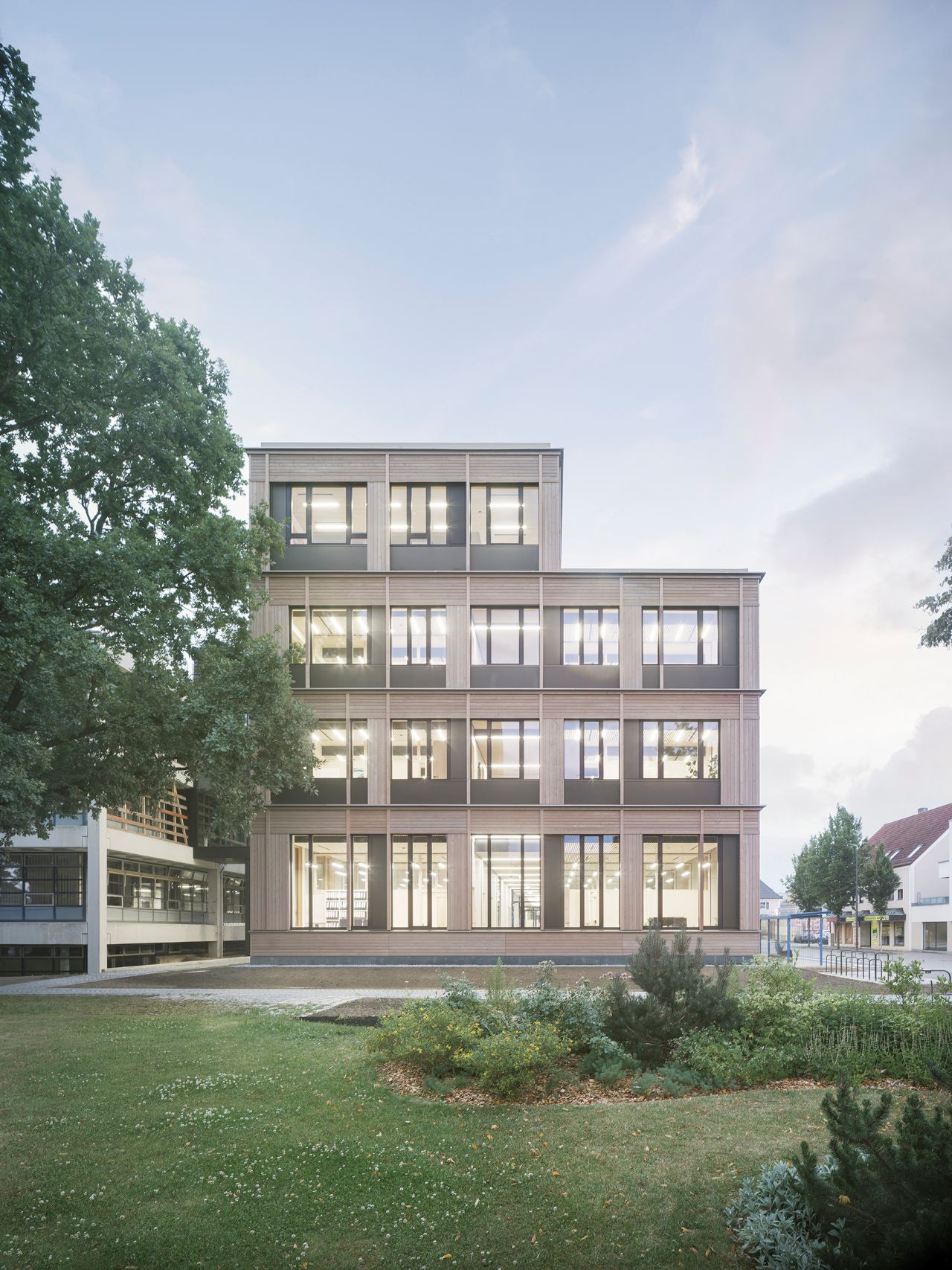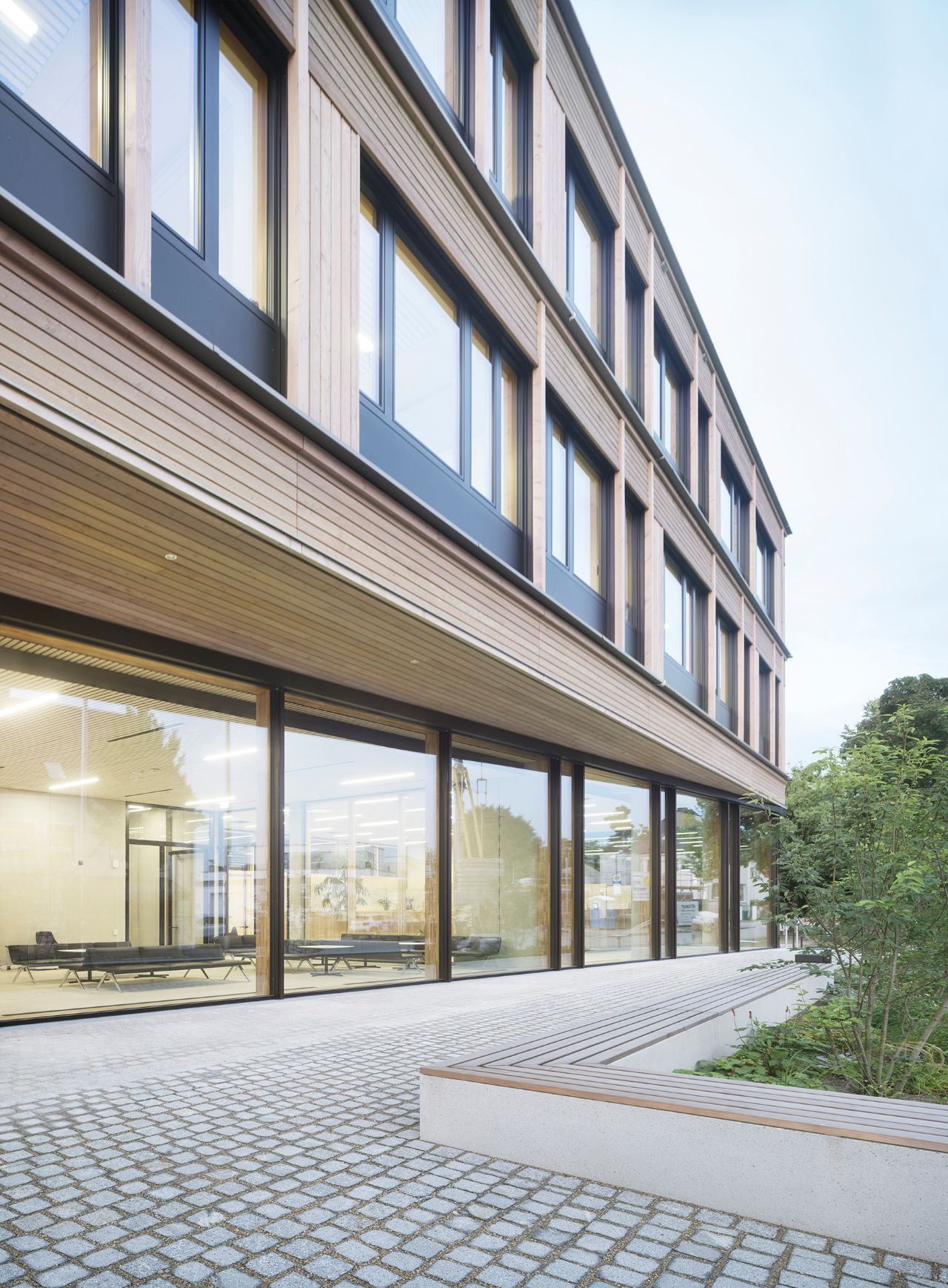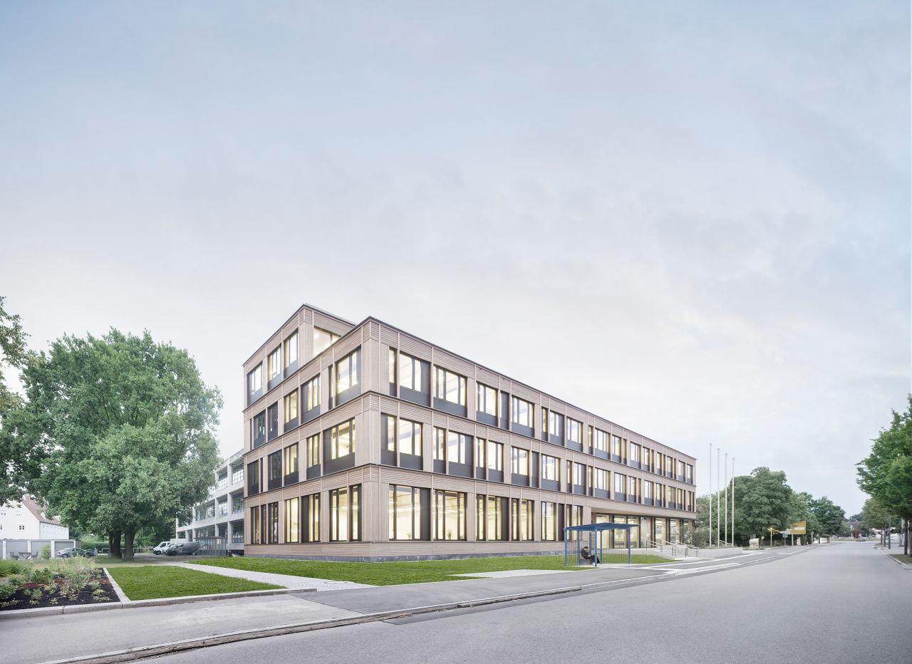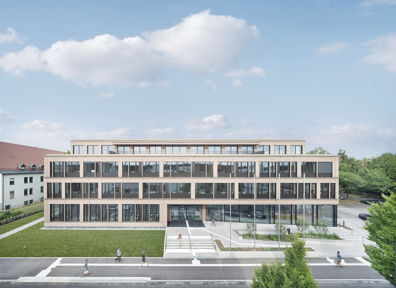 Erweiterungsneubau in Holz-Hybridbauweise mit Büros, öffentlichen Bereichen und Bestandsanbindung.