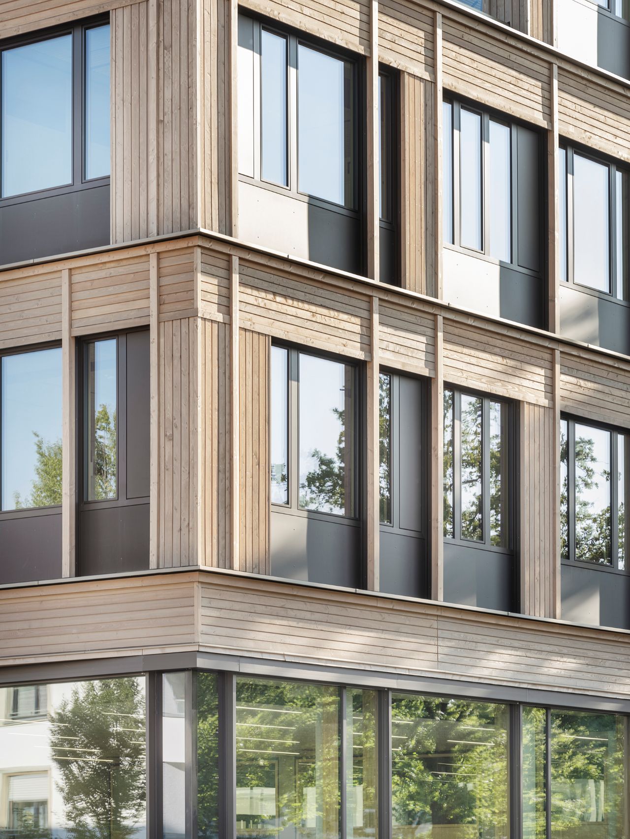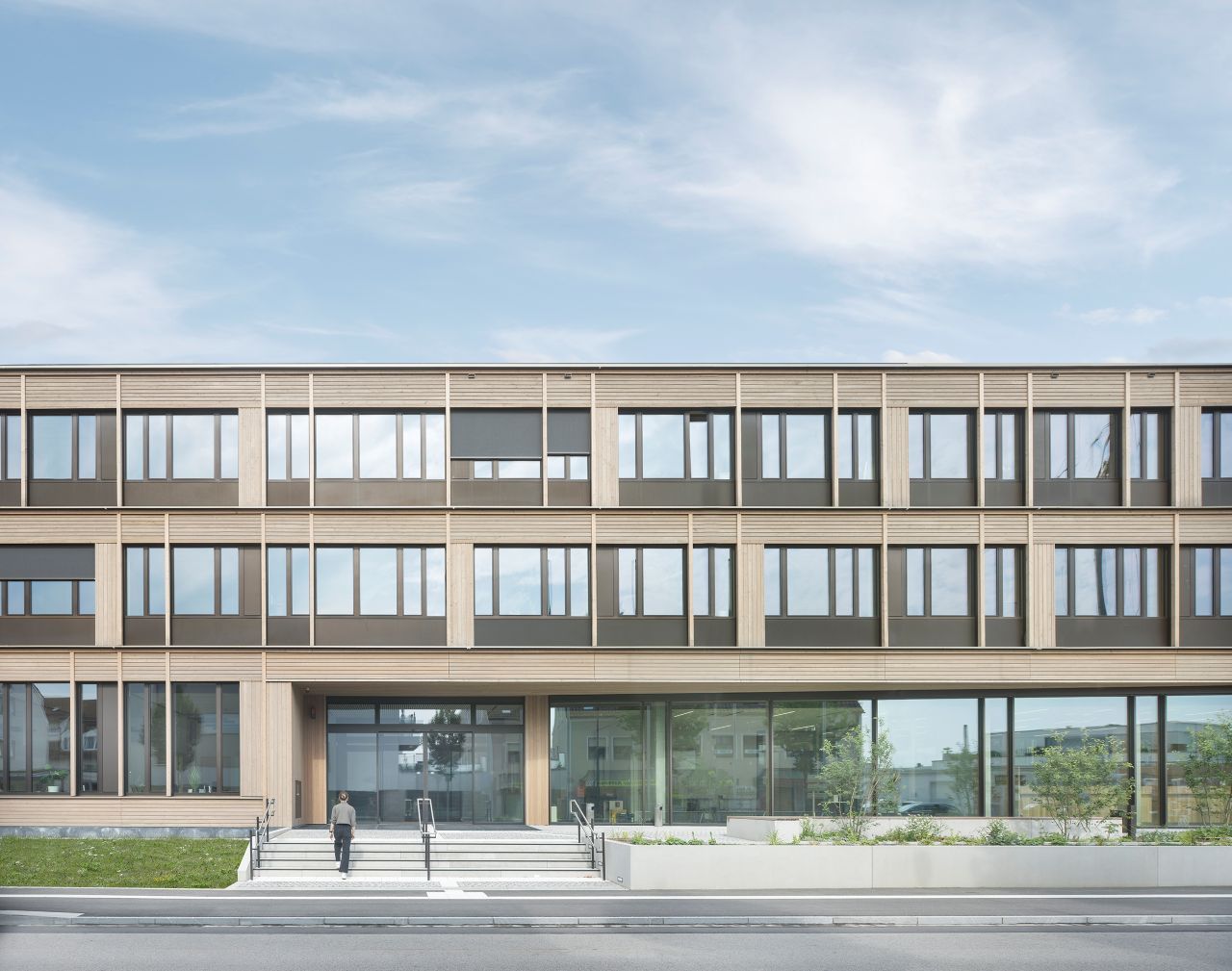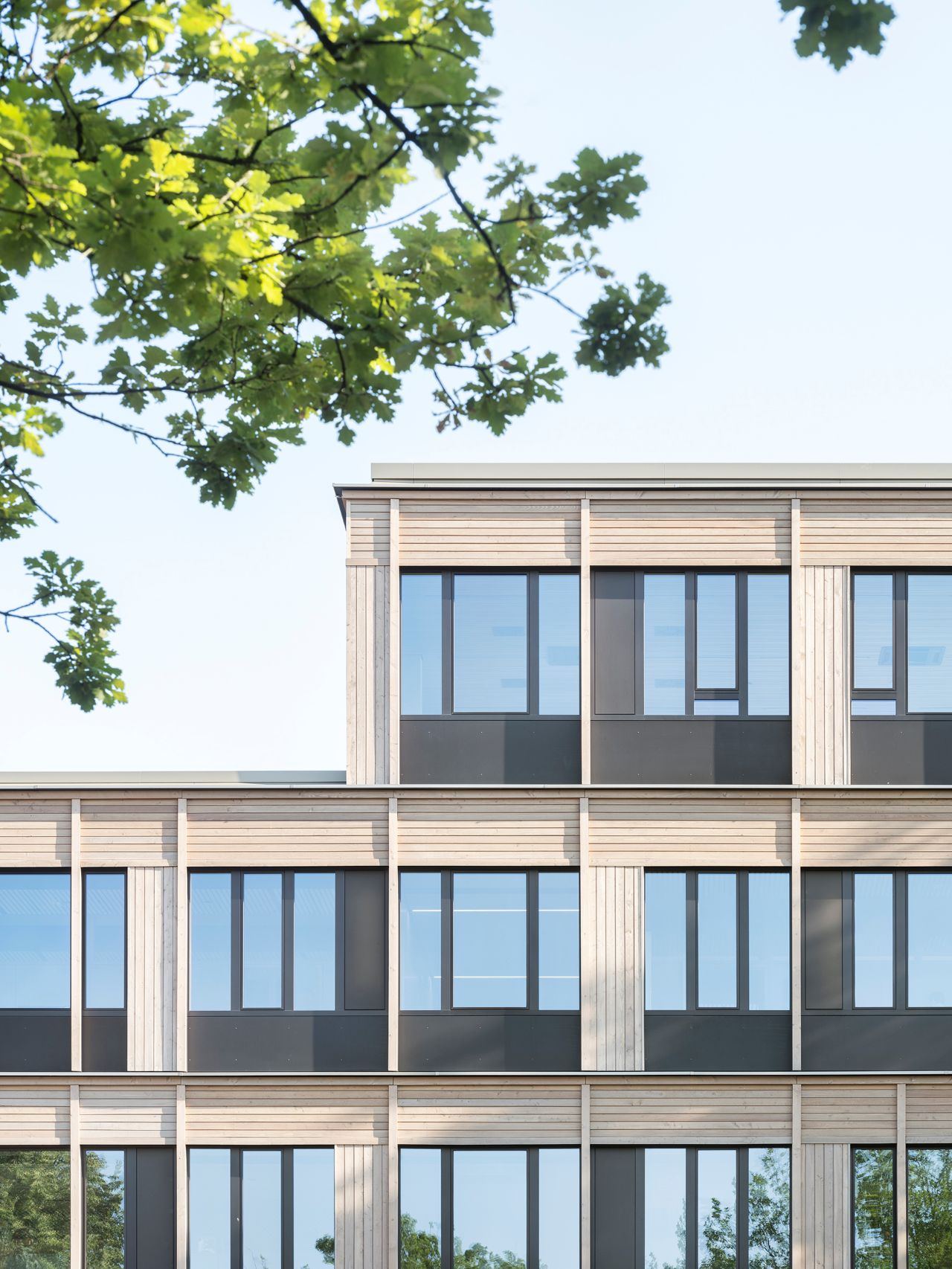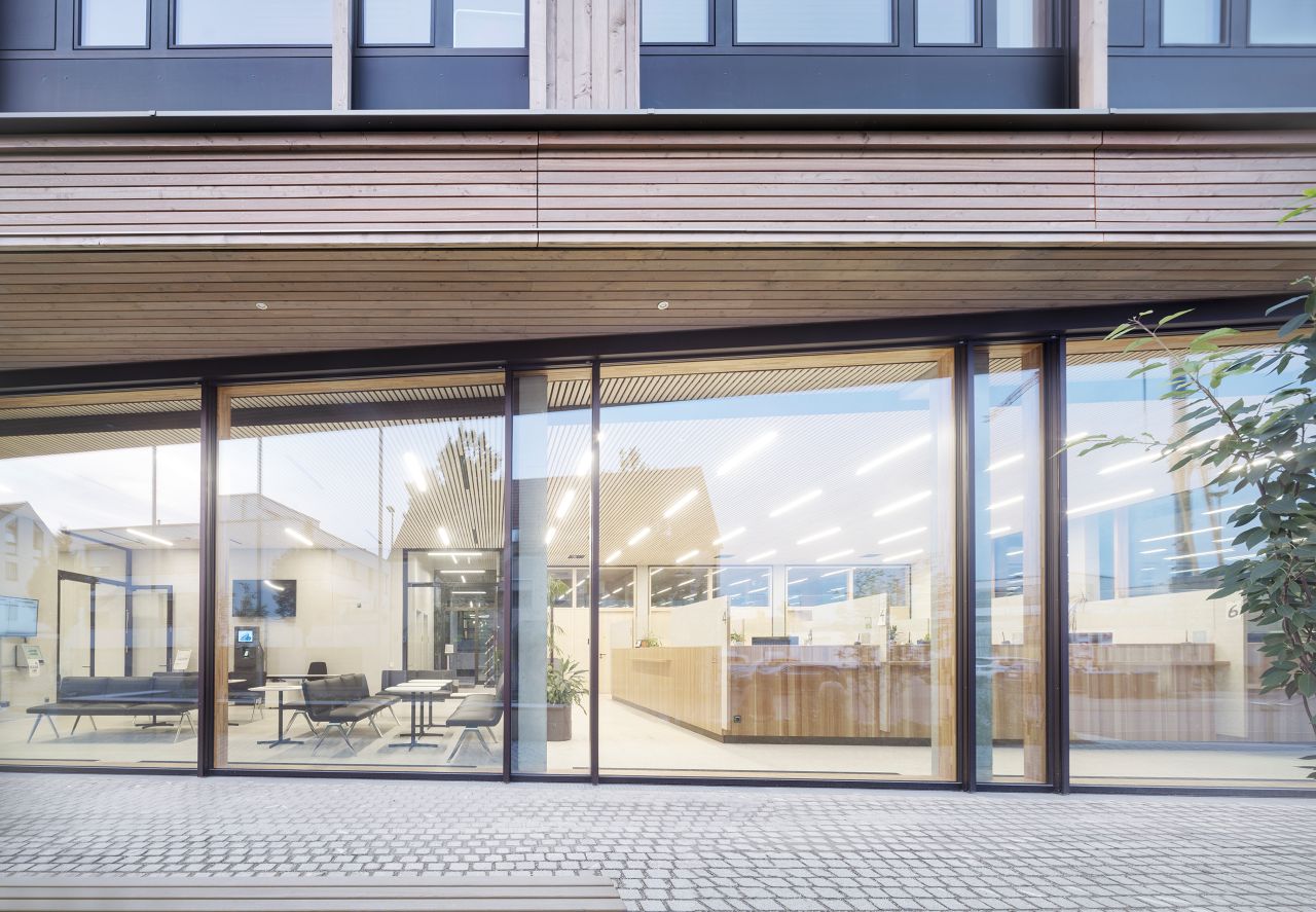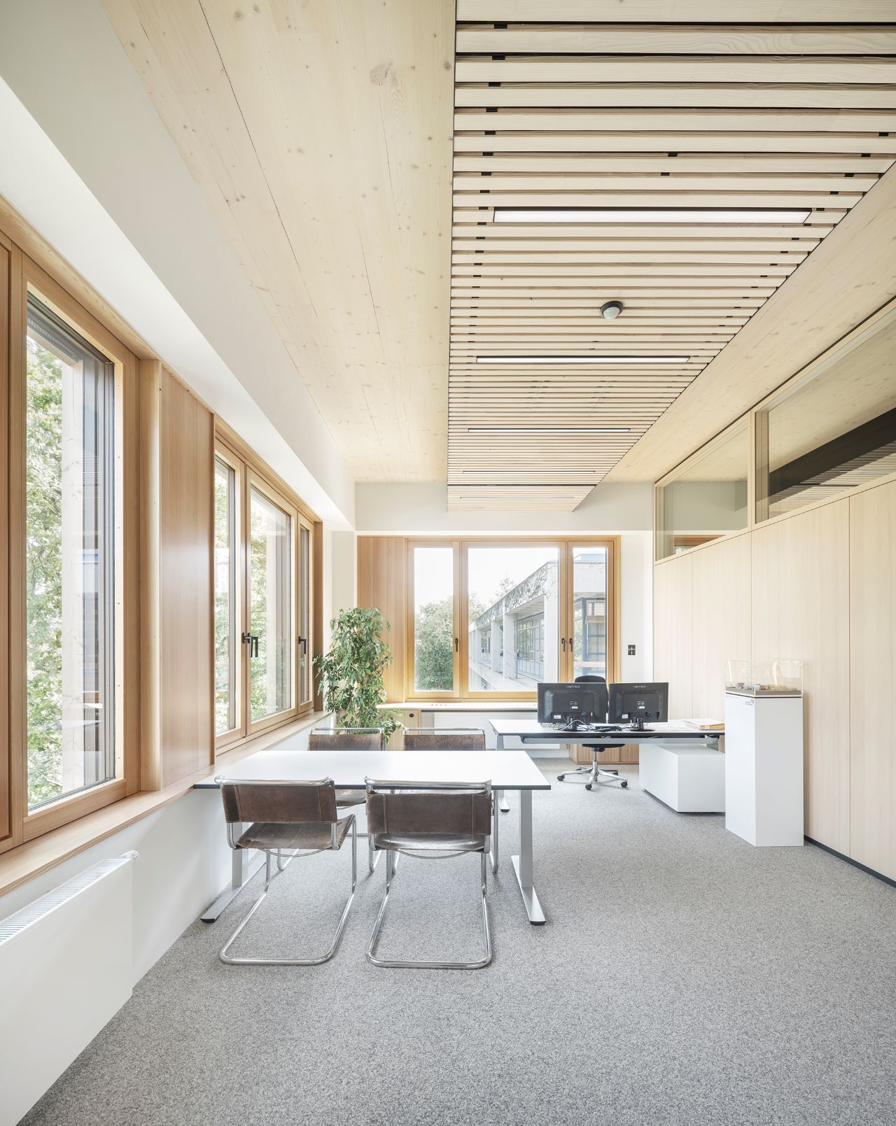 Erweiterungsneubau in Holz-Hybridbauweise mit Büros, öffentlichen Bereichen und Bestandsanbindung.