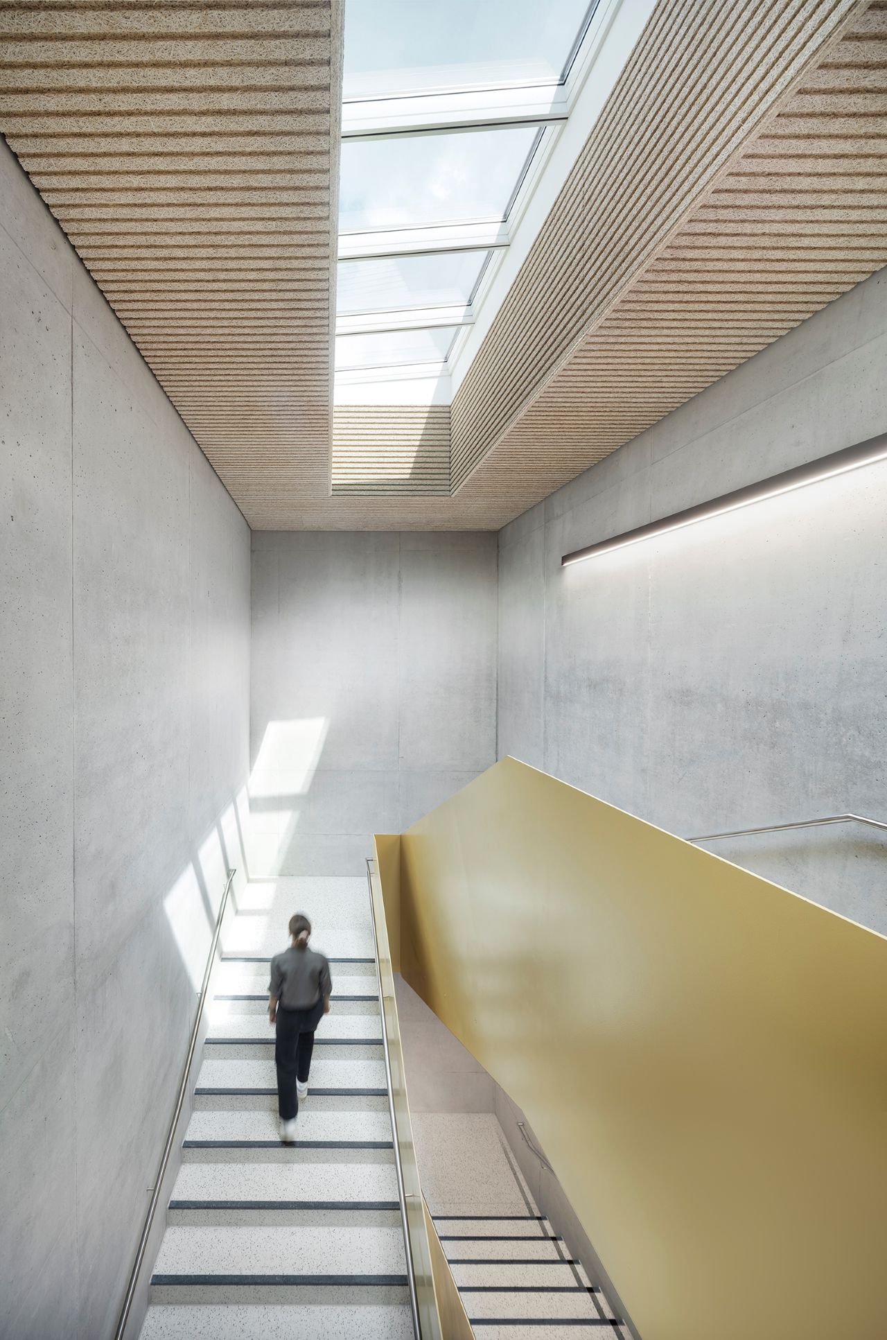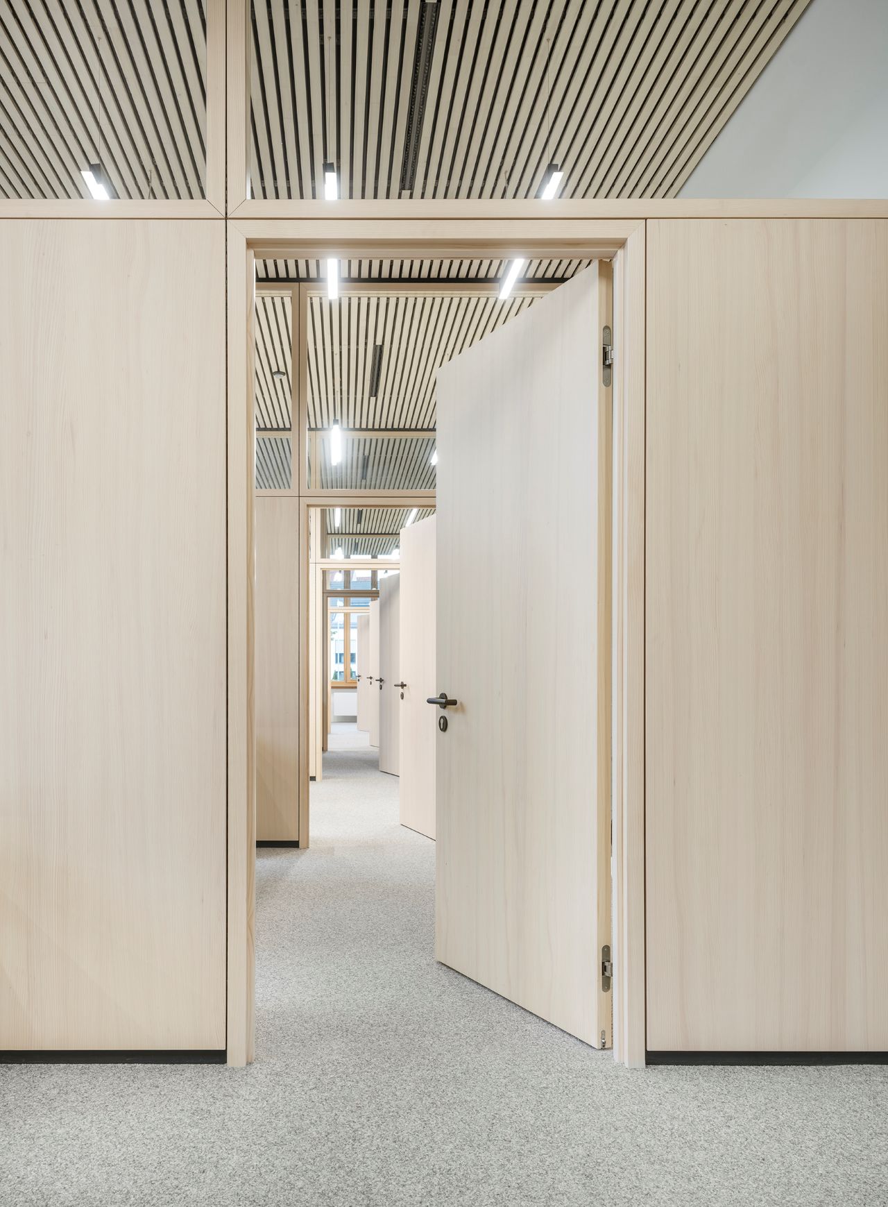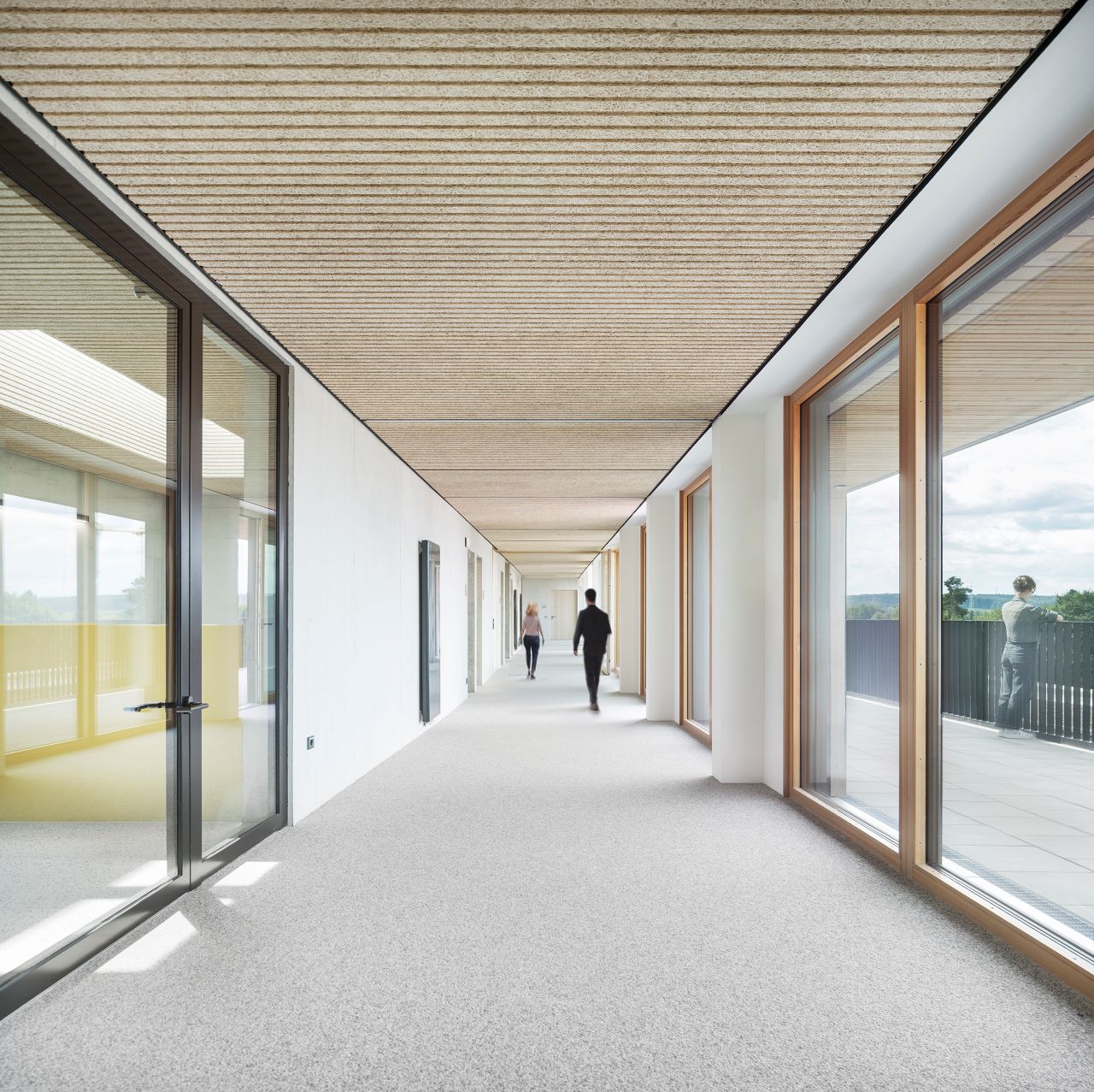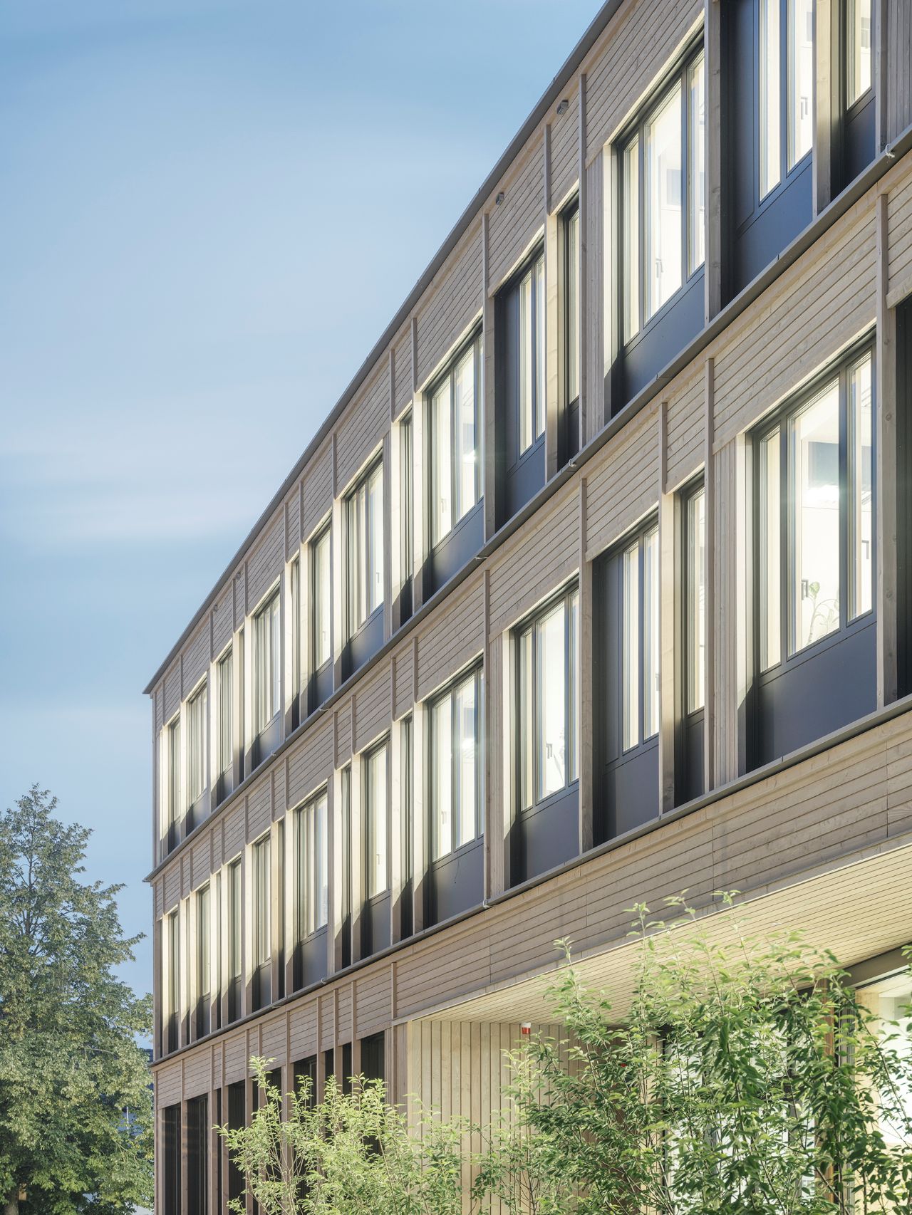 Erweiterungsneubau in Holz-Hybridbauweise mit Büros, öffentlichen Bereichen und Bestandsanbindung.