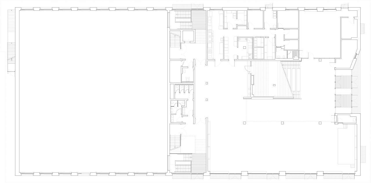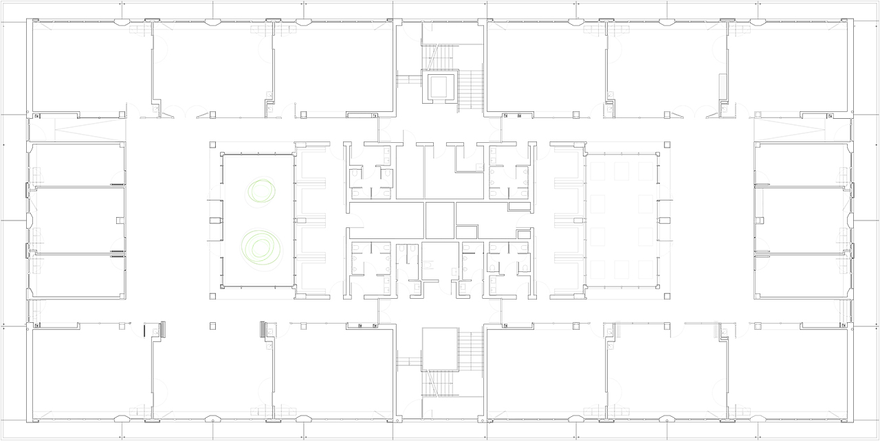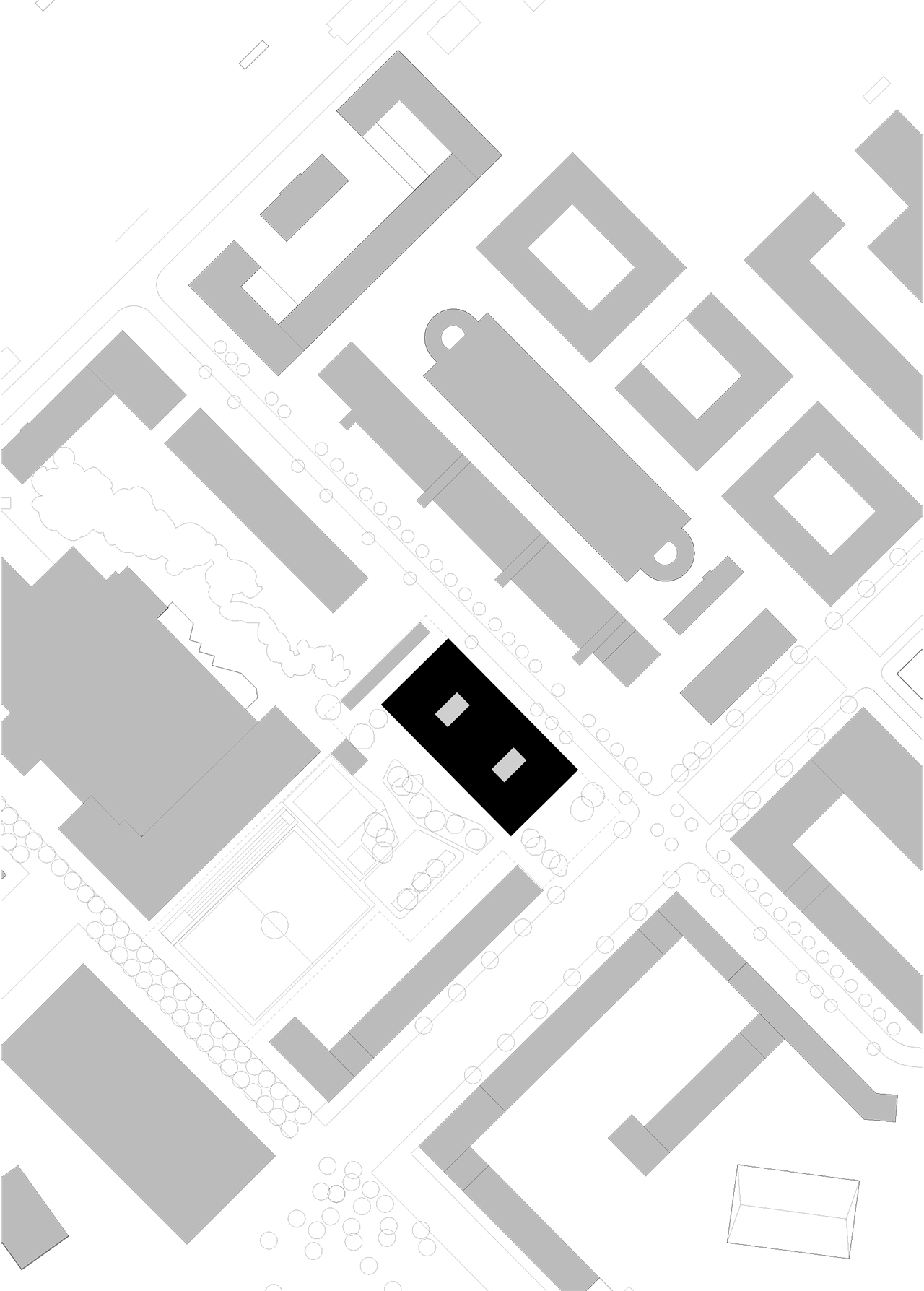 Die viergeschossige, rechteckige Grundform des Entwurfs wird strukturiert durch den zentralen Gebäudekern, zwei Lichthöfe, sowie die integrierte Sporthalle.