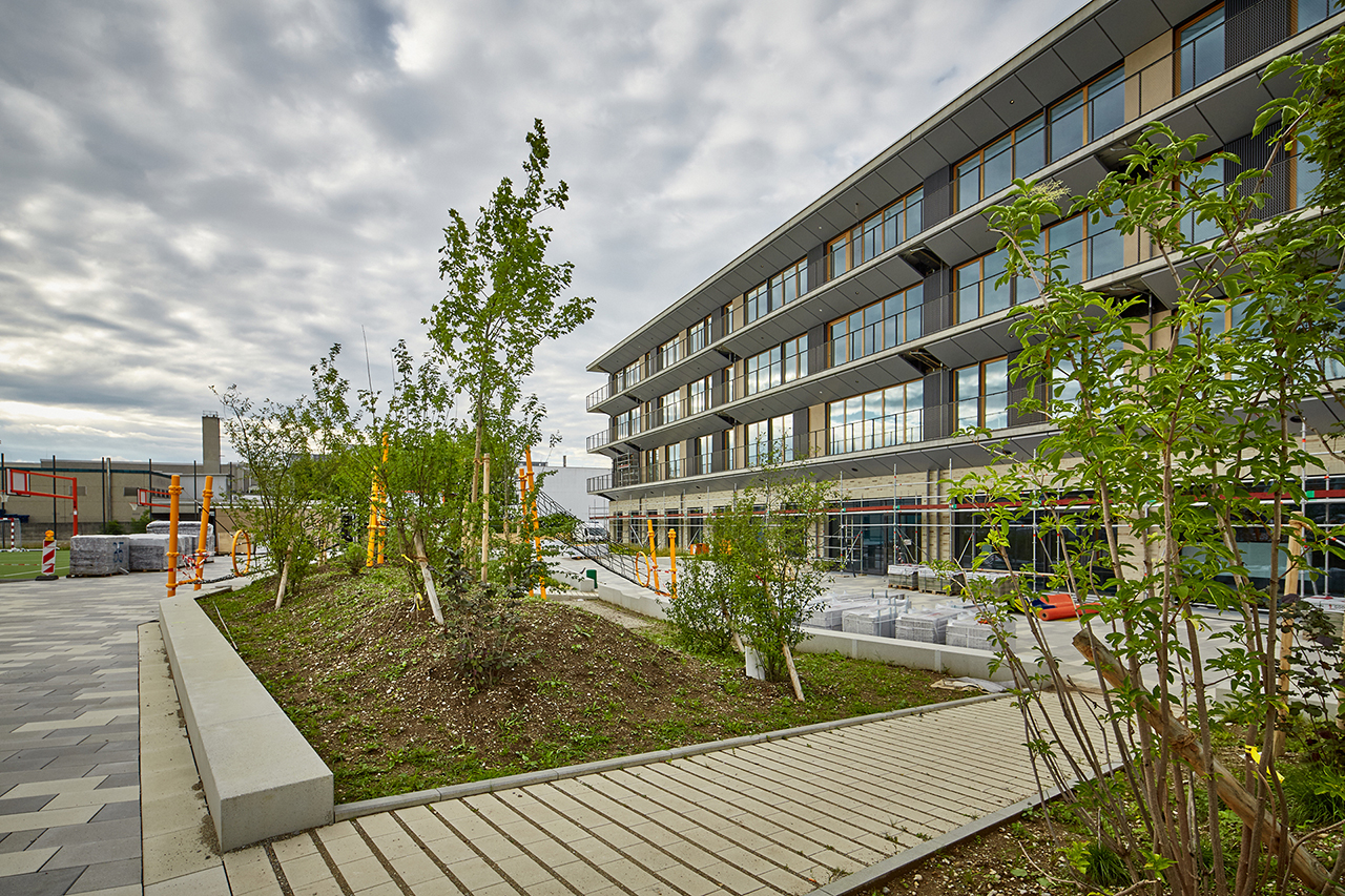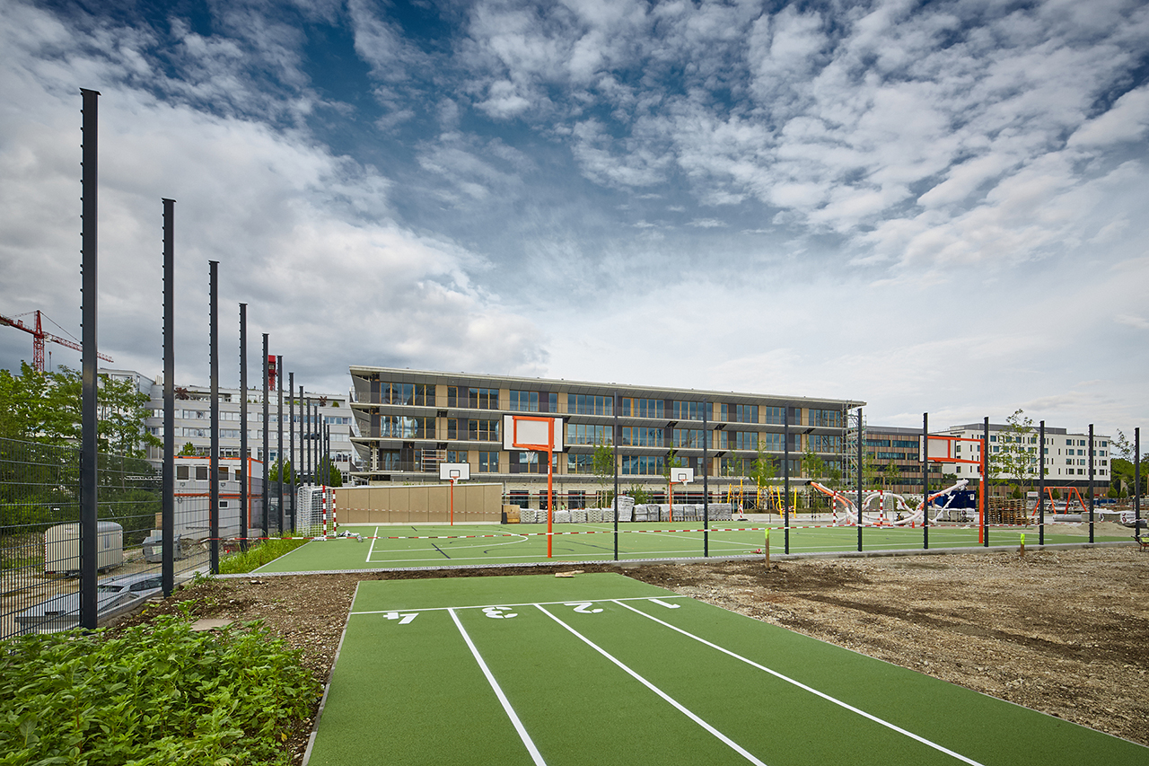 Es entstand ein mit der Nachbarschaft im Einklang, in sich geschlossenes Schulquartier, das Freiräume unterschiedlicher Nutzung, Atmosphäre und Gestalt umfasst. Dazu gehören die großzügige, zurückgesetzte Eingangssituation an der Kreuzung Haager Straße und August-Everding-Straße als sicherer, barrierefreier Platz für das Kommen und Gehen der Schulkinder, der geschützte Baumbestand als Übergang zum gegliederten Pausenhof mit Aktionsbereichen, Allwetterplatz und Ruhezonen sowie die große Sportfreifläche mit angrenzender 50-Meter-Laufbahn, welche sich im Süden zum Piusanger orientiert.