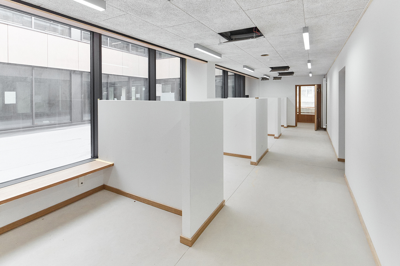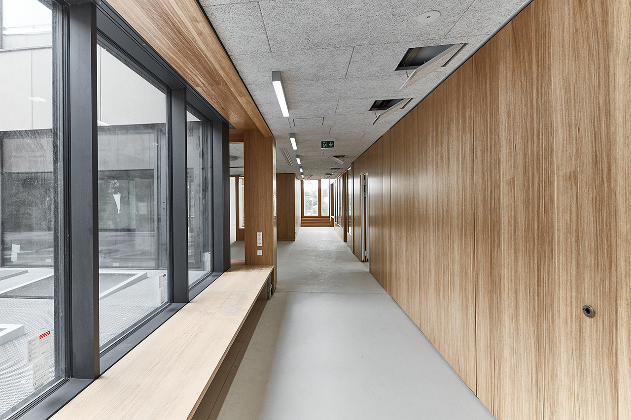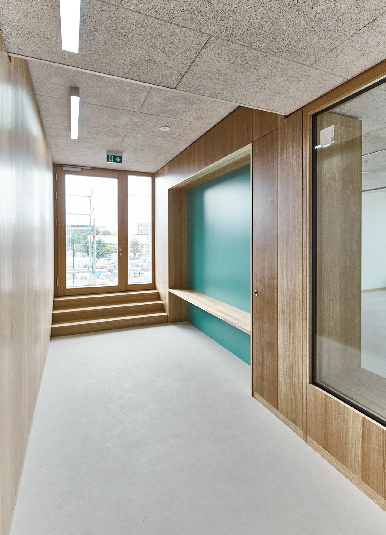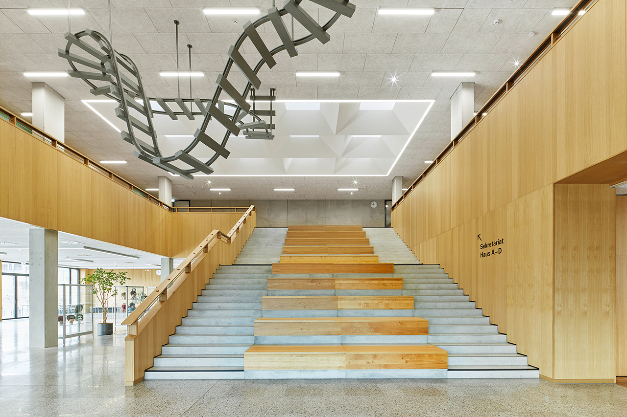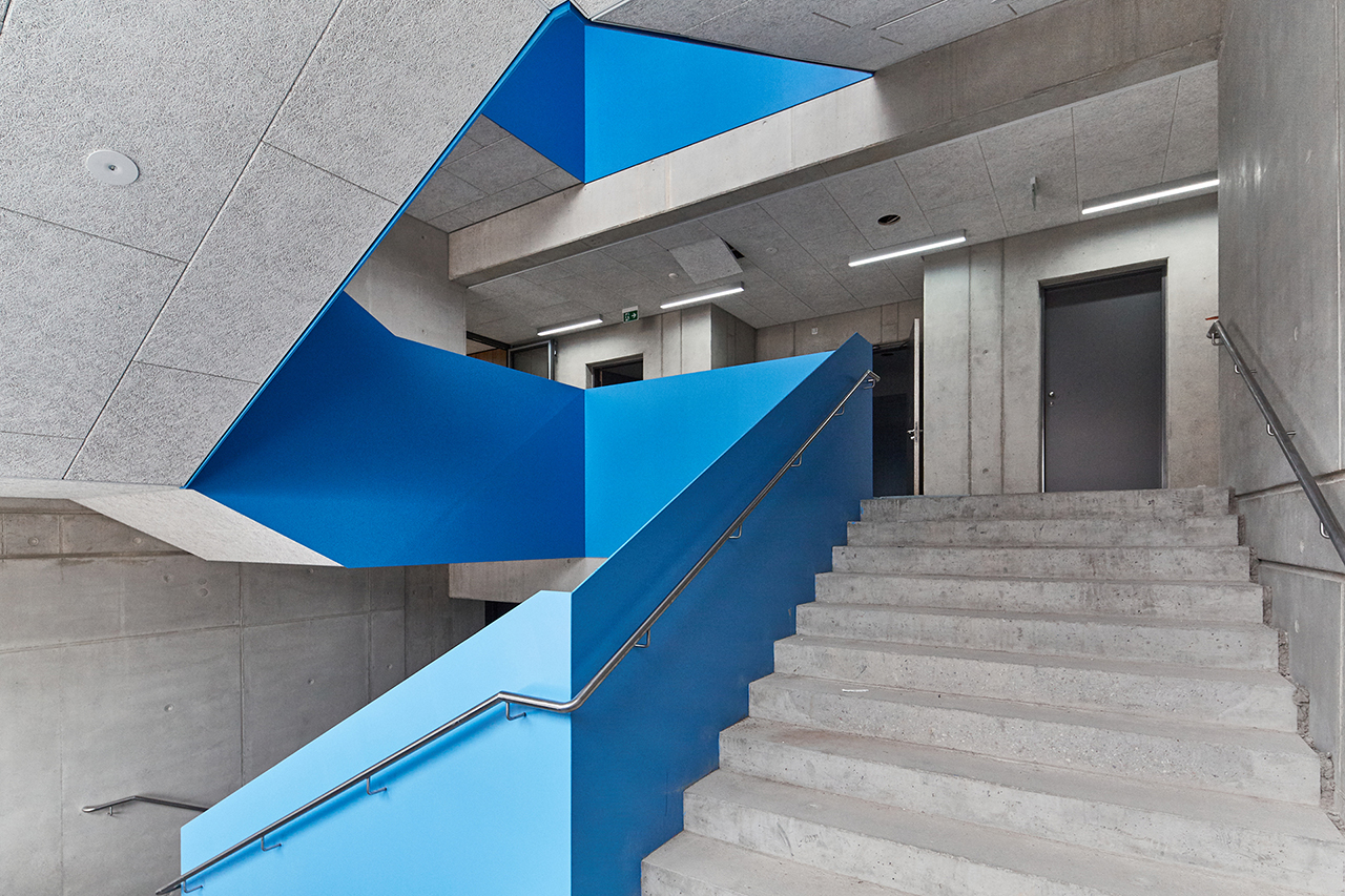 Der Schulneubau liegt im industriell geprägten Bereich des Ostbahnhofs mit seinen großvolumigen Versorgungstypologien. Er reagiert auf diesen Kontext mit einer Interpretation von Massigkeit und deren Auflösung. Gleichzeitig vermittelt er durch seine vertikale und horizontale Staffelung zwischen öffentlichen, halböffentlichen und schulinternen Bereichen.