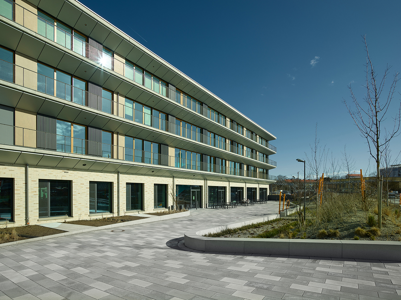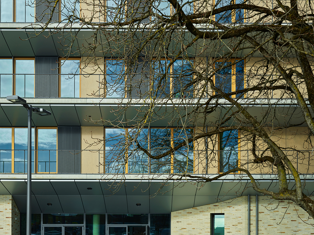 Die Fassade spiegelt die unterschiedlichen Gebäudezonen wieder. Das Erdgeschoss wird als massiv anmutendes Sockelgeschoss ausgeführt. Die Obergeschosse stehen im Kontrast dazu mit ihrer leichten, offenen Gestaltung. Als gebäudeumschließendes Element fallen die umlaufenden Fluchtbalkone ins Auge. Diese sind aus brandschutztechnischer Sicht erforderlich und strukturieren das Gebäude horizontal.