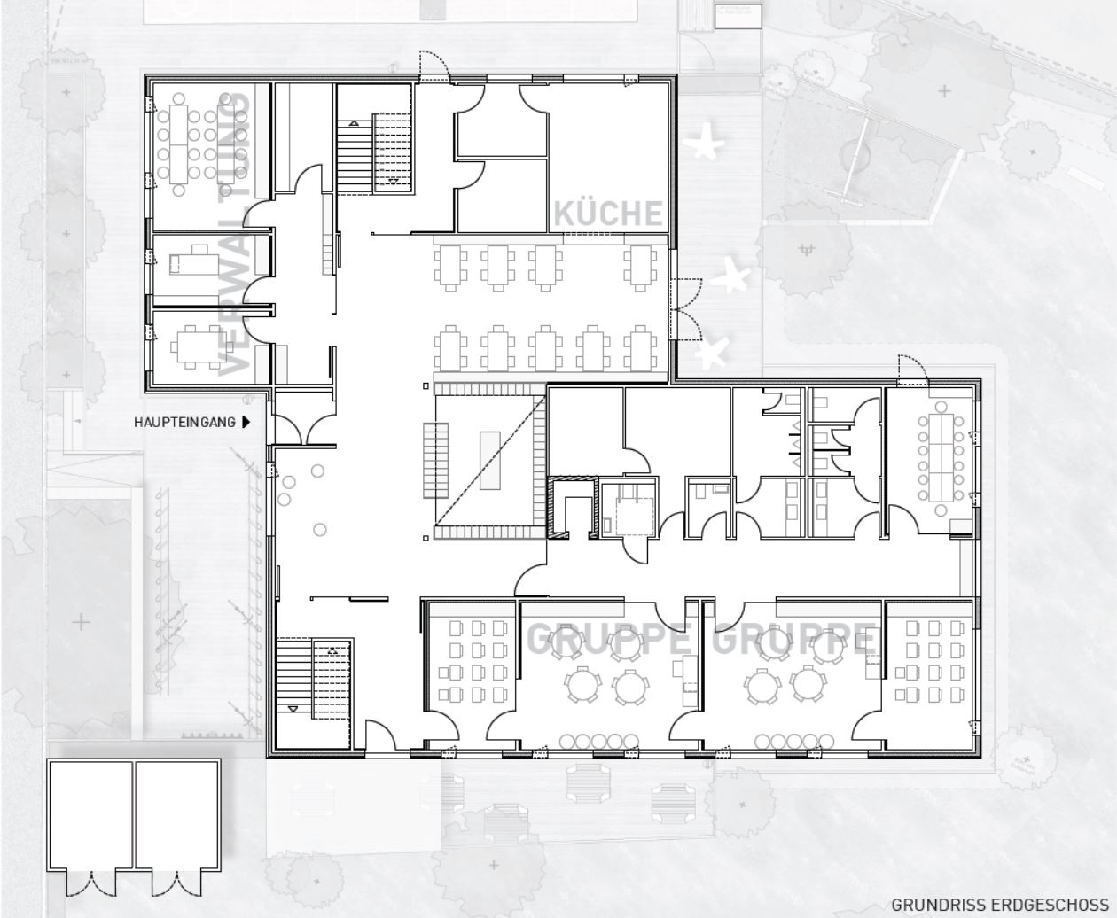 Im Norden des Erdgeschosses befindet sich in Eingangsnähe der Verwaltungsbereich mit Personalraum, Leiterinnenbüro, sowie Elternsprechzimmer. Ebenfalls im nördlichen Teil verortet, befindet sich die Küche mit angrenzendem Speisesaal, welcher eine großzügige Verglasung mit Zugang zum östlichen Garten erhält.