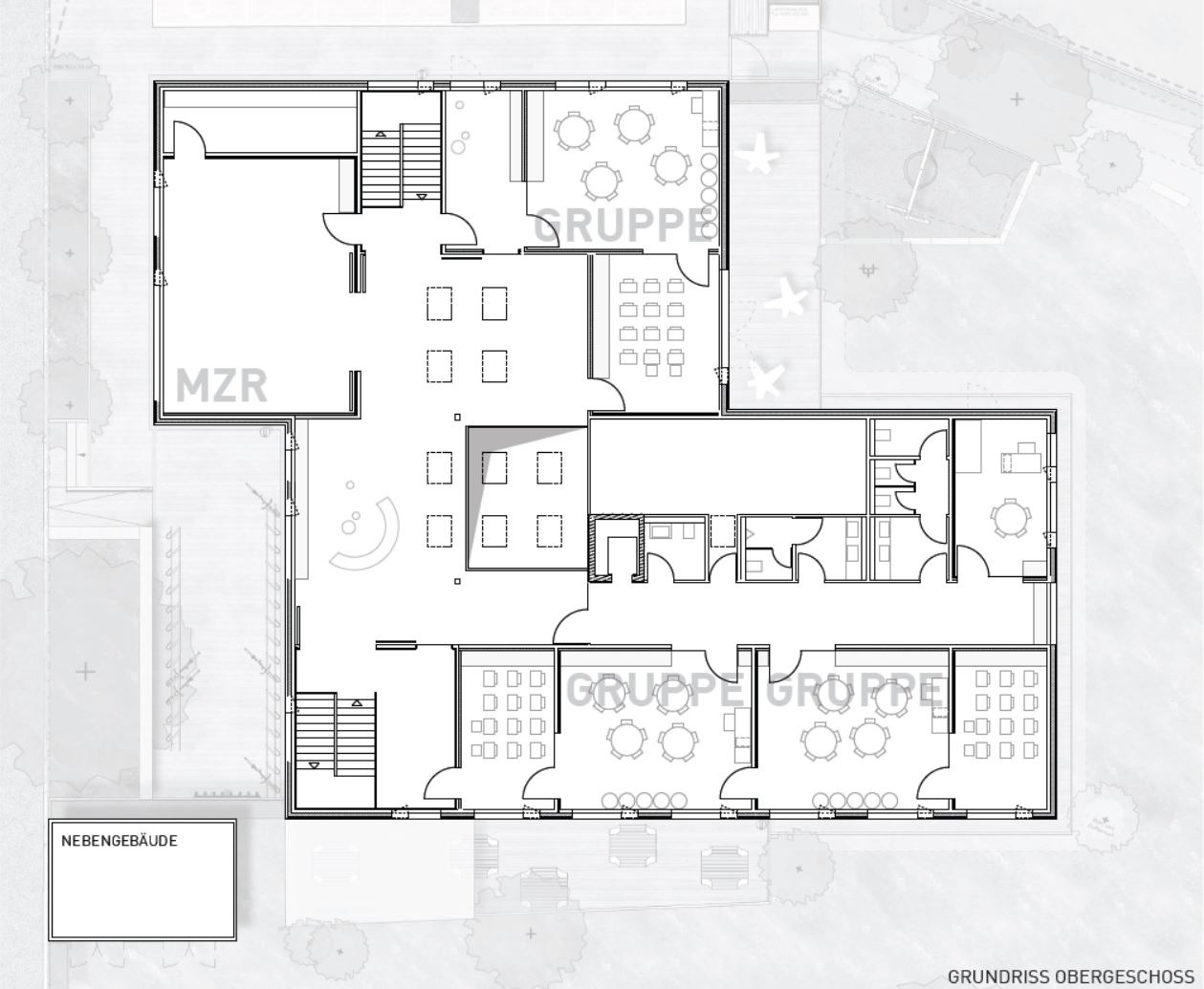 Alle Gruppenräume bilden eine Einheit aus Gruppenhaupt- und -Nebenraum welcher als Hausaufgabenraum genutzt werden kann. Die Gruppenräume befinden sich Großteils entlang der Südfassade des Gebäudes. Um die Kinder und somit auch den entstehenden Lärm im Haus gleichmäßiger zu streuen, sind die Gruppenräume über beide Geschosse verteilt. Es befinden sich 2 Gruppenräume im südlichen Erdgeschoss, an identischer Stelle 2 Gruppenräume im südlichen Obergeschoss, sowie ein weiterer Gruppenraum im Nord-Ost-Teil des Obergeschosses.