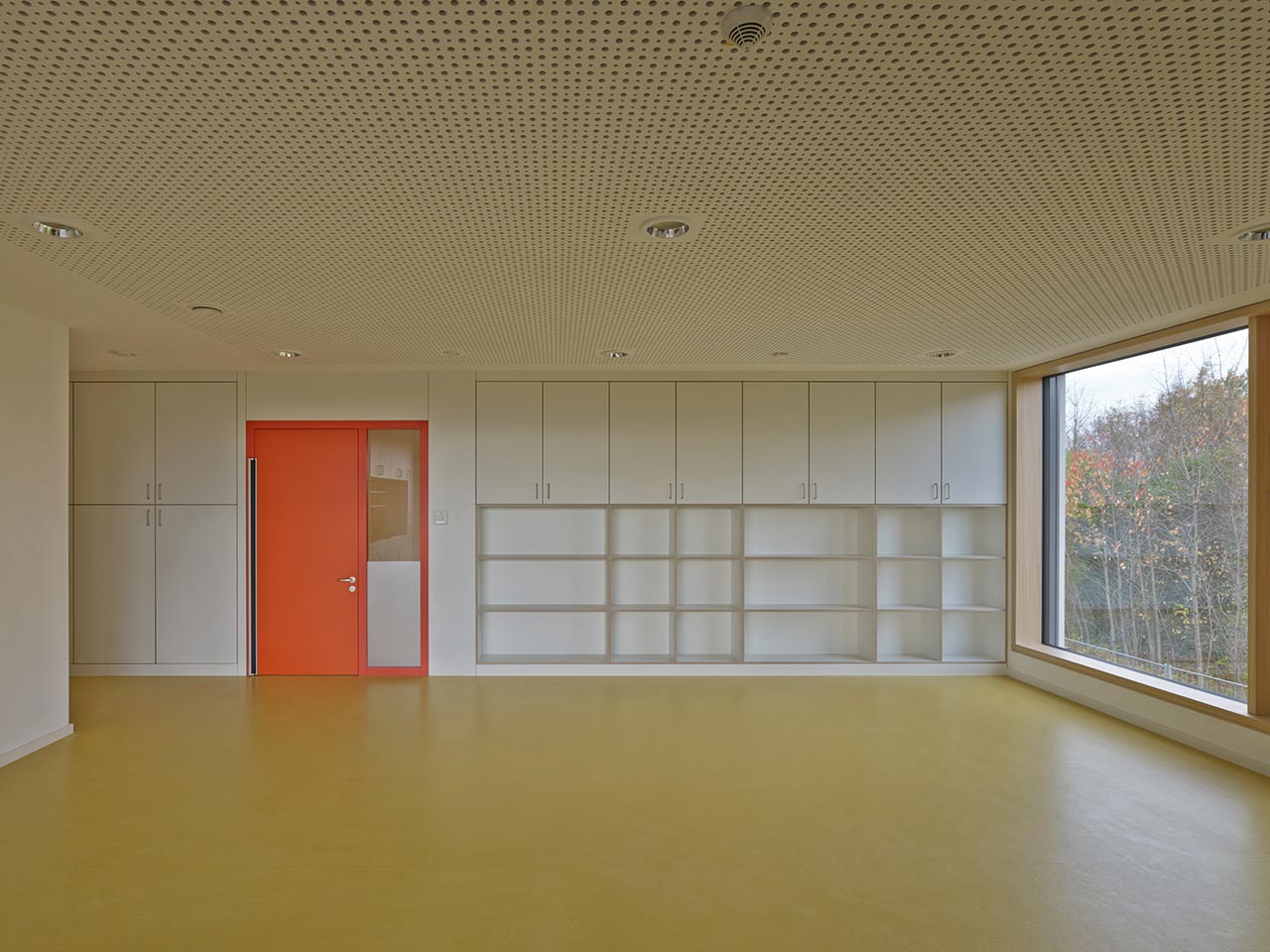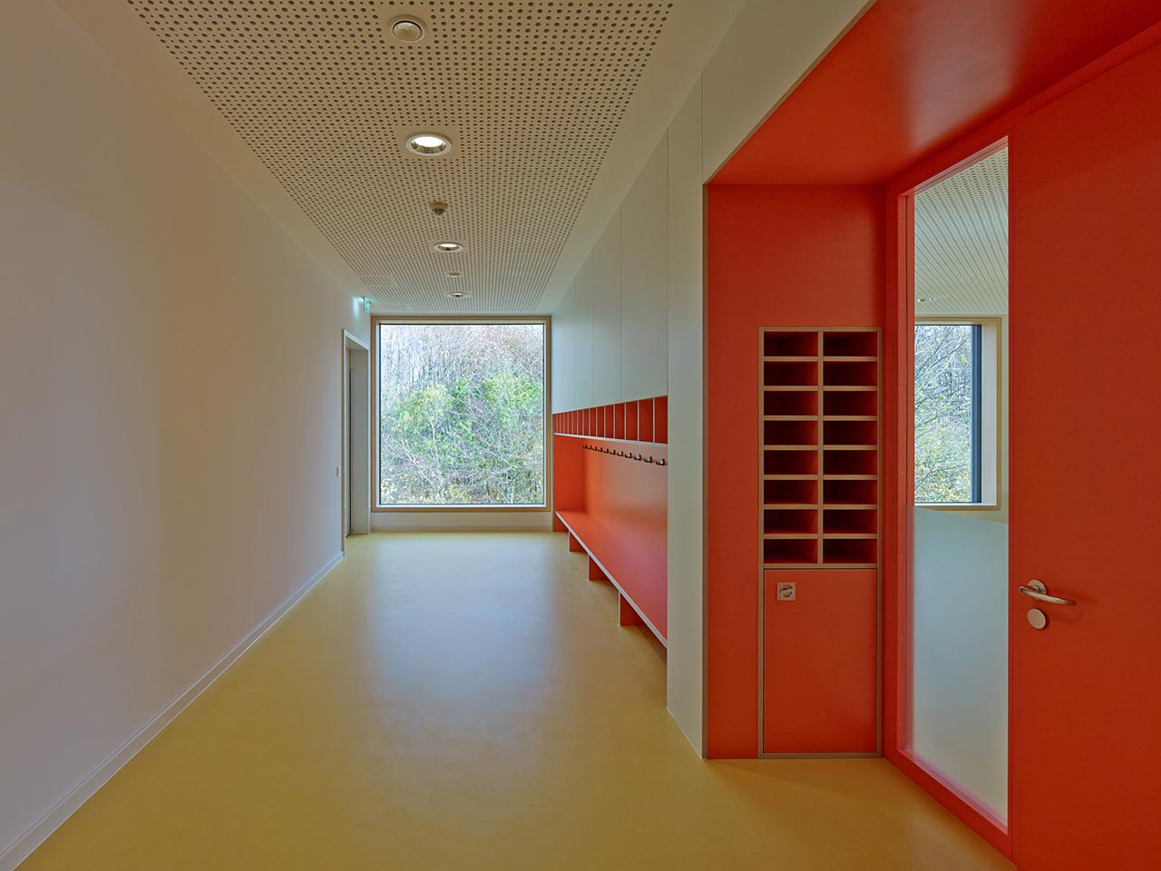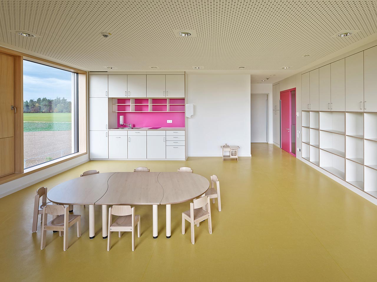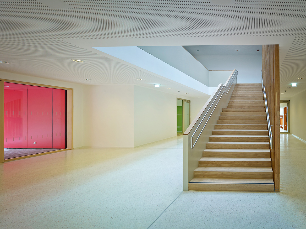 Die schlichte Raumdisposition aus den verschiedenen Gruppenräumen, die sich um den Zentralraum orientieren, steht im gelungenen Einklang mit der simplen Farbigkeit und dezenten Kombination mit der Materialität.