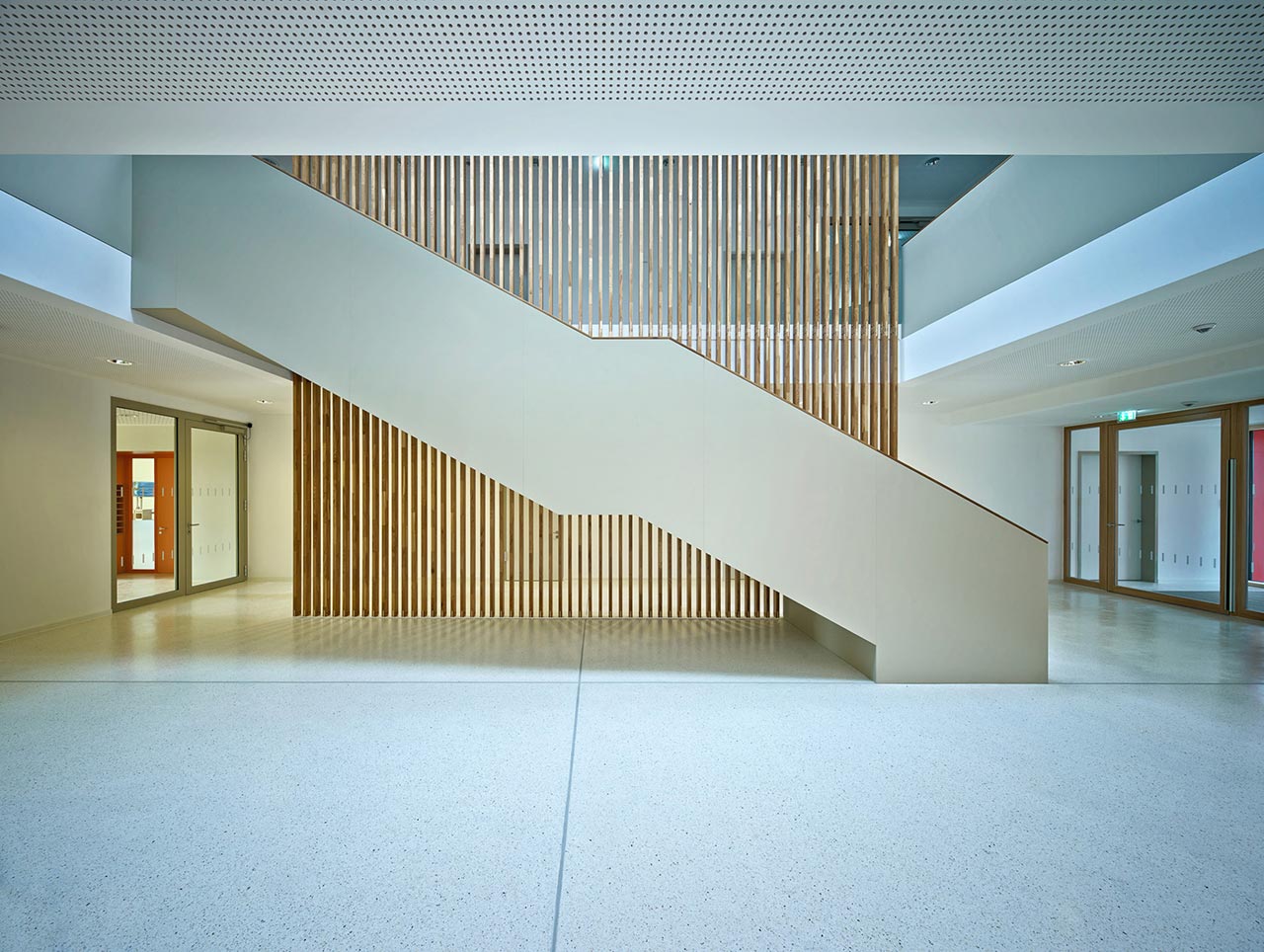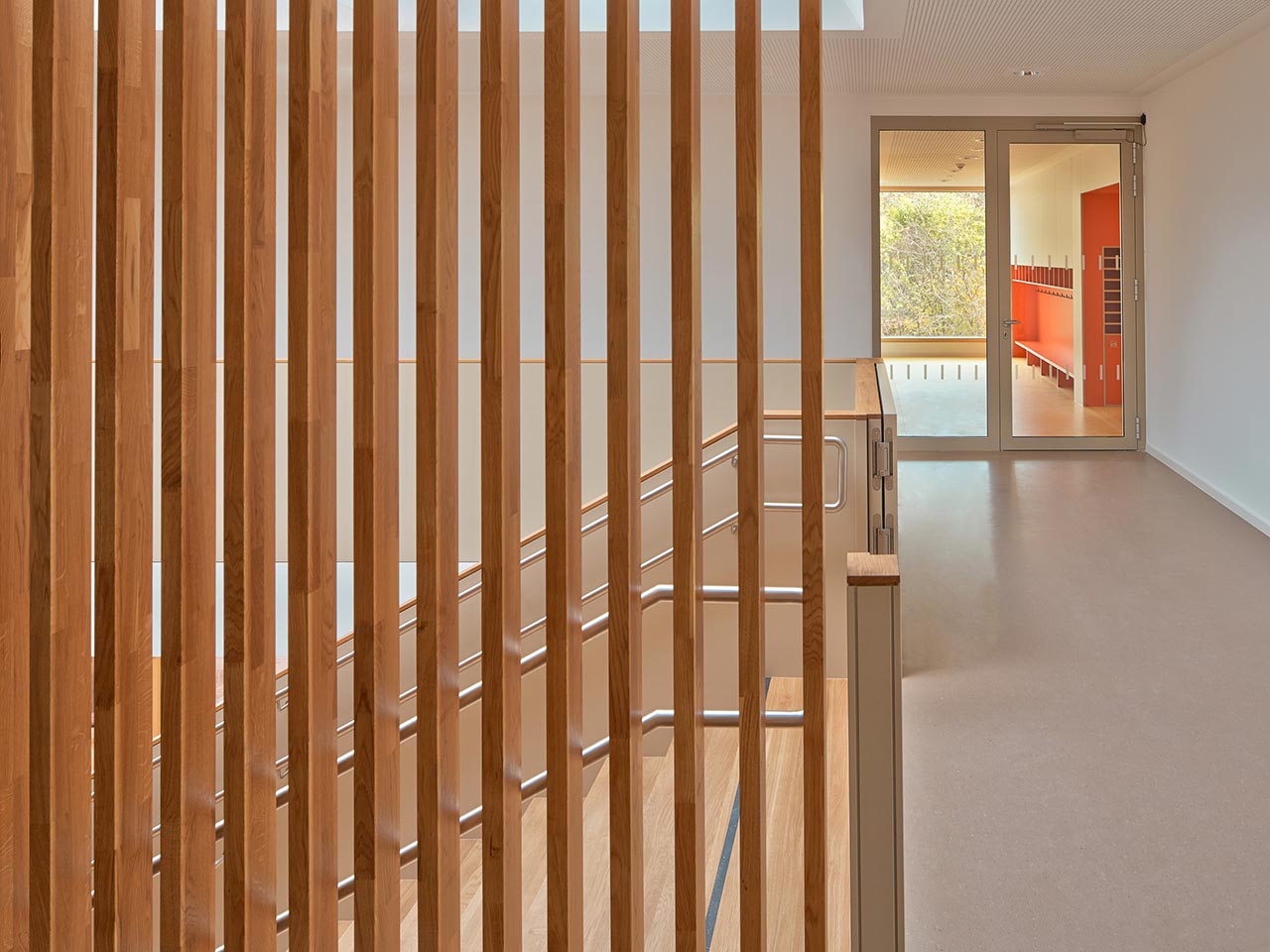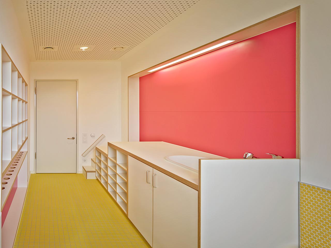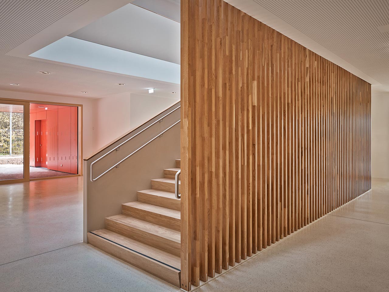 Die schlichte Raumdisposition aus den verschiedenen Gruppenräumen, die sich um den Zentralraum orientieren, steht im gelungenen Einklang mit der simplen Farbigkeit und dezenten Kombination mit der Materialität.
