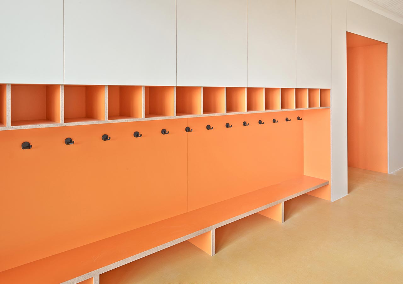 Die differenzierte Farbgebung der Tischlereinbauten schafft individuelle Erkennbarkeit.