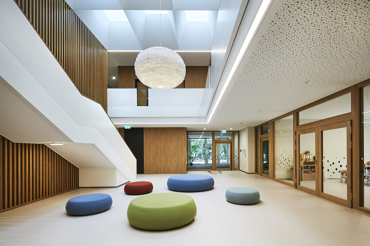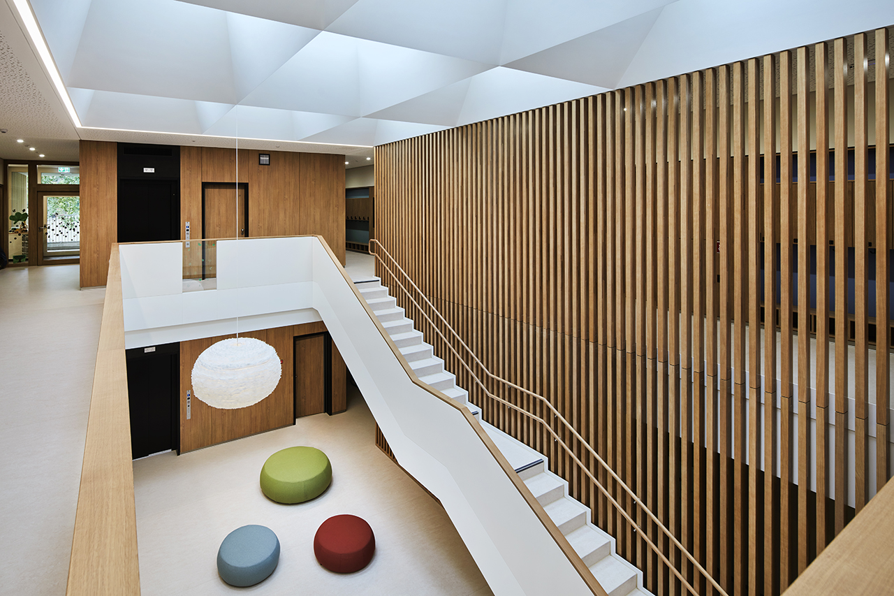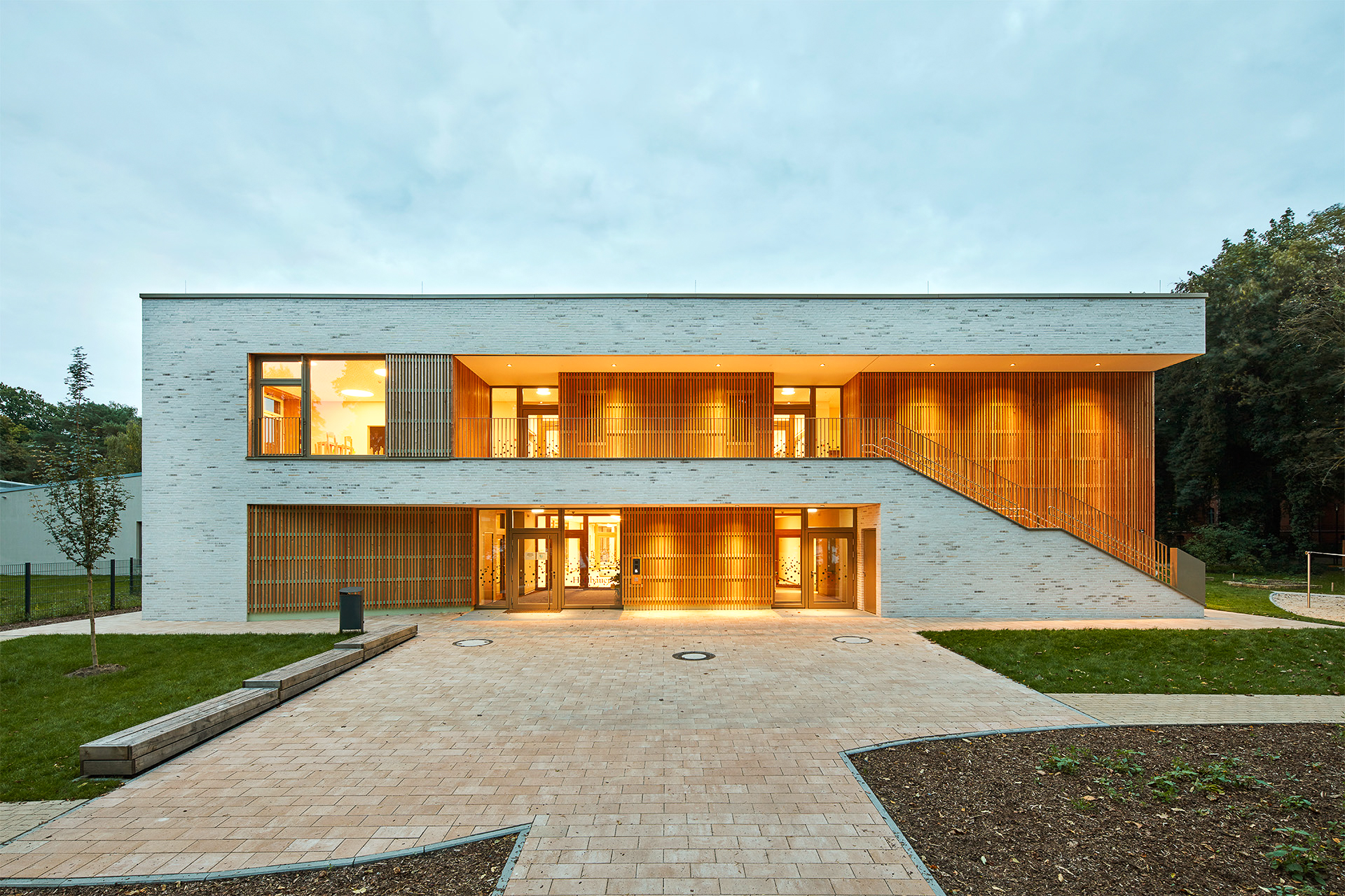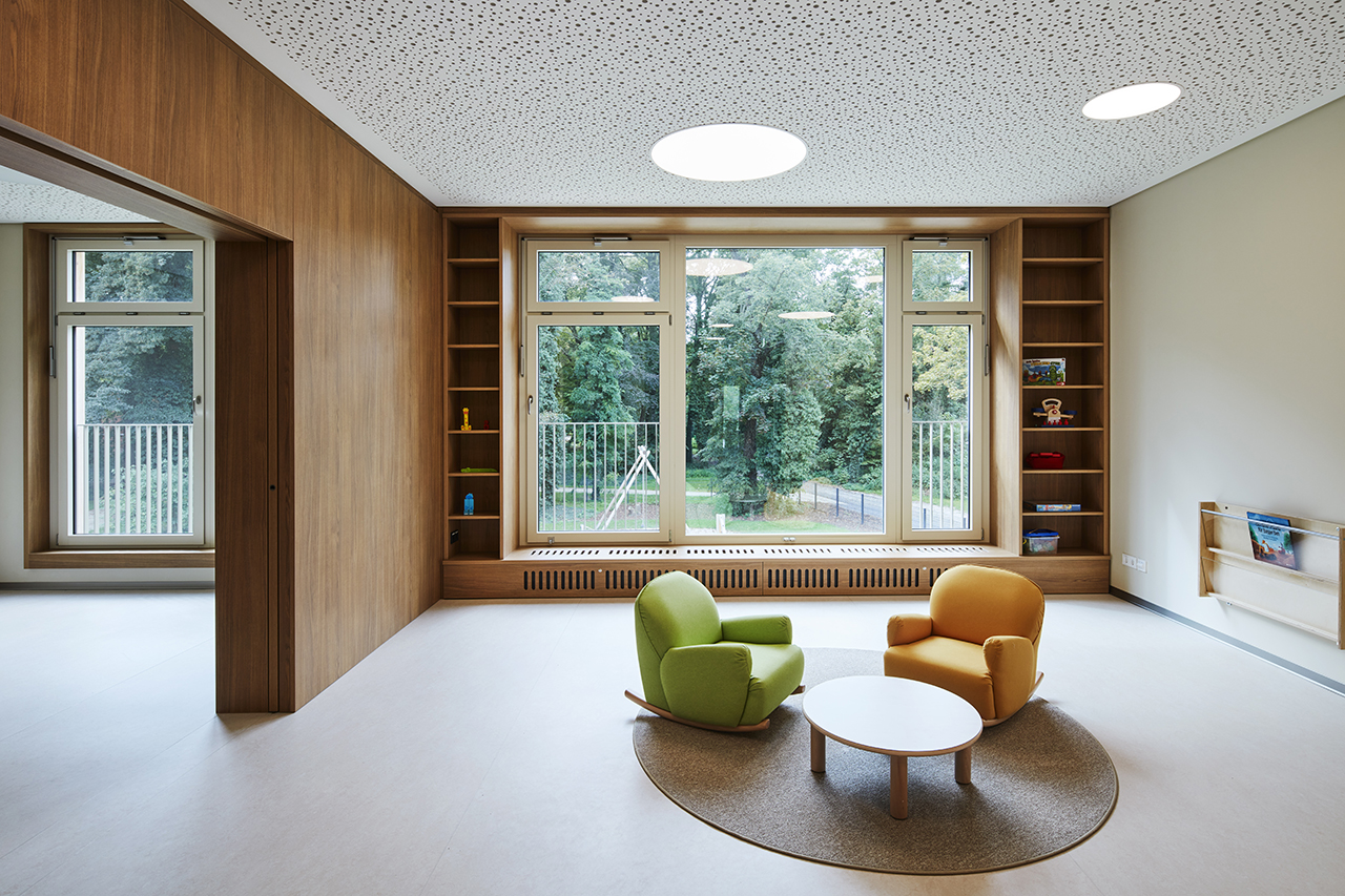 Östlich von München, im oberbayrischen Landkreis Ebersberg, liegt die Gemeinde Vaterstetten. Der zweigeschossige, fast quadratische Baukörper der Kinderkrippe mit Passivhausniveau bietet Platz für fünf Kindergruppen und rückt im Norden von der Verlängerung des Birkenwegs ab, um Platz für den ruhenden Verkehr zu schaffen.