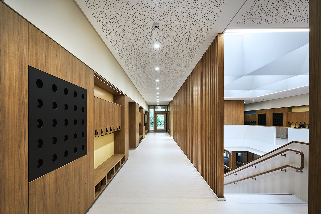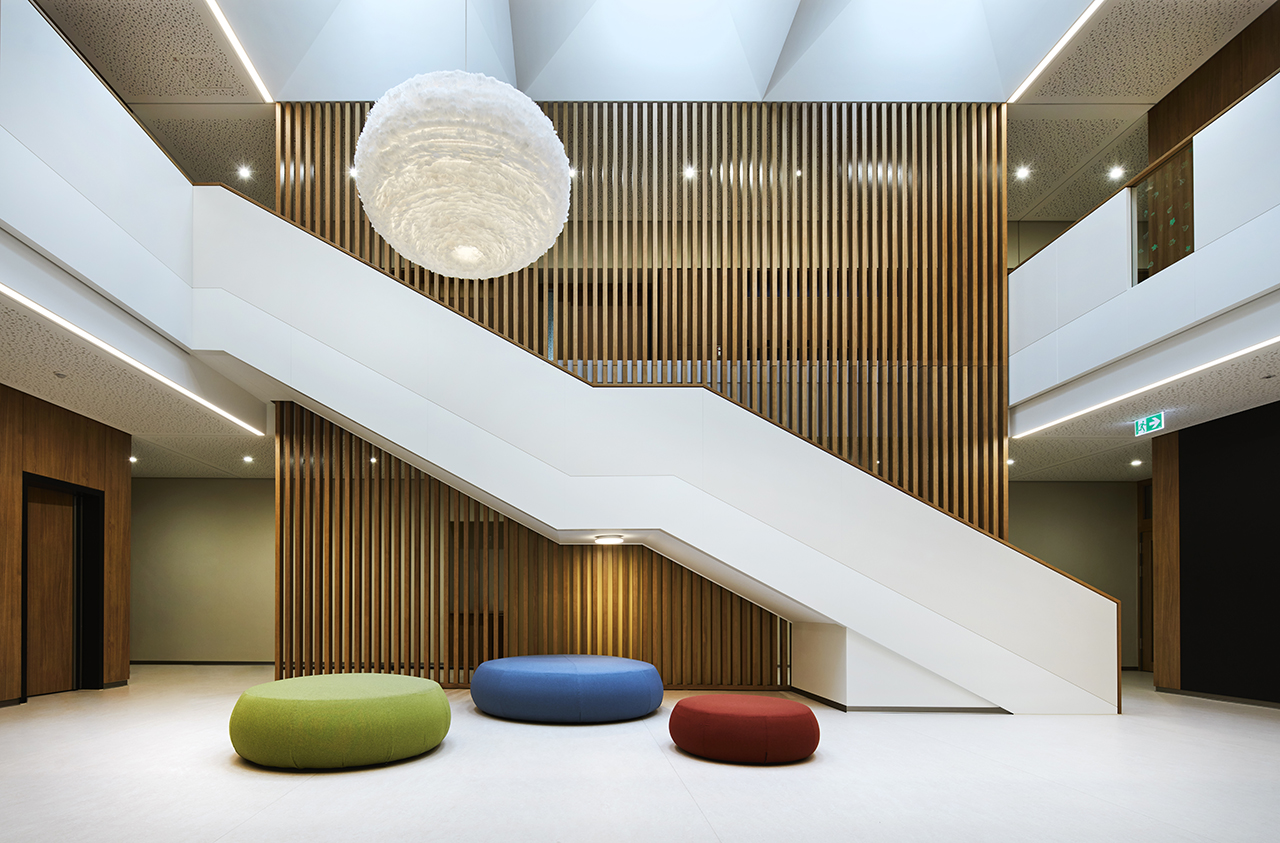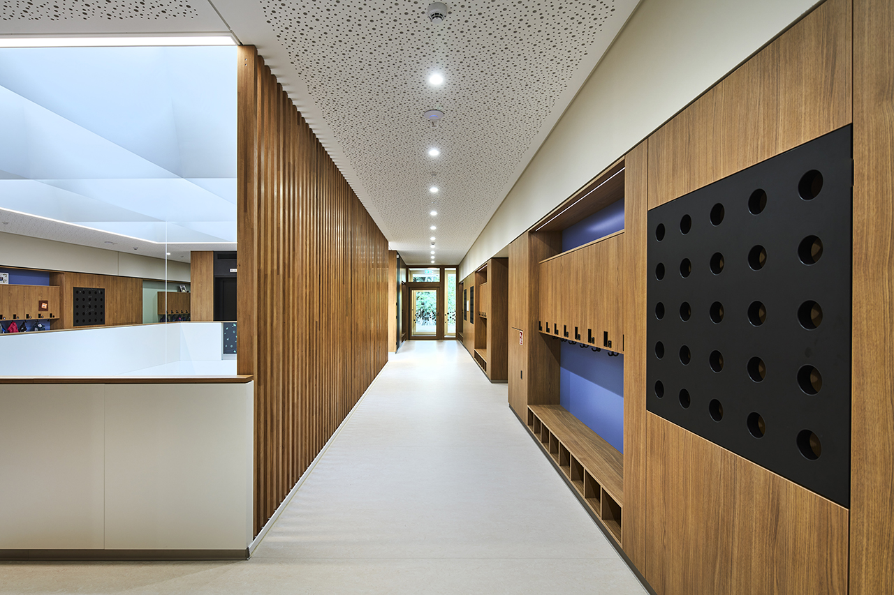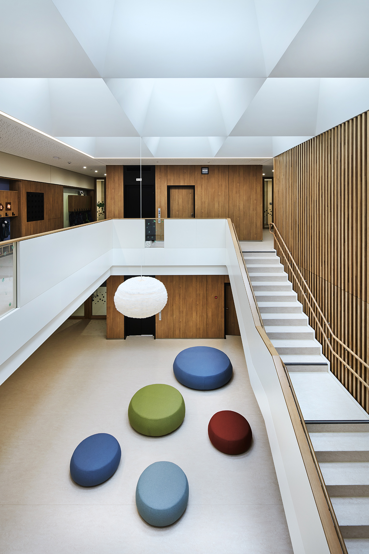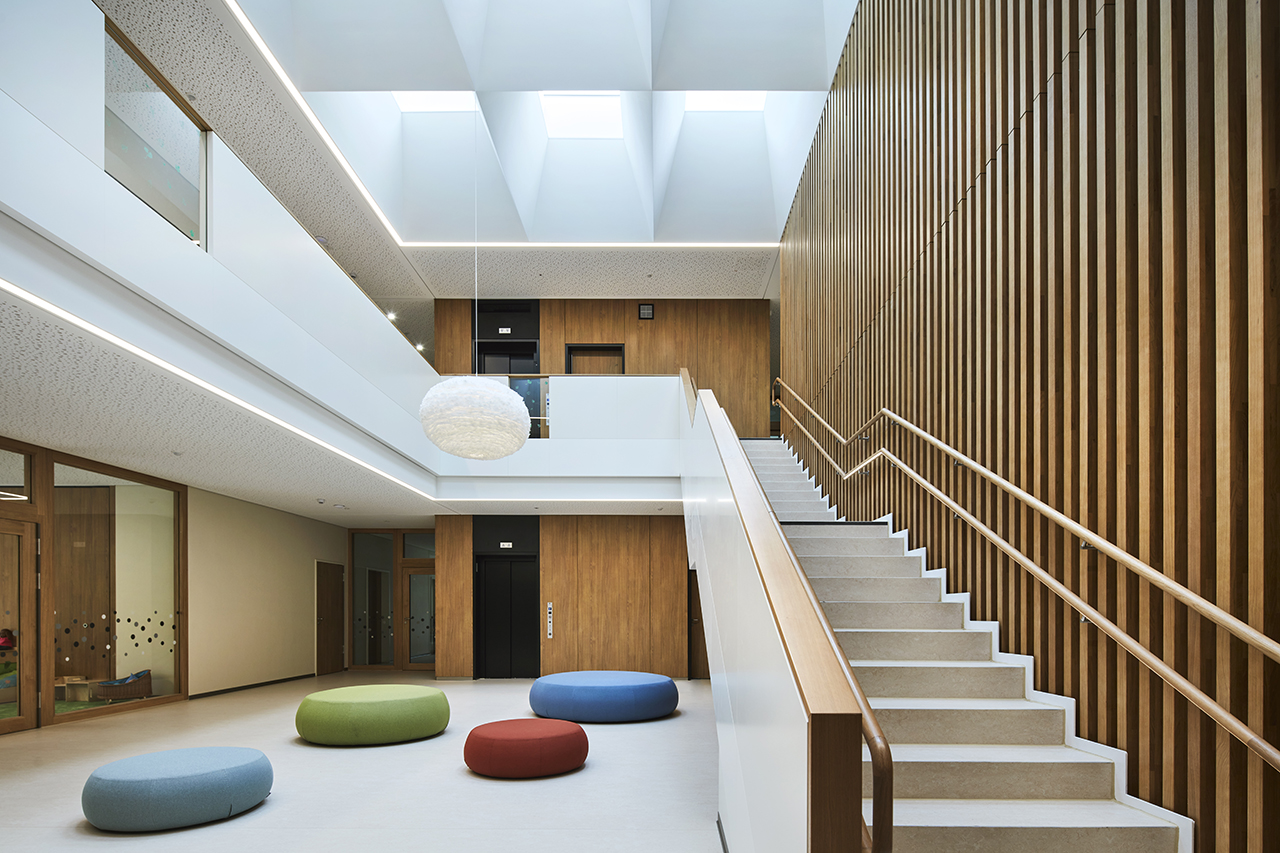 Östlich von München, im oberbayrischen Landkreis Ebersberg, liegt die Gemeinde Vaterstetten. Der zweigeschossige, fast quadratische Baukörper der Kinderkrippe mit Passivhausniveau bietet Platz für fünf Kindergruppen und rückt im Norden von der Verlängerung des Birkenwegs ab, um Platz für den ruhenden Verkehr zu schaffen.