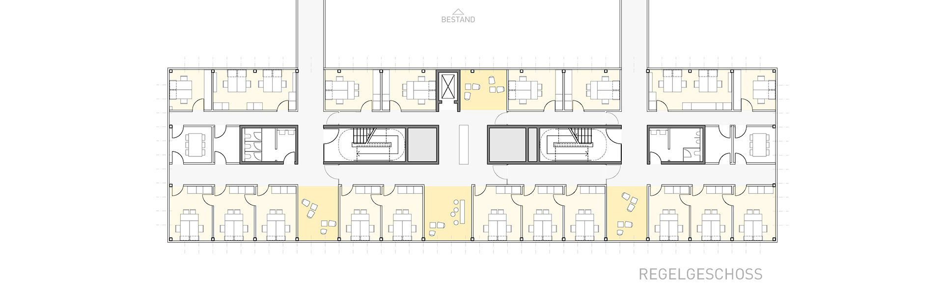 Wie die meisten öffentlichen Verwaltungen nutzt das Landratsamt an seinen heutigen Standorten eine klassische Zellenbürostruktur mit Mittelflur. Der 16 m tiefe Erweiterungsbau eignet sich sehr gut zur Umsetzung neuer Bürokonzepte im Dreibundprinzip, die prospektive Möglichkeiten weg vom klassischen Büro hin zu einer modernen und offenen Arbeitswelt bieten. Mit den umlaufenden Büros und Besprechungszonen und der mittleren Service-Zone, erhält das Landratsamt nicht nur eine optimale Tageslicht- und Flächenausnutzung für möglichst viele neue Arbeitsplätze, sondern vor allem auch ein zukunftsorientiertes Raumkonzept mit räumlicher und organisatorischer Flexibilität der Flächennutzung künftiger Anforderungen.