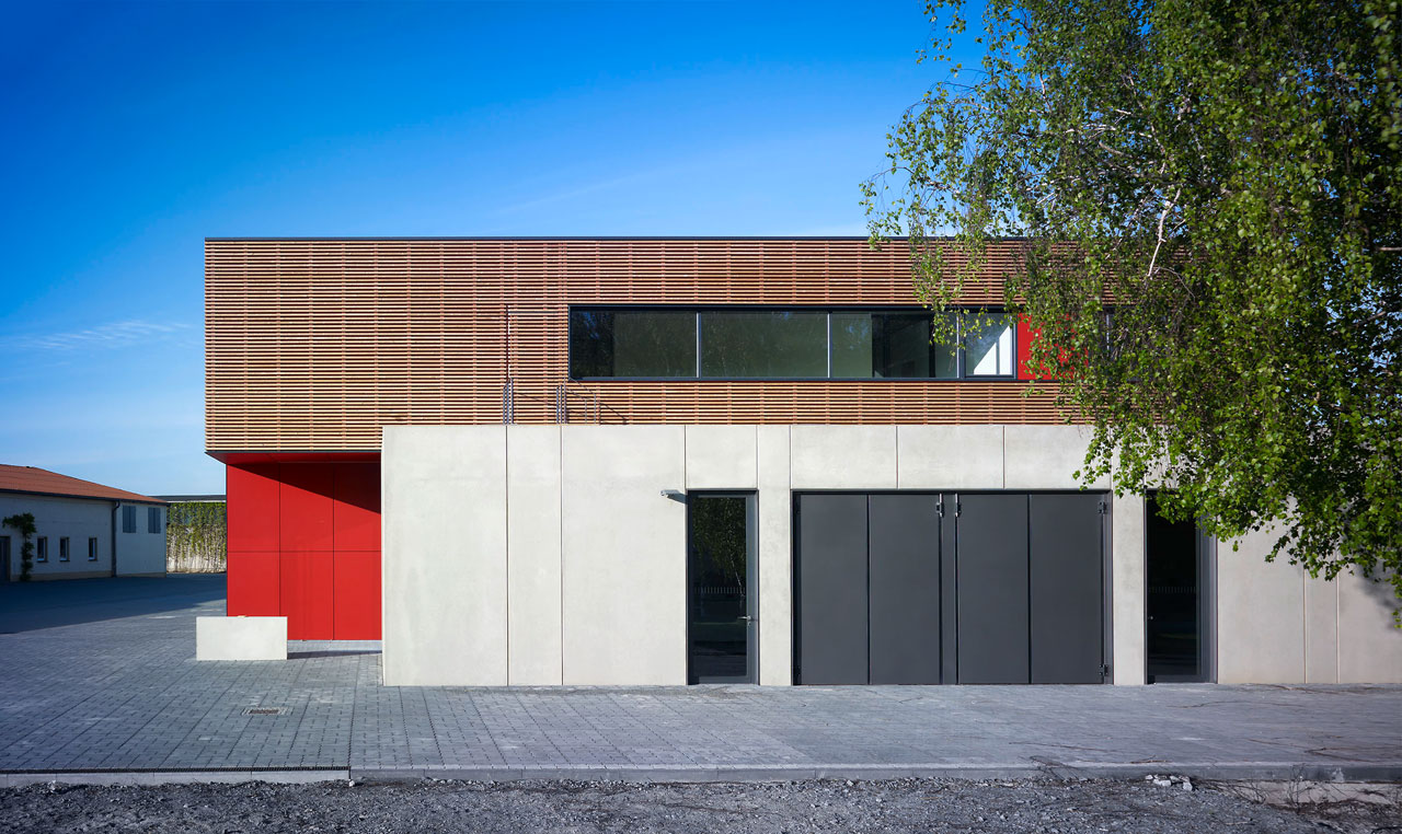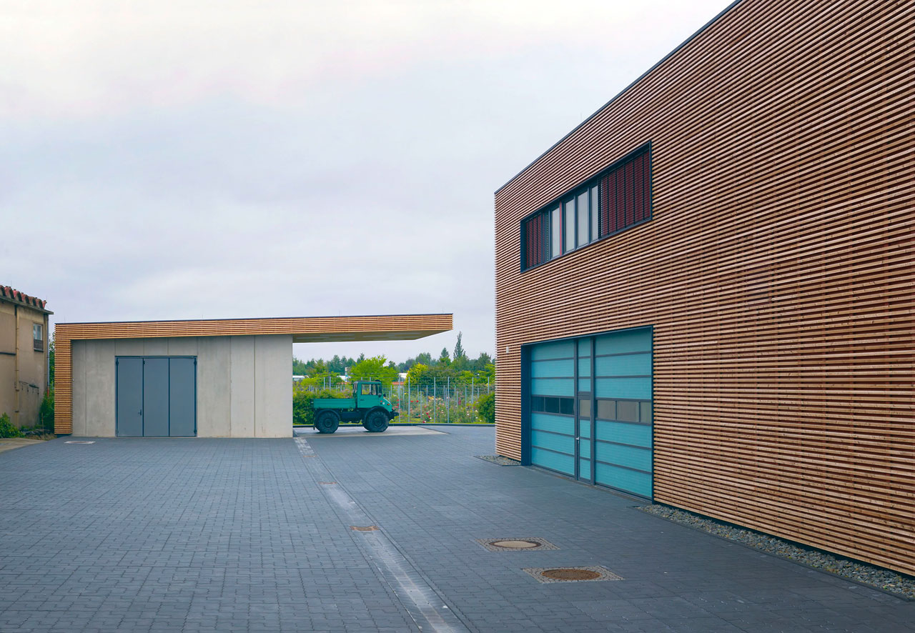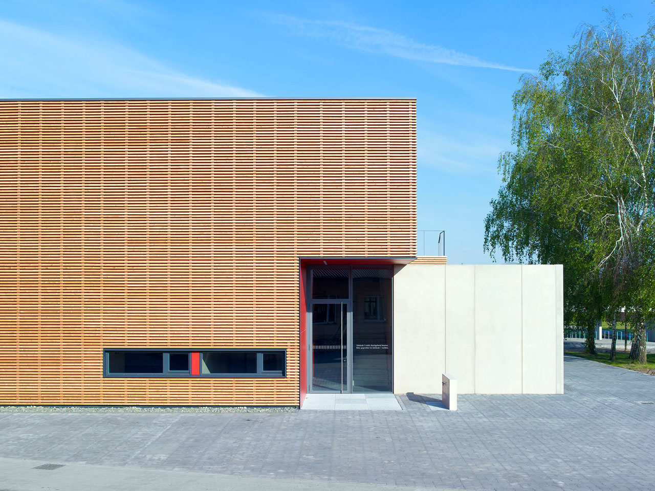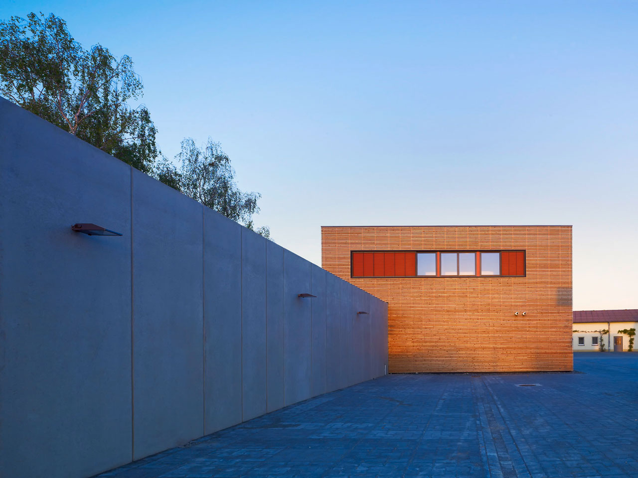 Die beiden Gebäudeteile zeigen sich auch in ihrer äußeren Gestalt unterschiedlich, wobei grundsätzlich ein rauer Werkstattcharakter angestrebt wurde. Dies gestaltet sich in der Außenfassade durch Industriesichtbeton als wirtschaftliche Fertigteil-Sandwich-Konstruktion mit Kerndämmung und angeformter Attika. An dem eingeschossigen Baukörper wurde der Sichtbeton rhythmisch durch Fugenteilungen strukturiert und die Naturfarbigkeit belassen, was eine gewisse „Bodenhaftung“ und „Schwere“ vermittelt. Dieser massiven und eher statischen Erscheinung steht der höhere Gebäudeteil entgegen, welcher sich teilweise über den langgestreckten flachen Riegel schiebt. Die naturbelassene Lärchenlamellenverkleidung bietet die Möglichkeit einer Fassadenbegrünung, bekommt dadurch eine landschaftsbezogene Betonung.