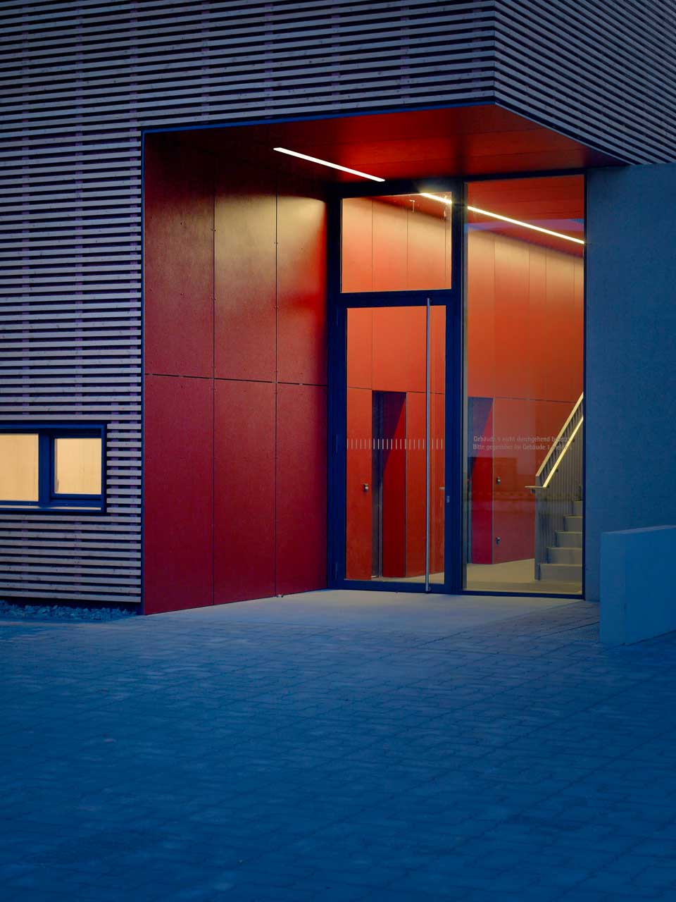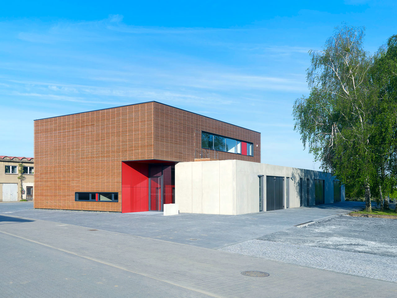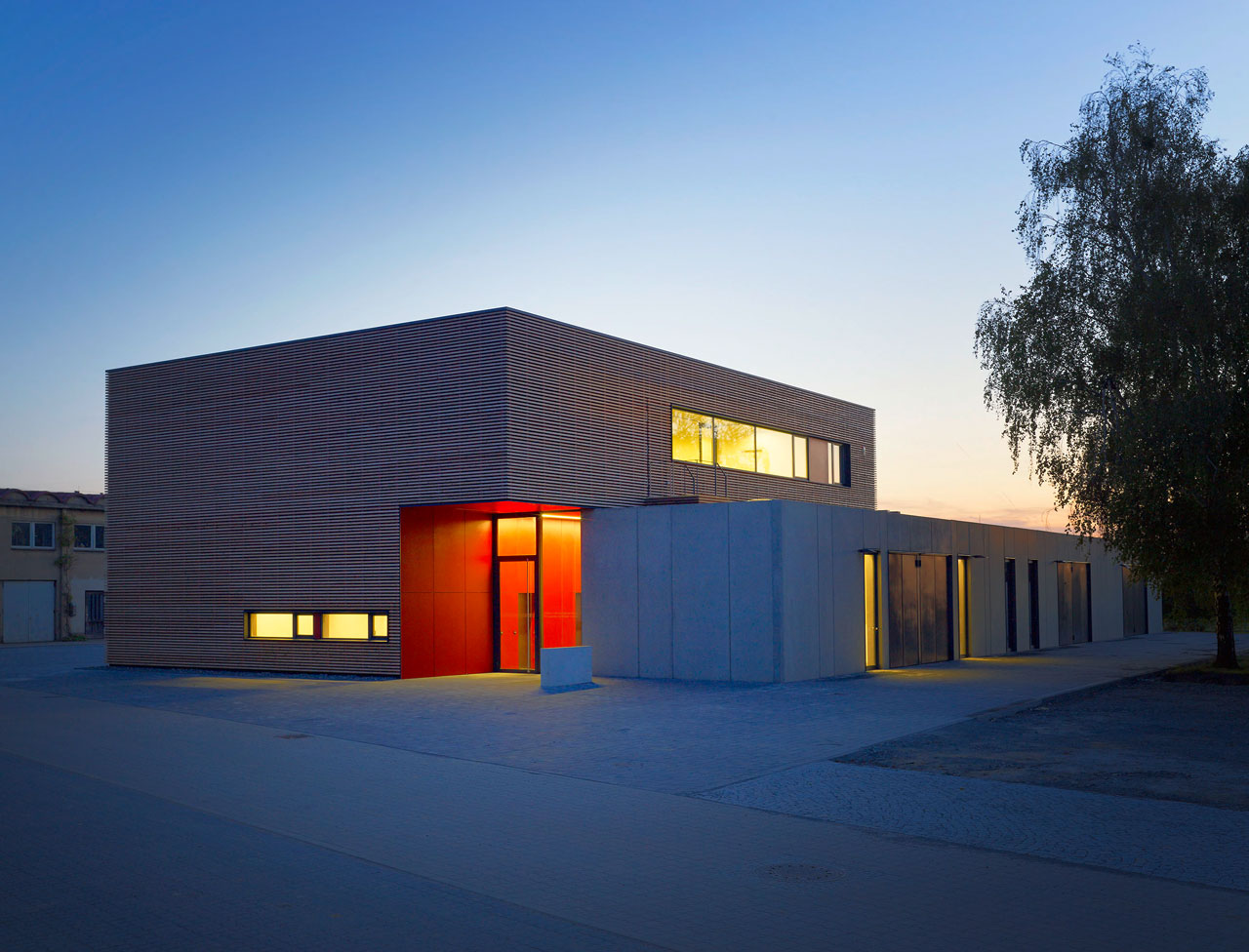 Die beiden Gebäudeteile zeigen sich auch in ihrer äußeren Gestalt unterschiedlich, wobei grundsätzlich ein rauer Werkstattcharakter angestrebt wurde. Dies gestaltet sich in der Außenfassade durch Industriesichtbeton als wirtschaftliche Fertigteil-Sandwich-Konstruktion mit Kerndämmung und angeformter Attika. An dem eingeschossigen Baukörper wurde der Sichtbeton rhythmisch durch Fugenteilungen strukturiert und die Naturfarbigkeit belassen, was eine gewisse „Bodenhaftung“ und „Schwere“ vermittelt. Dieser massiven und eher statischen Erscheinung steht der höhere Gebäudeteil entgegen, welcher sich teilweise über den langgestreckten flachen Riegel schiebt. Die naturbelassene Lärchenlamellenverkleidung bietet die Möglichkeit einer Fassadenbegrünung, bekommt dadurch eine landschaftsbezogene Betonung.