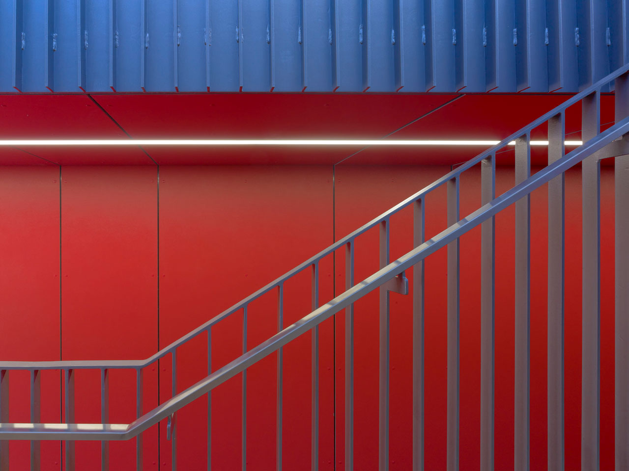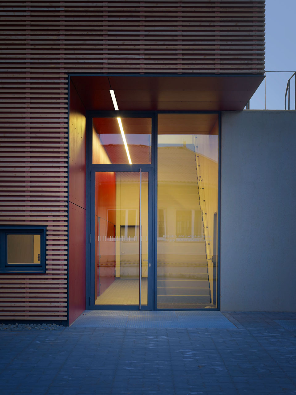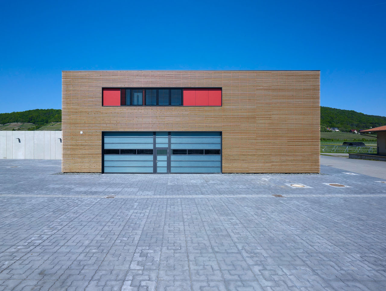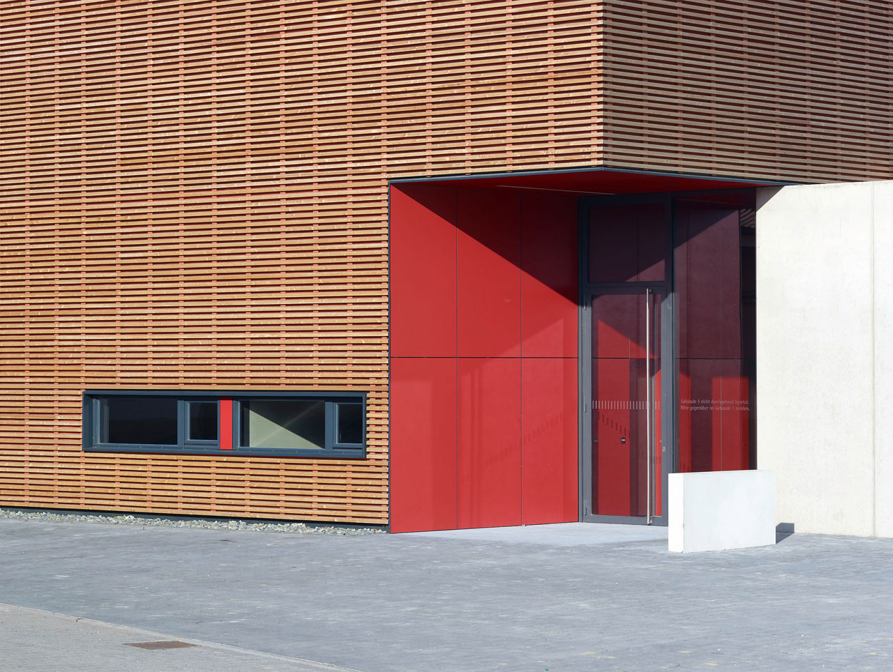 Die beiden Gebäudeteile zeigen sich auch in ihrer äußeren Gestalt unterschiedlich, wobei grundsätzlich ein rauer Werkstattcharakter angestrebt wurde. Dies gestaltet sich in der Außenfassade durch Industriesichtbeton als wirtschaftliche Fertigteil-Sandwich-Konstruktion mit Kerndämmung und angeformter Attika. An dem eingeschossigen Baukörper wurde der Sichtbeton rhythmisch durch Fugenteilungen strukturiert und die Naturfarbigkeit belassen, was eine gewisse „Bodenhaftung“ und „Schwere“ vermittelt. Dieser massiven und eher statischen Erscheinung steht der höhere Gebäudeteil entgegen, welcher sich teilweise über den langgestreckten flachen Riegel schiebt. Die naturbelassene Lärchenlamellenverkleidung bietet die Möglichkeit einer Fassadenbegrünung, bekommt dadurch eine landschaftsbezogene Betonung.