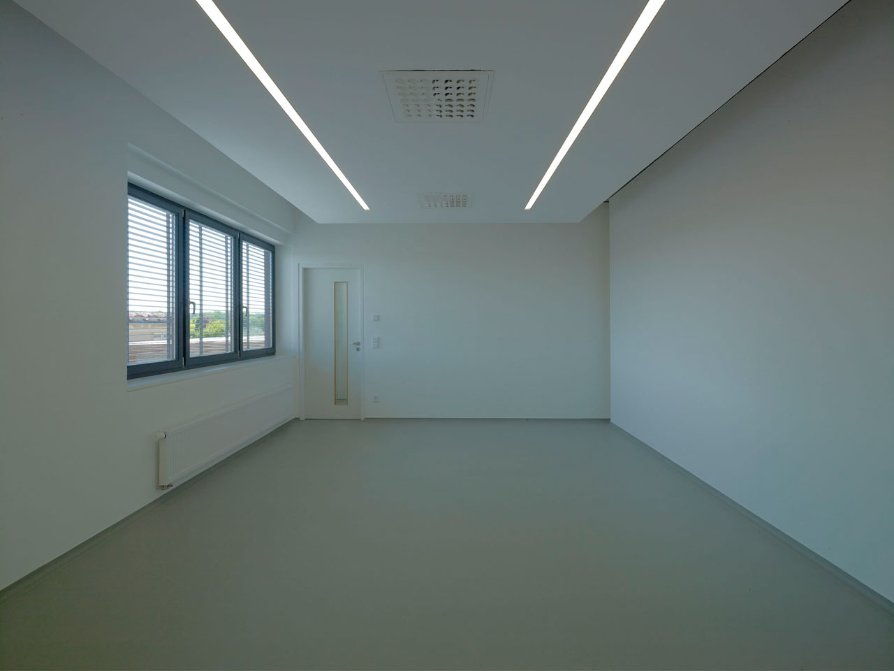 Entsprechend den zwei grundsätzlich verschiedenen Raumanforderungen in Bezug auf die technische Ausstattung und Oberflächenbeschaffenheit der Wände und Böden, liegt dem Entwurf die Idee der Zweiteilung des Gebäudes zu Grunde. Mit einer sich städtebaulich zurücknehmenden Gesamtgebäudekubatur wird damit auf die sensible Lage des Grundstückes eingegangen.