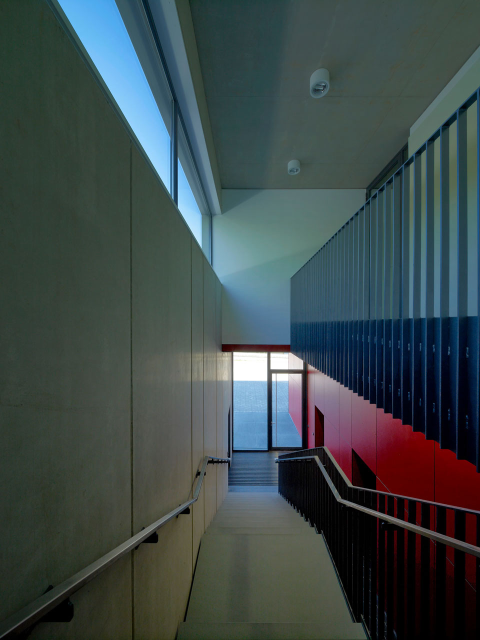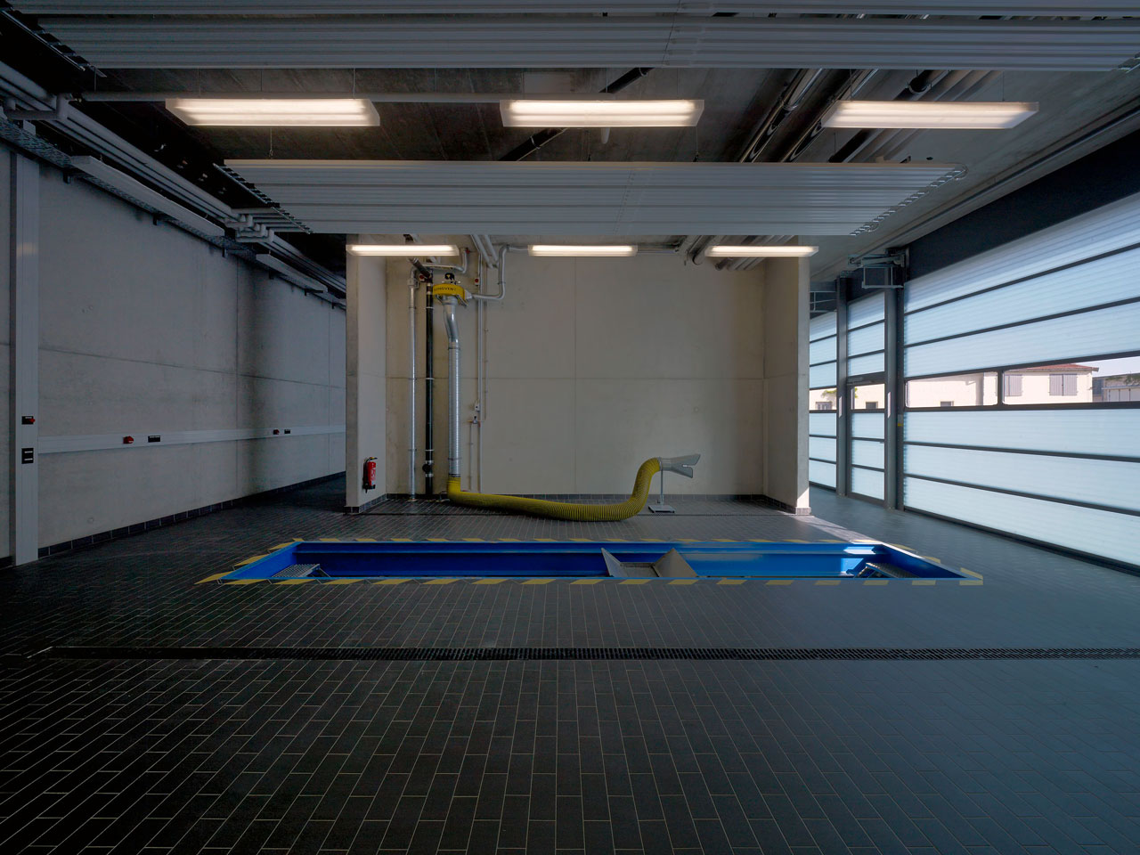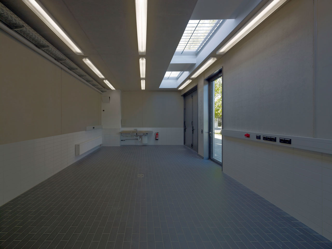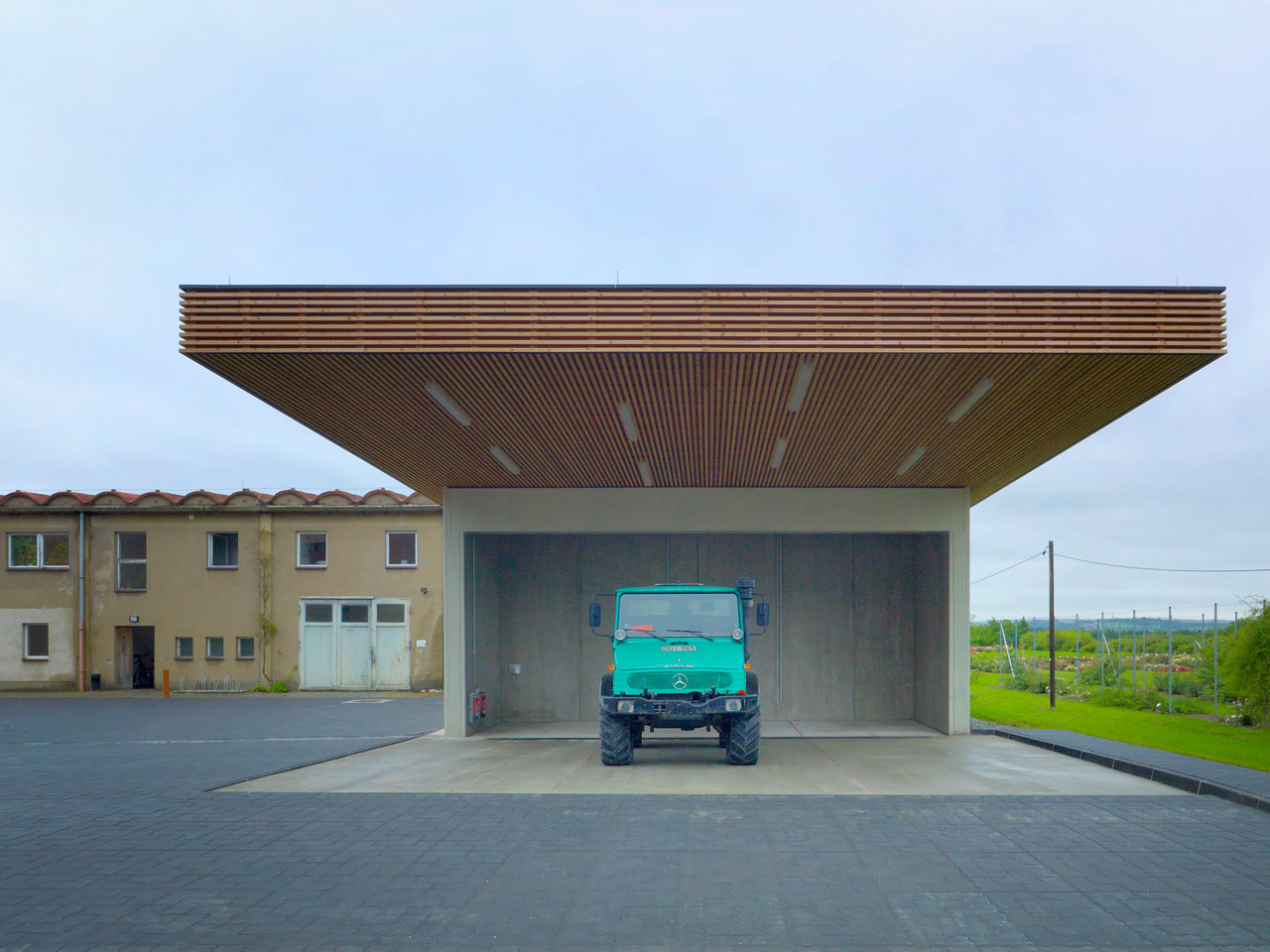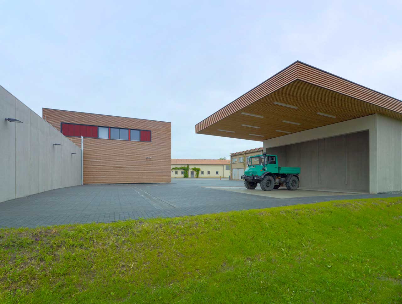 Sämtliche Räume, die direkt von außen befahrbar sein müssen sowie nur geringfügig beheizt werden sollen, sind in einem langgestreckten eingeschossigen Gebäuderiegel zusammengefasst. Dieser Baukörper schafft zusätzlich einen Hof für die Maschinen- und Traktorenpflege. Werkstatträume sowie Umkleide- und Sanitärräume, Labor- und Unterweisungsräume wurden in einem kompakten zweigeschossigen Gebäudeteil untergebracht. Das Erschließungsfoyer ist als Spange zwischen beiden Gebäudeteilen eingeschoben. Es orientiert sich zur Haupterschließungsachse des Geländes und reagiert damit unmittelbar auf die bestehenden Wegebeziehungen.