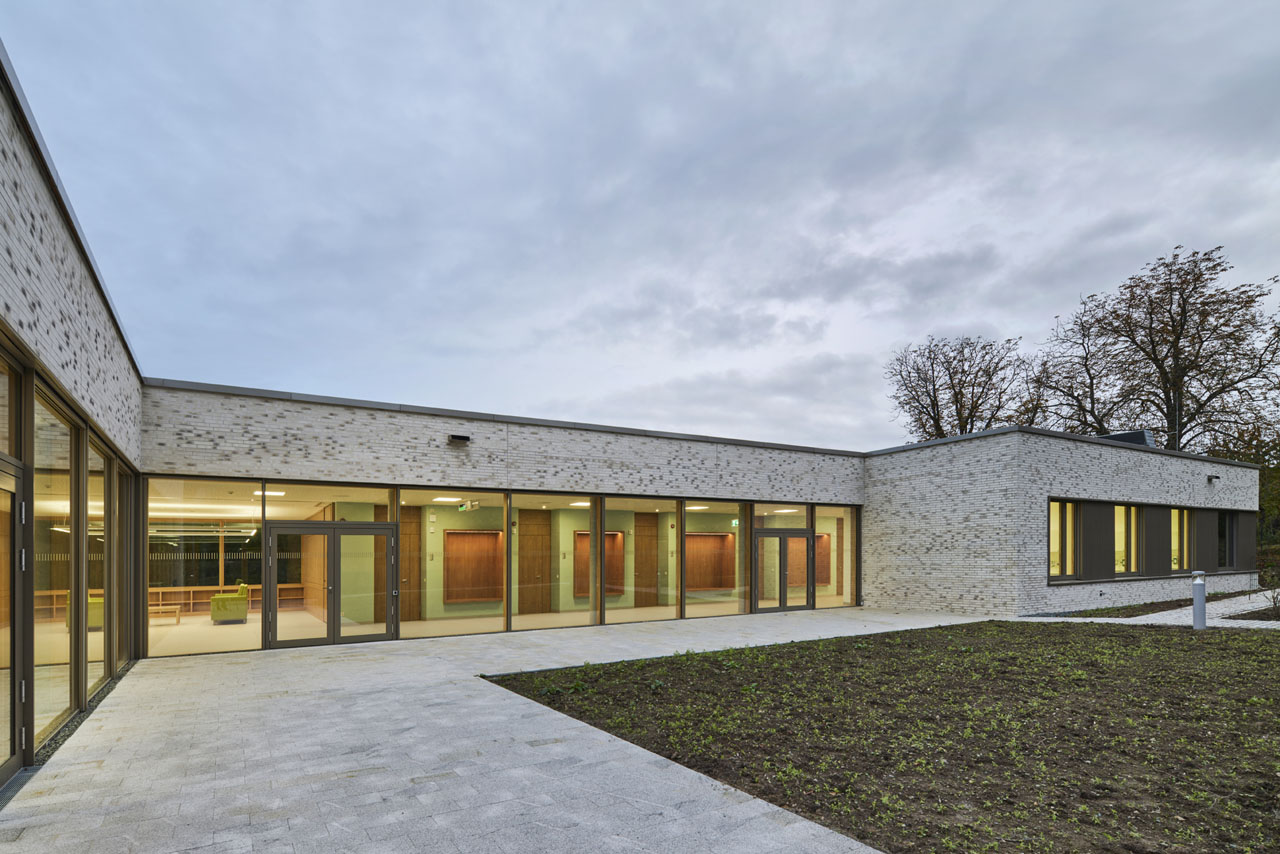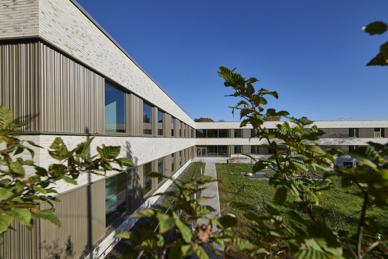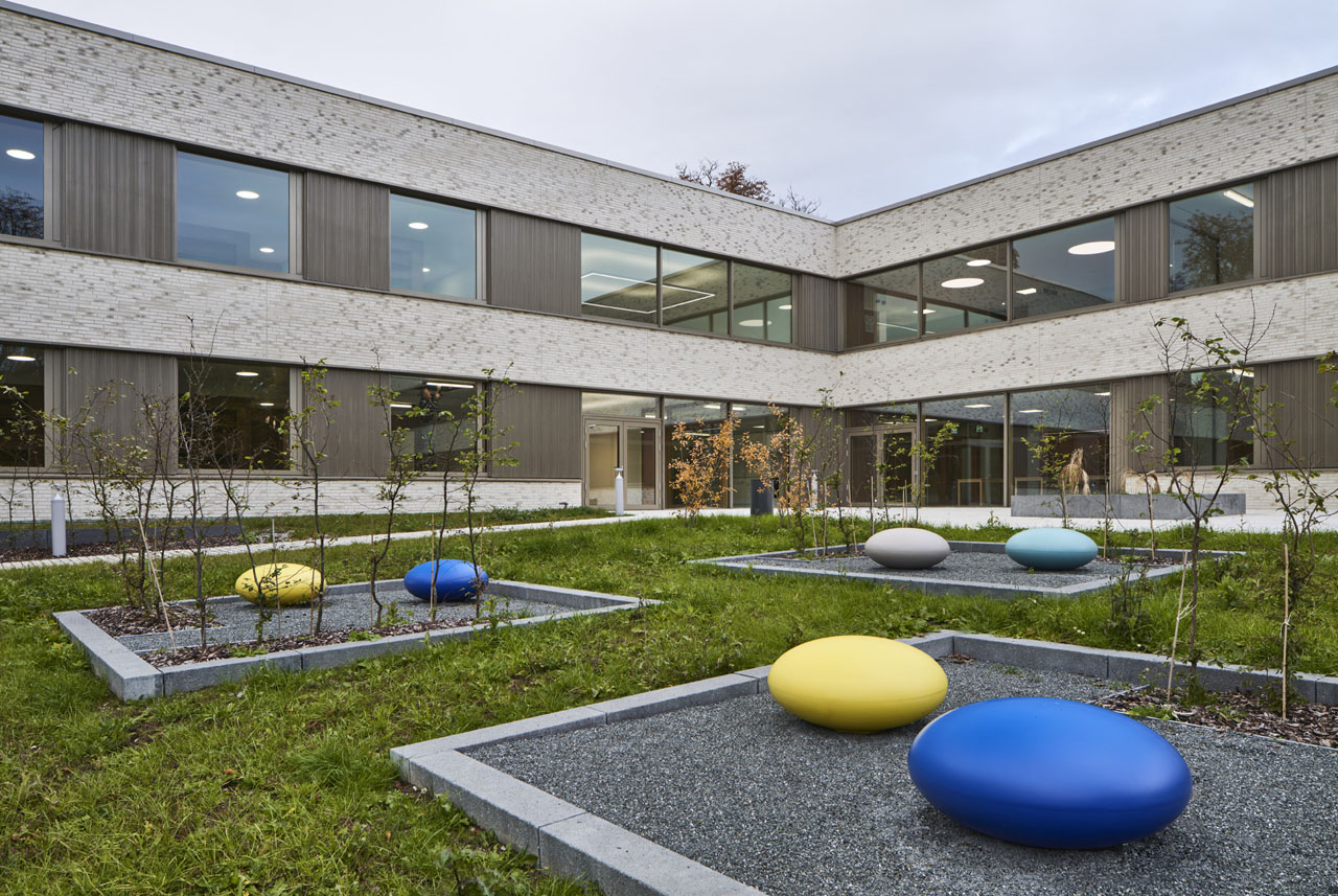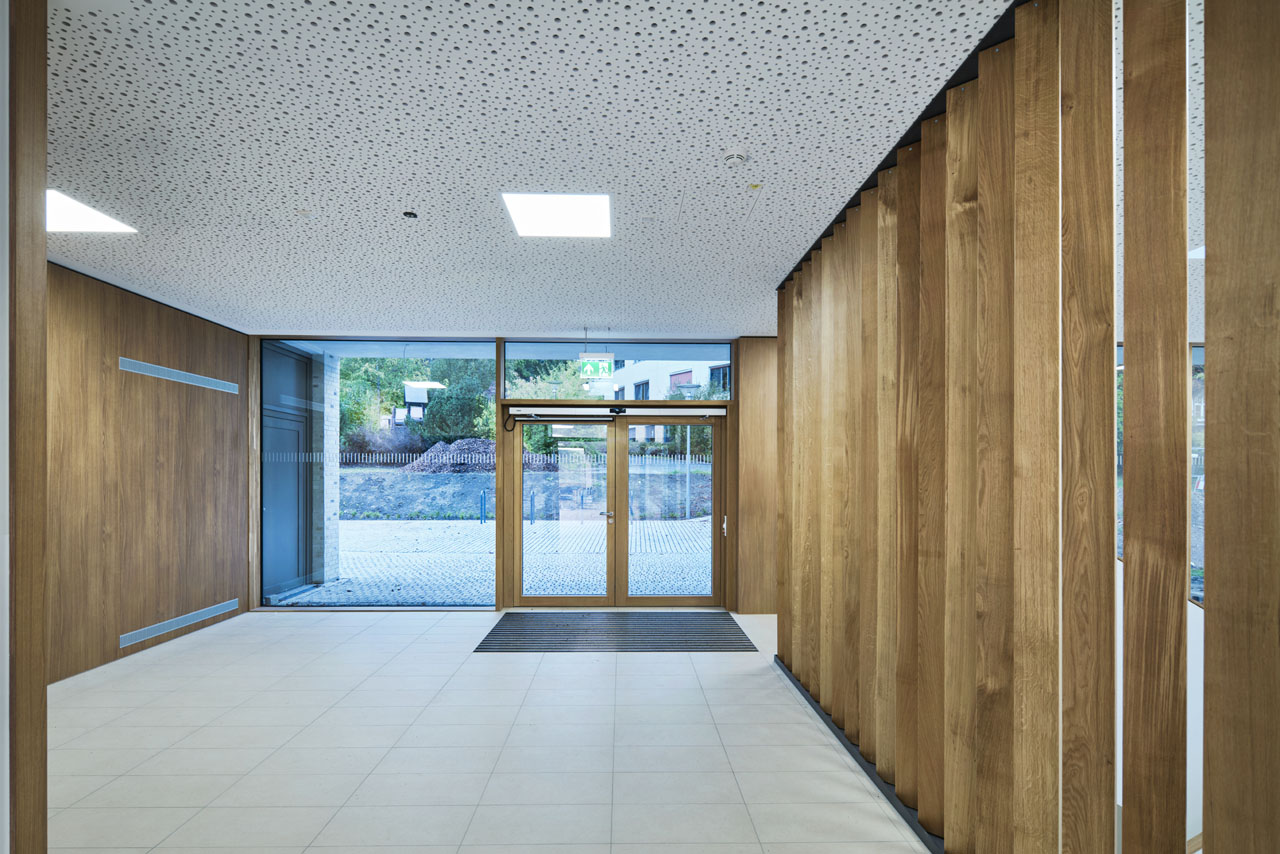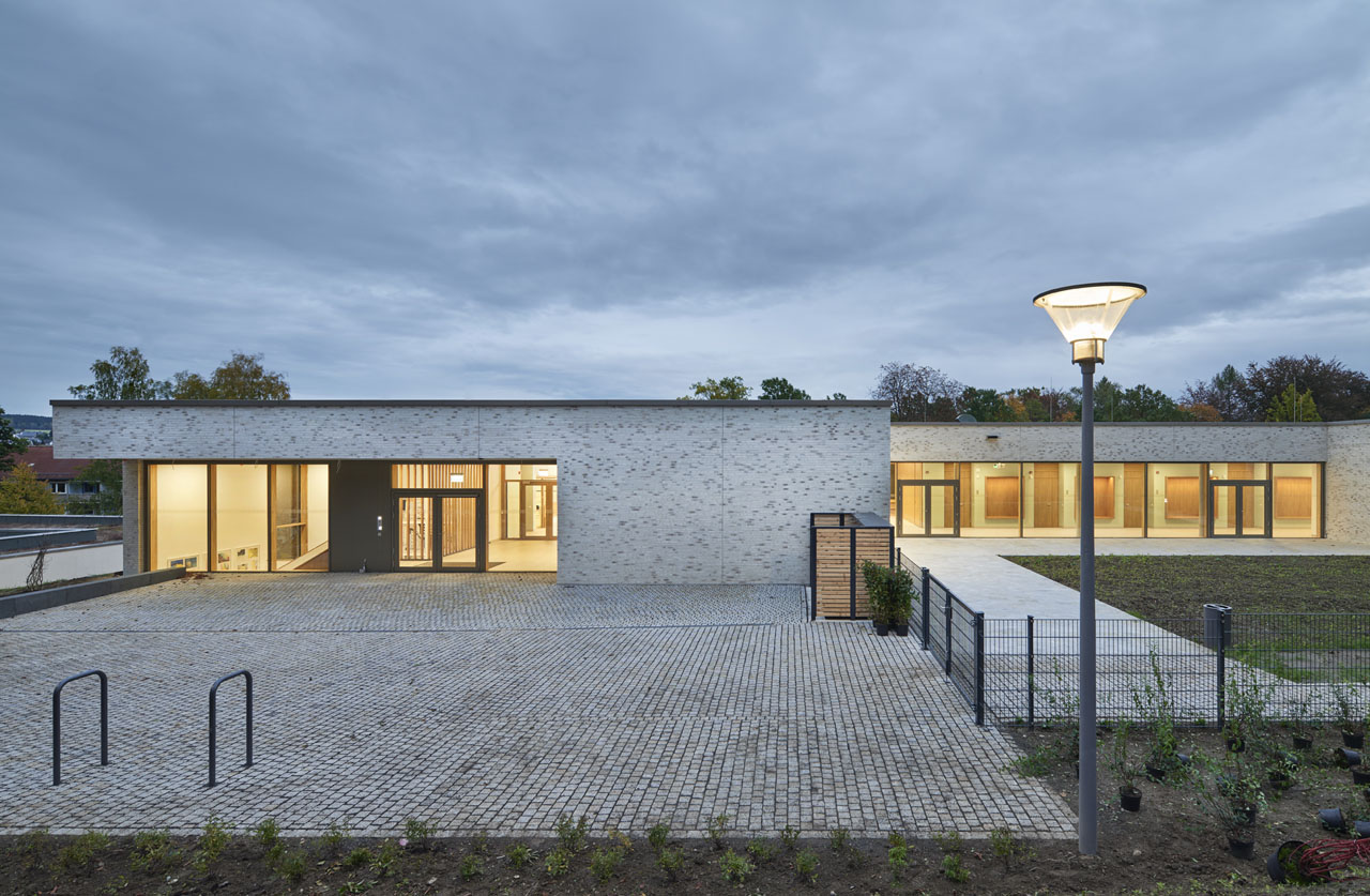 Östlich von München, im oberbayrischen Landkreis Ebersberg, liegt die Gemeinde Vaterstetten. Der zweigeschossige, fast quadratische Baukörper der Kinderkrippe mit Passivhausniveau bietet Platz für fünf Kindergruppen und rückt im Norden von der Verlängerung des Birkenwegs ab, um Platz für den ruhenden Verkehr zu schaffen.