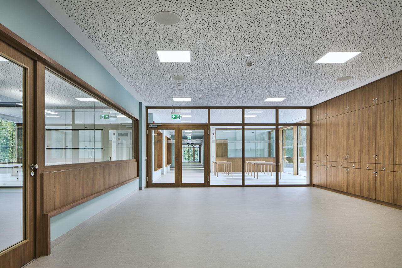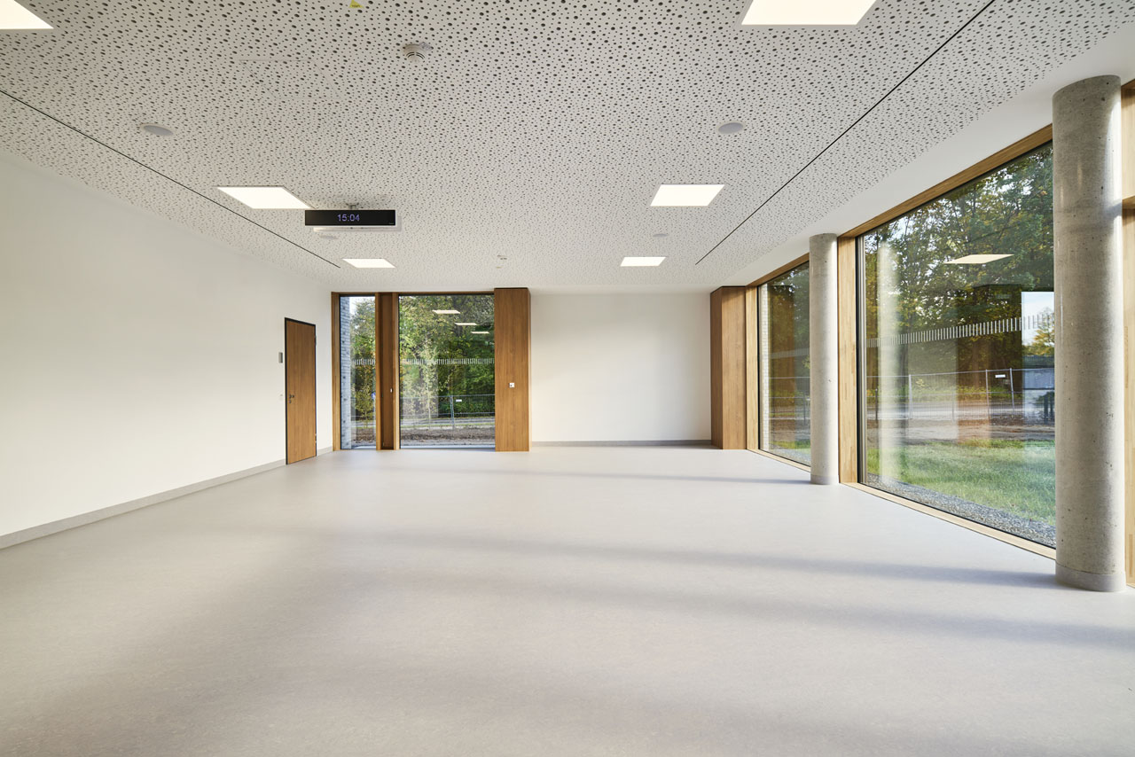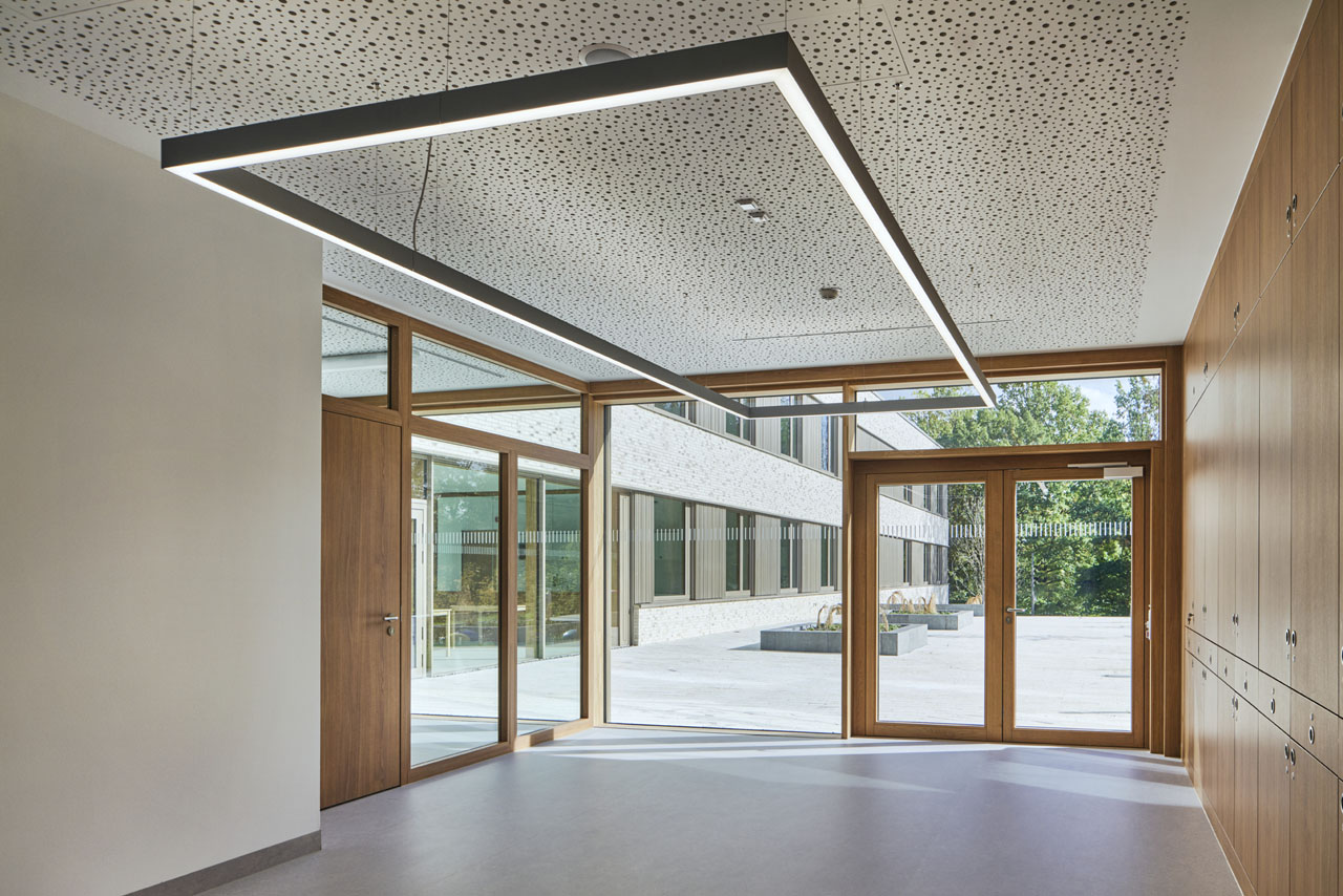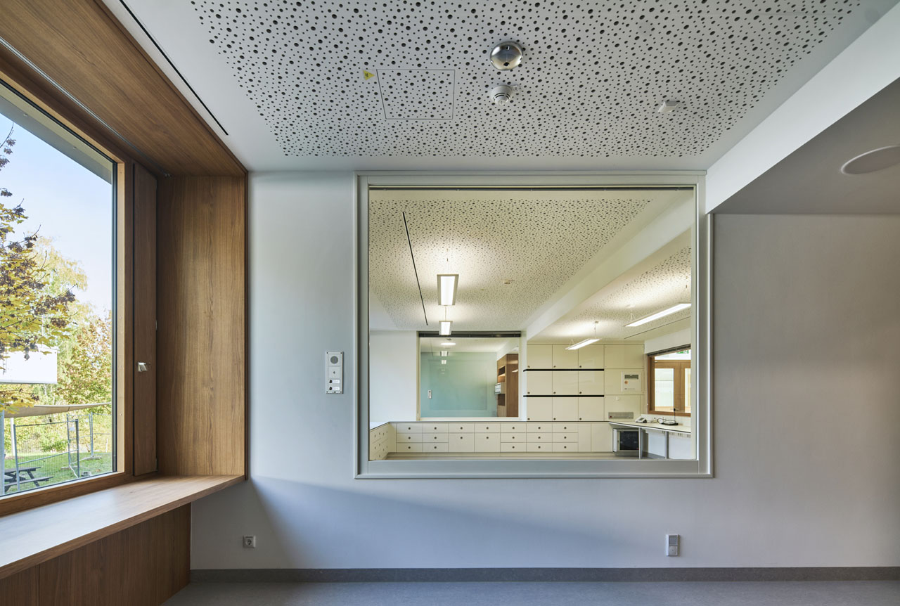 Östlich von München, im oberbayrischen Landkreis Ebersberg, liegt die Gemeinde Vaterstetten. Der zweigeschossige, fast quadratische Baukörper der Kinderkrippe mit Passivhausniveau bietet Platz für fünf Kindergruppen und rückt im Norden von der Verlängerung des Birkenwegs ab, um Platz für den ruhenden Verkehr zu schaffen.