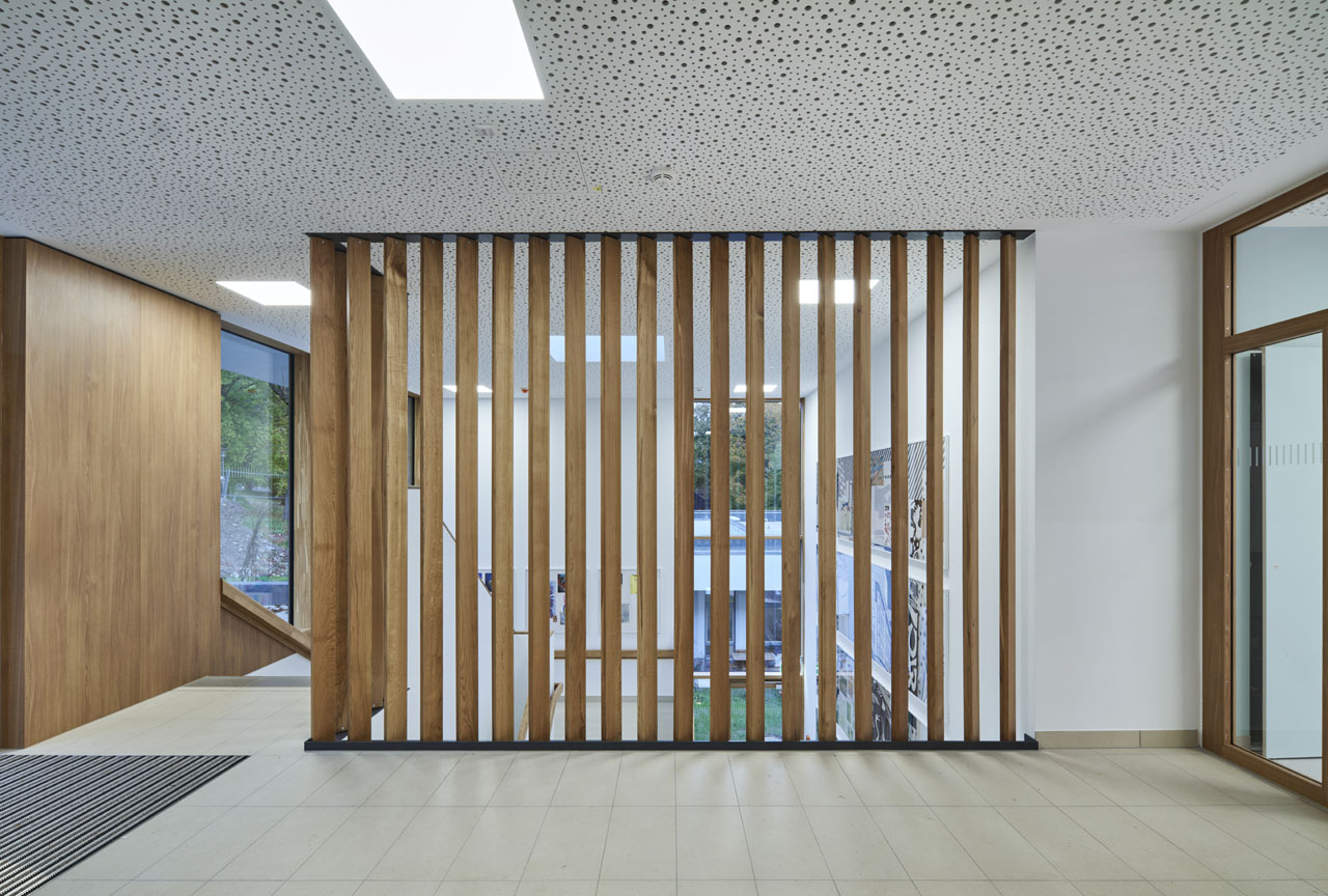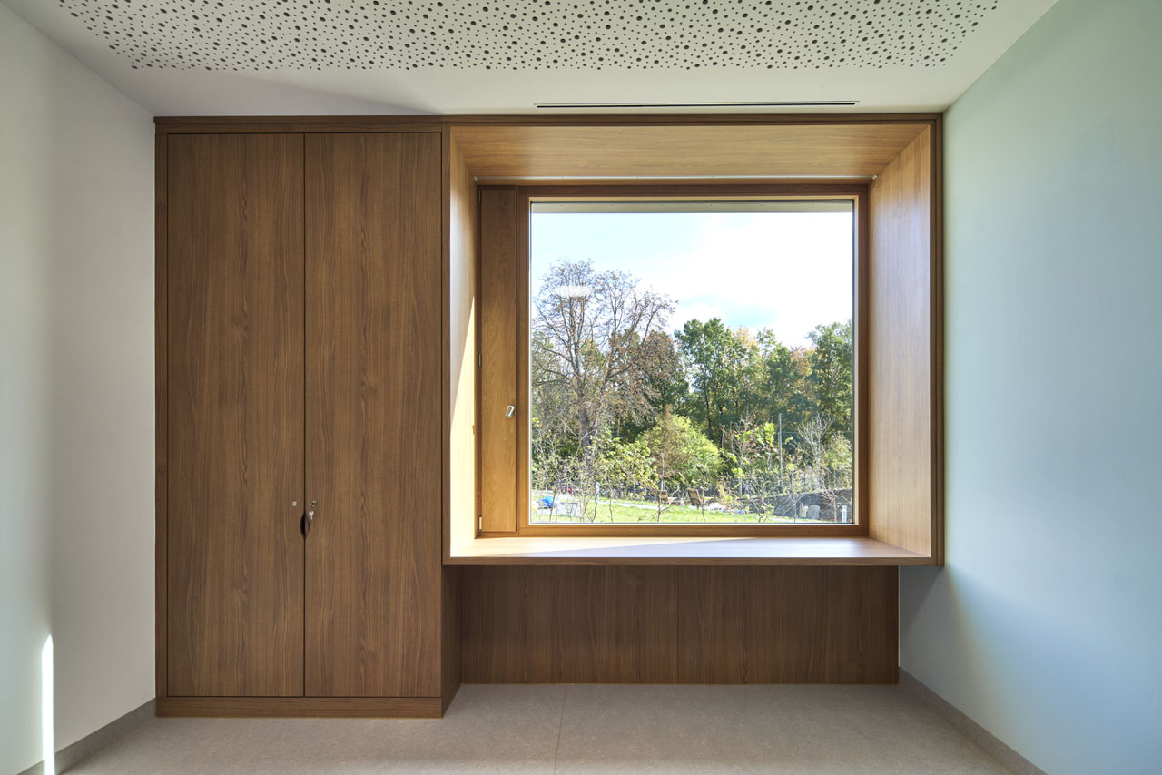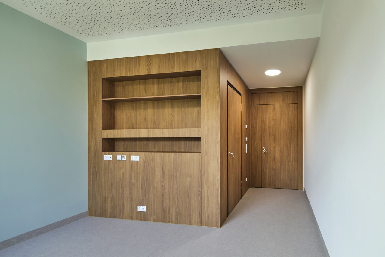 Im neuen Baukörper sind zukünftig zwei Stationen untergebracht. Im Erdgeschoss die Station A (A10) – Erwachsenenpsychiatrie und im 1. Untergeschoss die Station B (B10) die Kinder- und Jugendpsychiatrie. Beide Stationen erhalten einen eigenen Gartenbereich, welche sich direkt an die jeweiligen Stationen anschließen. Die Hanglage und die Baukörperstruktur ermöglichen die optische und räumliche Trennung der beiden Gärten. Die Erschließung beider Stationen erfolgt über ein gemeinsames Foyer. Der Eingang wird mit einer Überdachung markant gestaltet. Die Freifläche im Eingangsbereich zwischen Ärztehaus und Neubau ist als Parkbereich für Fahrzeuge und Fahrräder vorgesehen.