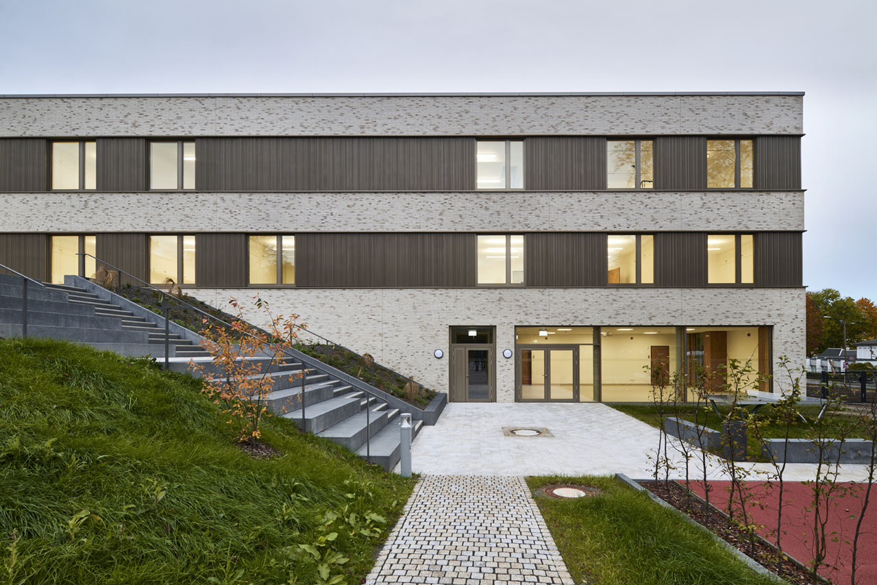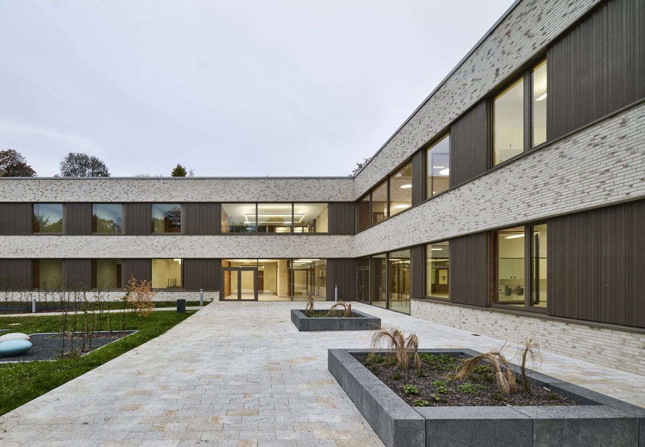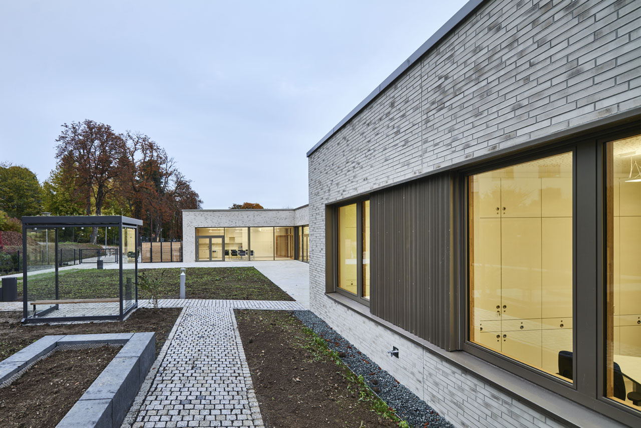 Der Neubau fügt sich in die vorhandenen Baustrukturen der historischen Anlage des Krankenhauses Rodewisch ein. Die ortstypische pavillonartige Bebauung wird weitergeführt und bettet das Gebäude in die bestehende Grünanlage ein. Der Gebäudekörper mit zwei Voll- und einem Halbgeschoss wird so in die Hanglage eingelassen, dass vom Eingang her nur ein Vollgeschoss ersichtlich ist. Das L-förmige Gebäude befindet sich zwischen dem Wohnhaus B19 und der neuen „Zentrale Ergotherapie“ B20. Ein direkter Zugang an das Hauptwegenetz des Krankenhauses ist somit gegeben.