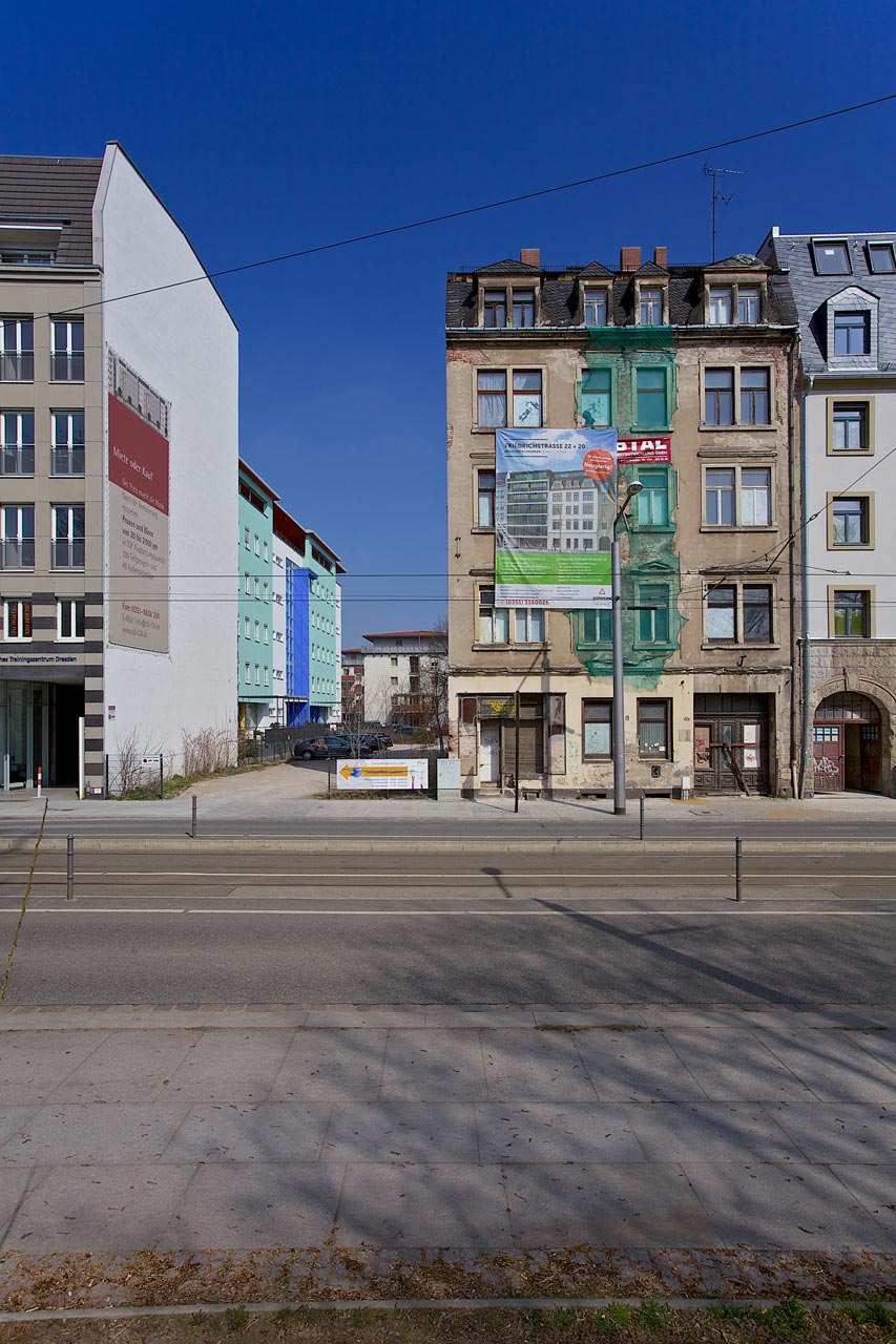Der Neubau Kiefernstraße 8 wurde für eine Baugemeinschaft errichtet. Das Grundstück liegt in Nachbarschaft zu einem der drei letzten Gründerzeithäuser auf der Kiefernstraße die den Bombenangriff auf Dresden überstanden haben.